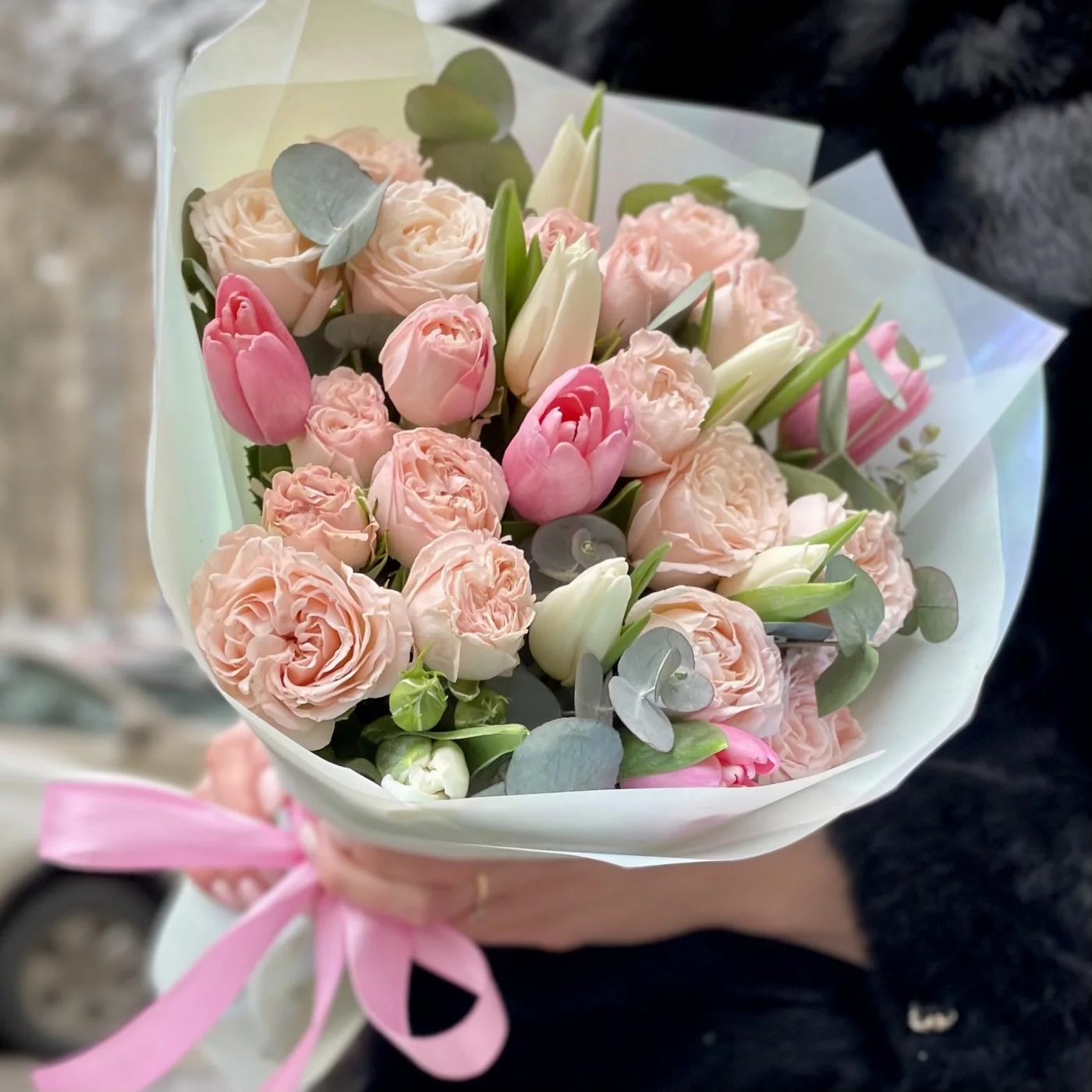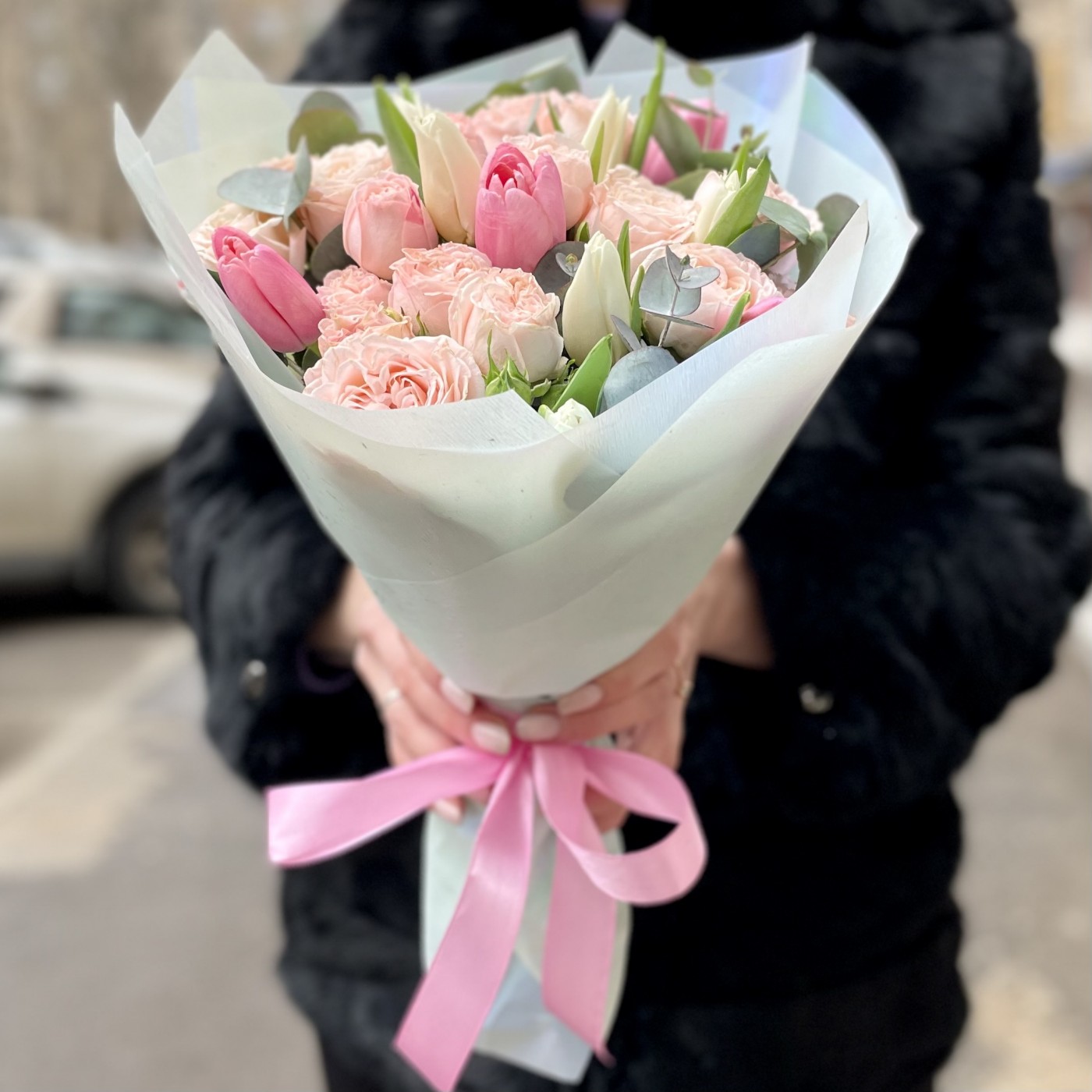 Весенний букет Ты моя нежная. Прекрасное сочетание пионовидных роз и ароматных тюльпанов. Сделай приятный сюрприз своим родным и близким.