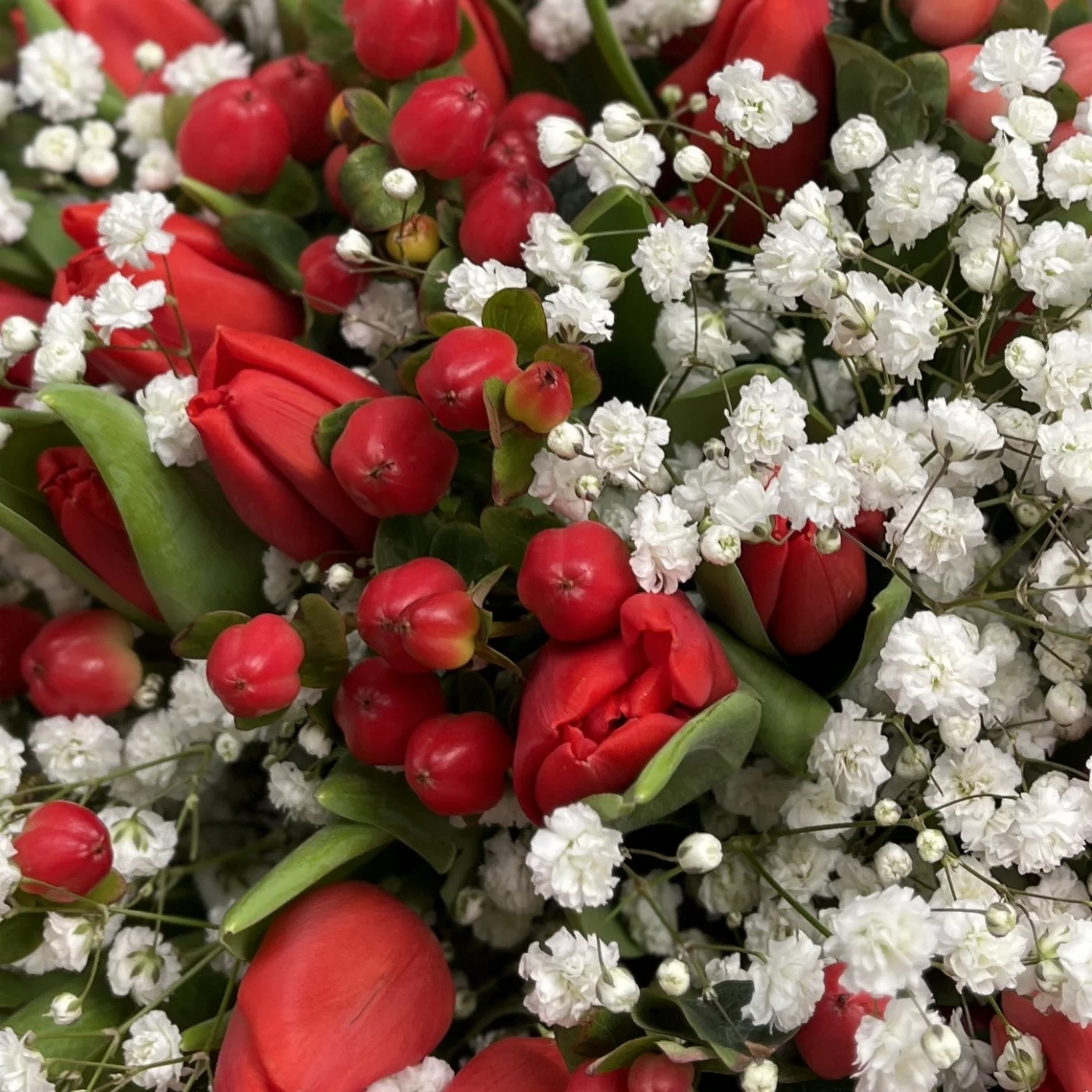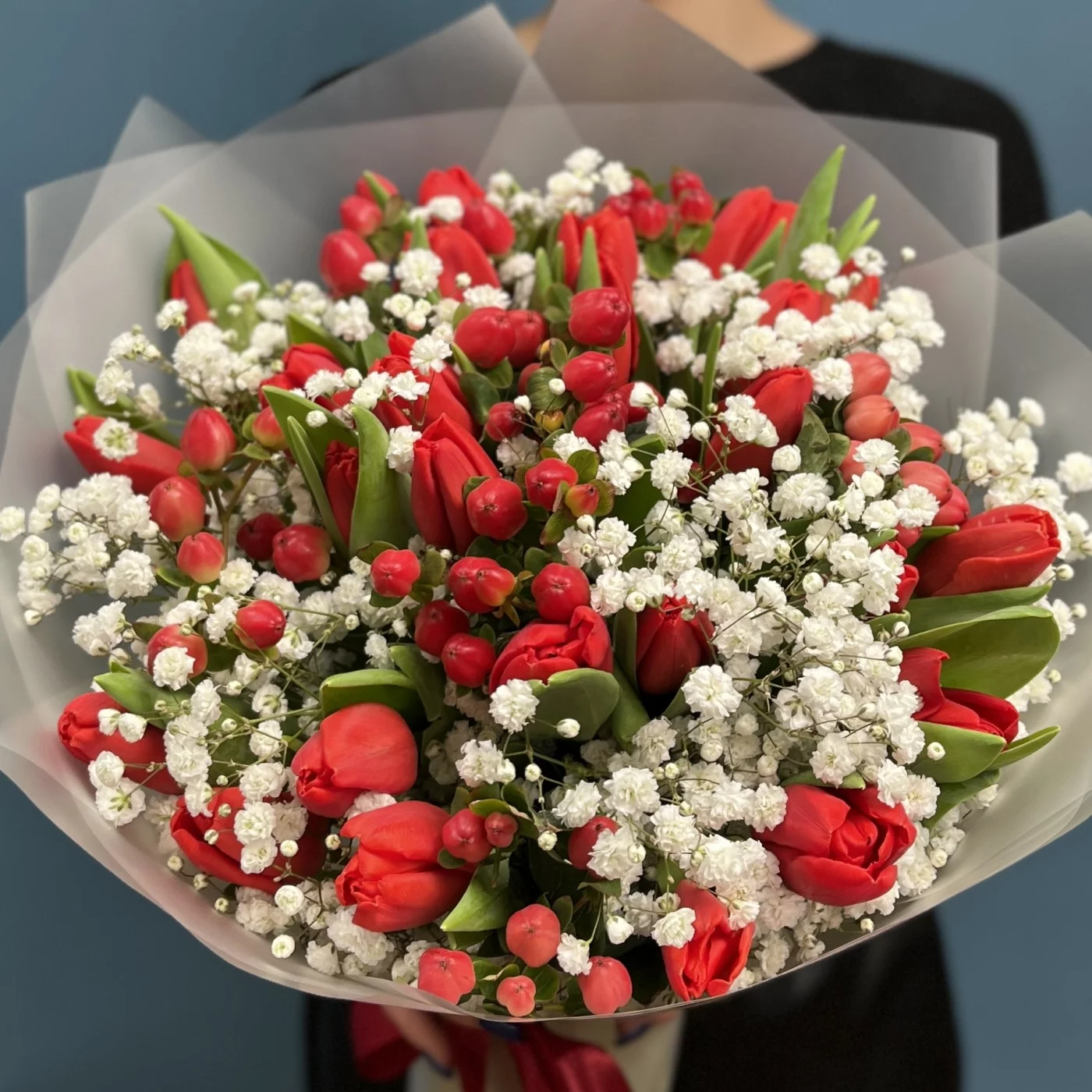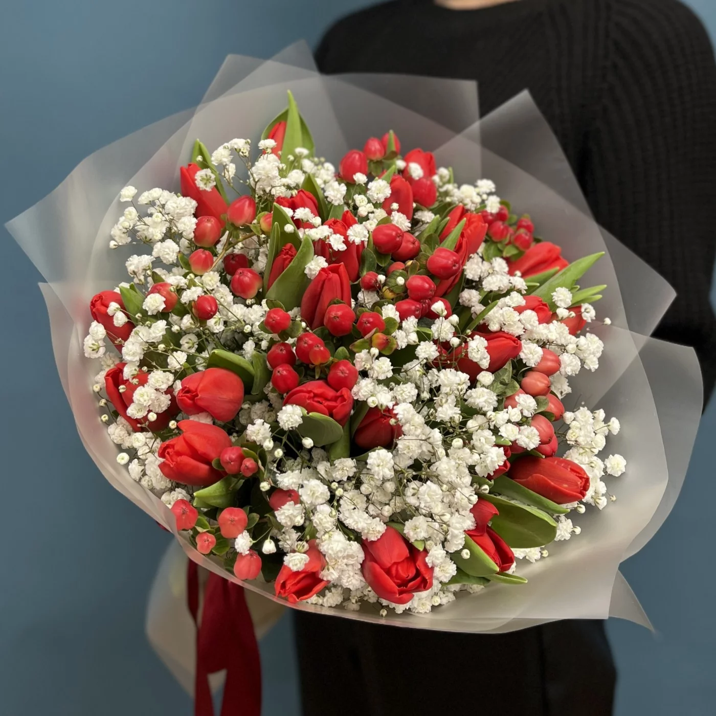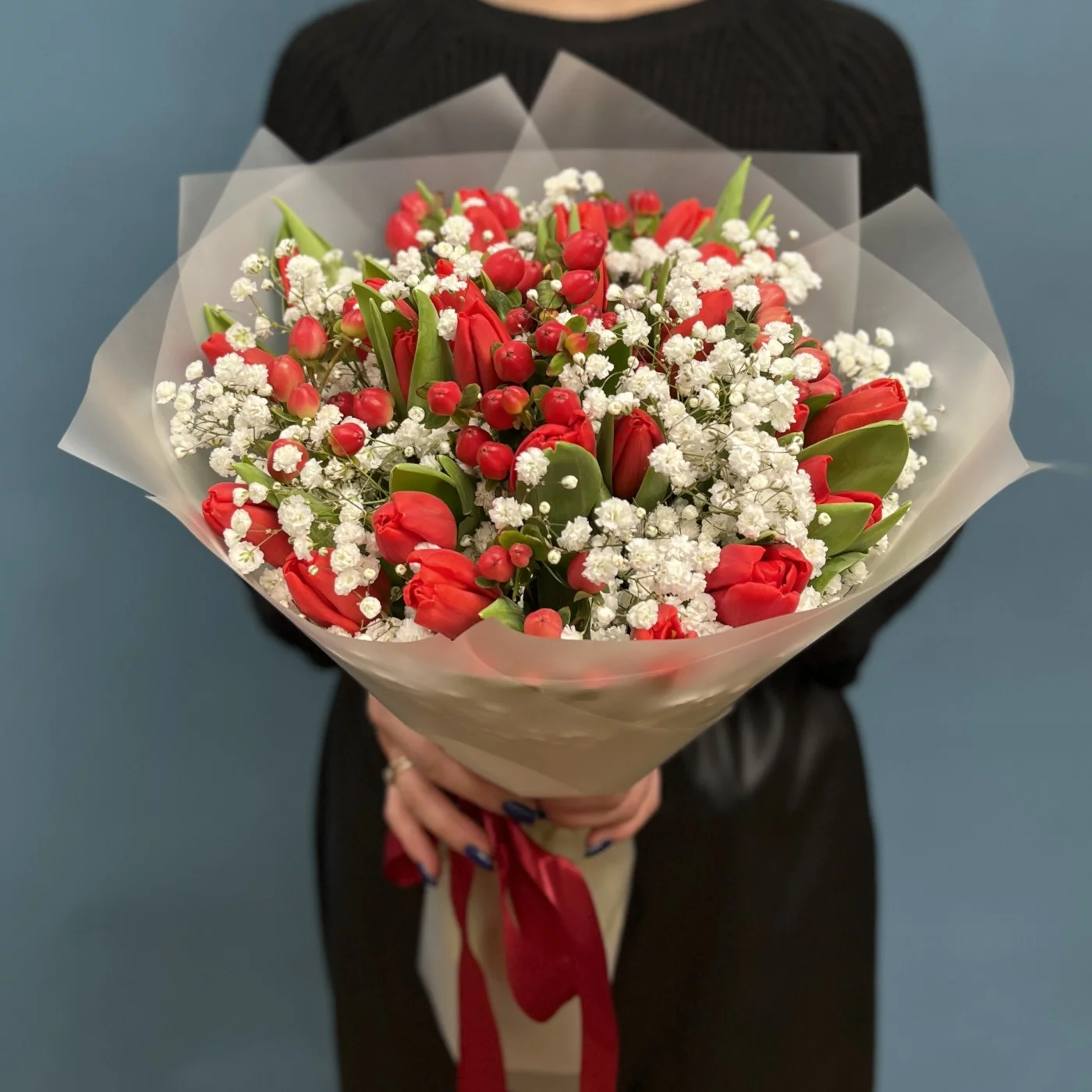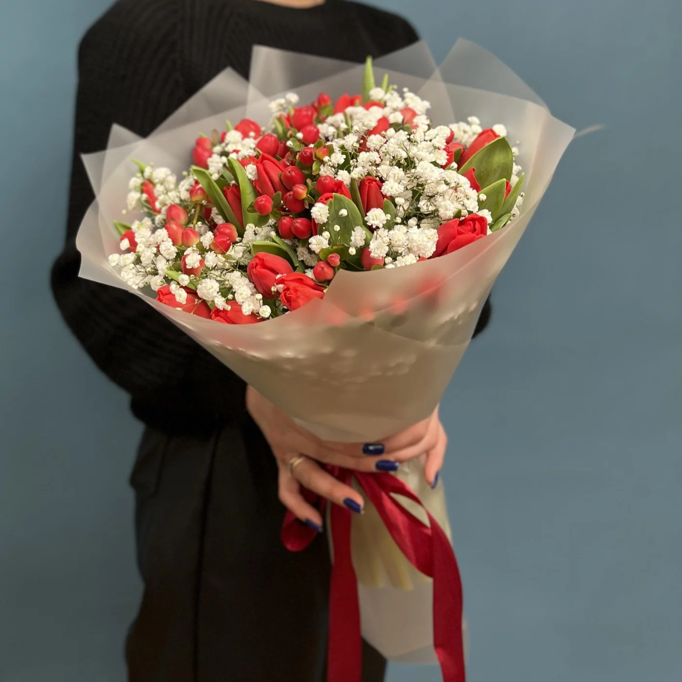 Яркий эффектный букет с тюльпанами создан очаровывать с первого взгляда. Букет свежих ароматных цветов - идеальный подарок к 8 марта для любимых женщин.
