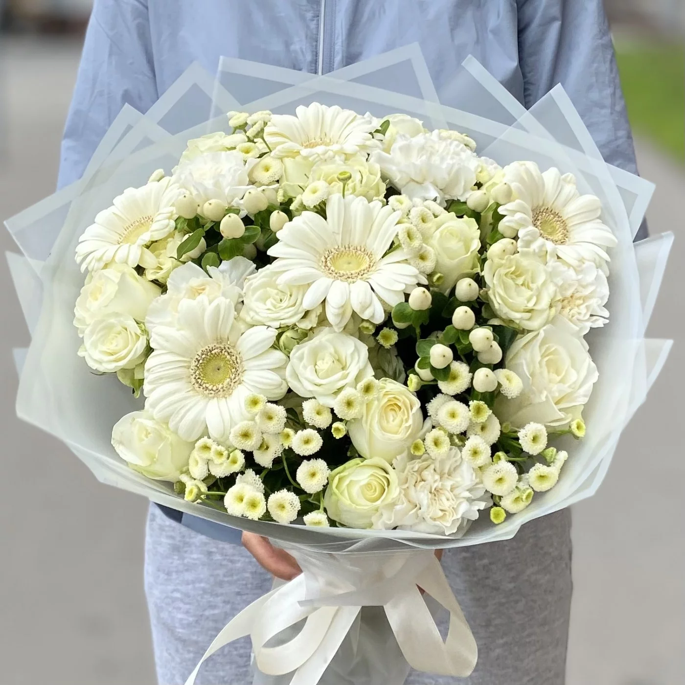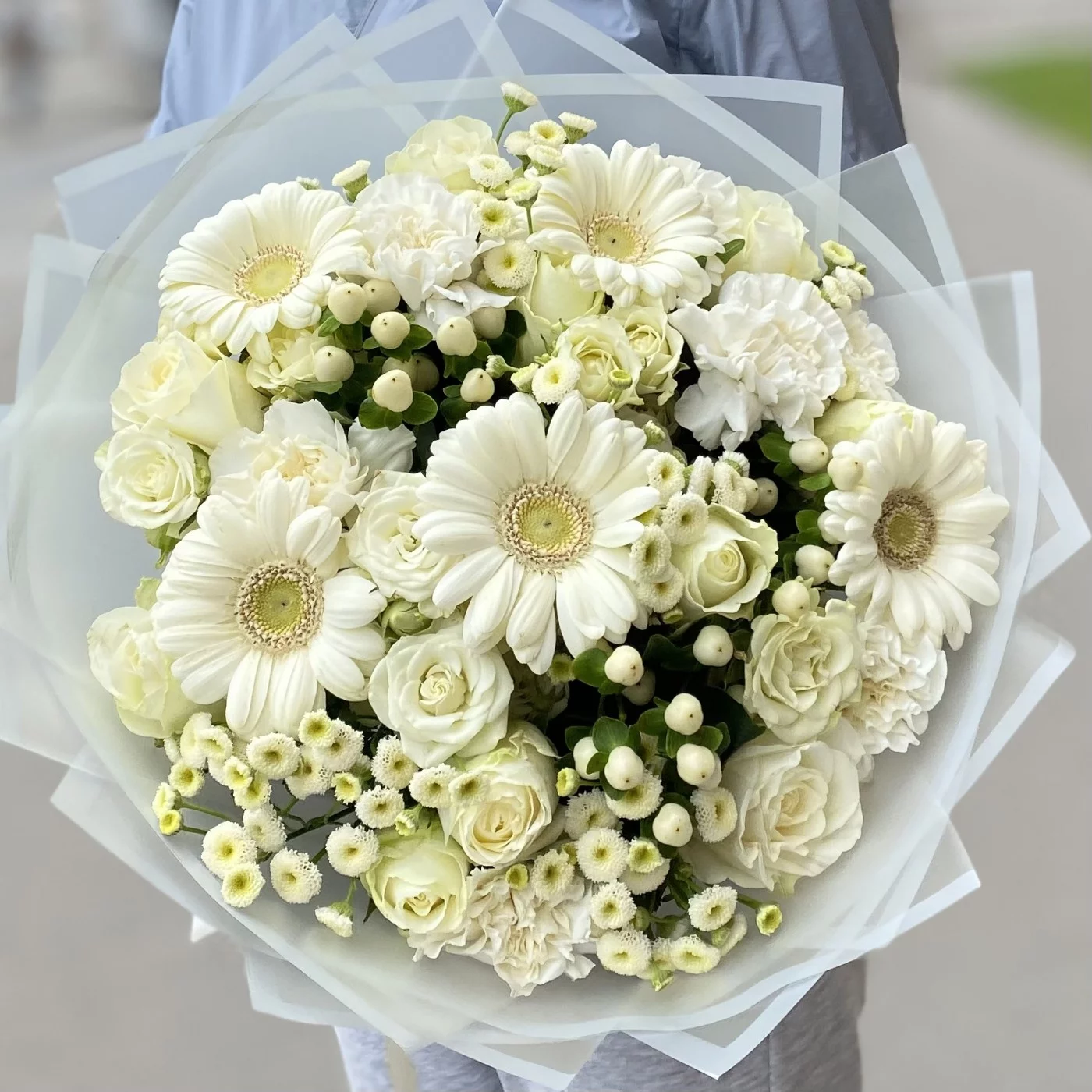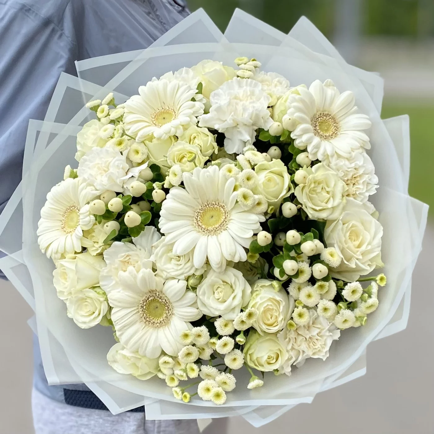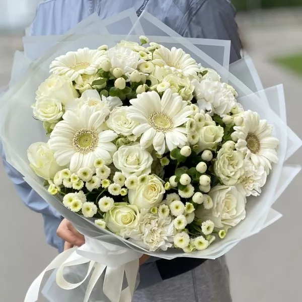 Нежный и воздушный, романтичный и завораживающий букет из белых цветов: крупные одноголовые розы в обрамлении кустовых роз Сноуфлейк, белые гвоздики и - в самом сердце букета - глянцевитые, крупные, свежие белые герберы! С ними так легко хотя бы на мгновение окунуться в атмосферу неподражаемого Парижа с его богатой историей, известными во всём мире музеями, манящими улочками и свежей утренней зеленью лип и старых вязов над древними камнями мостовых.