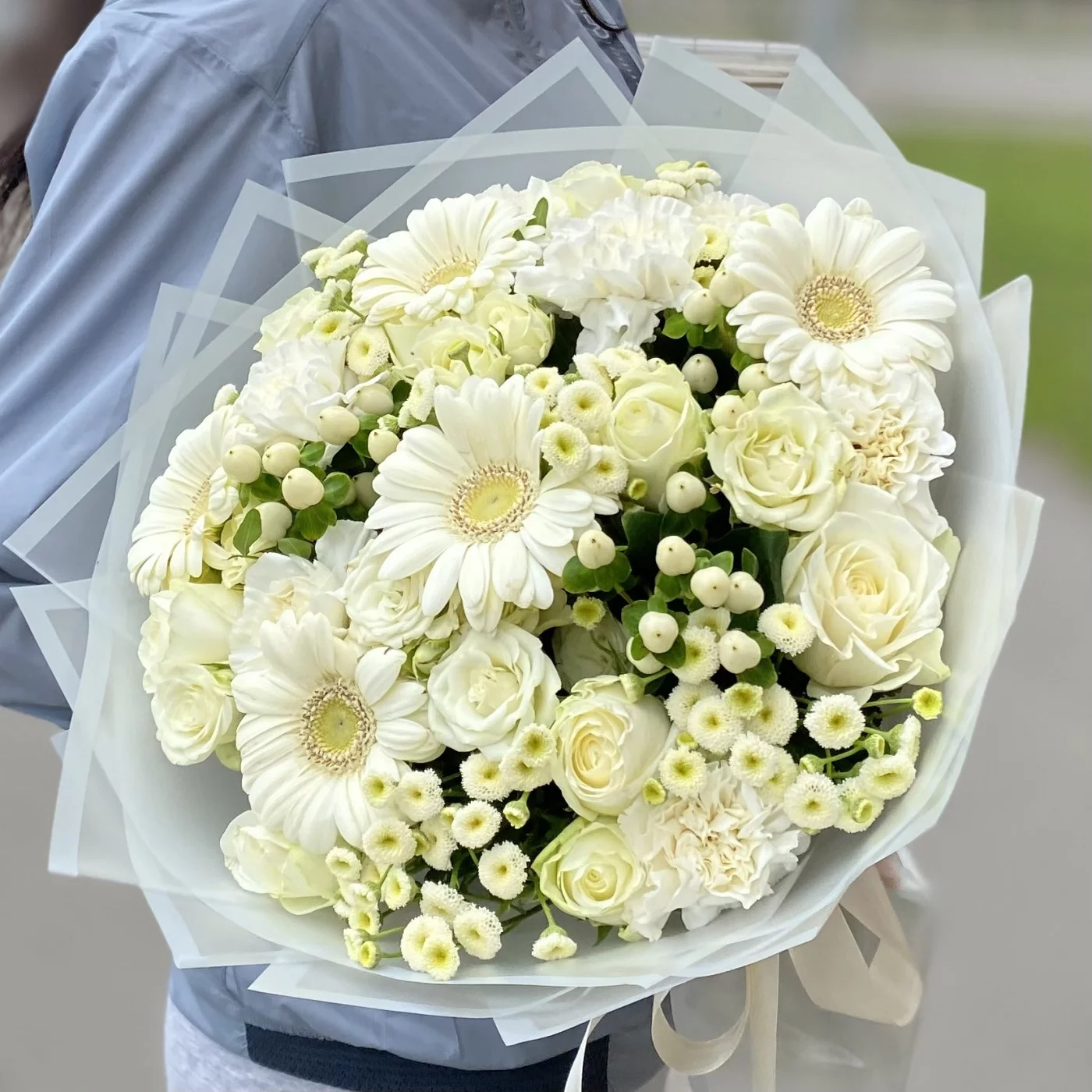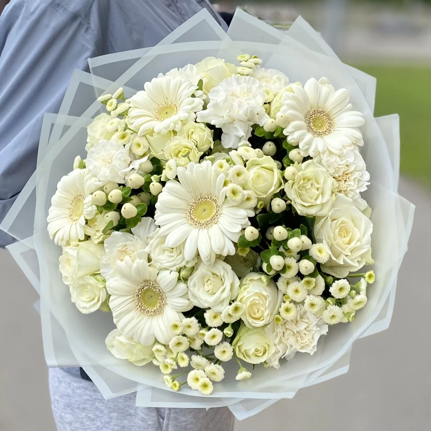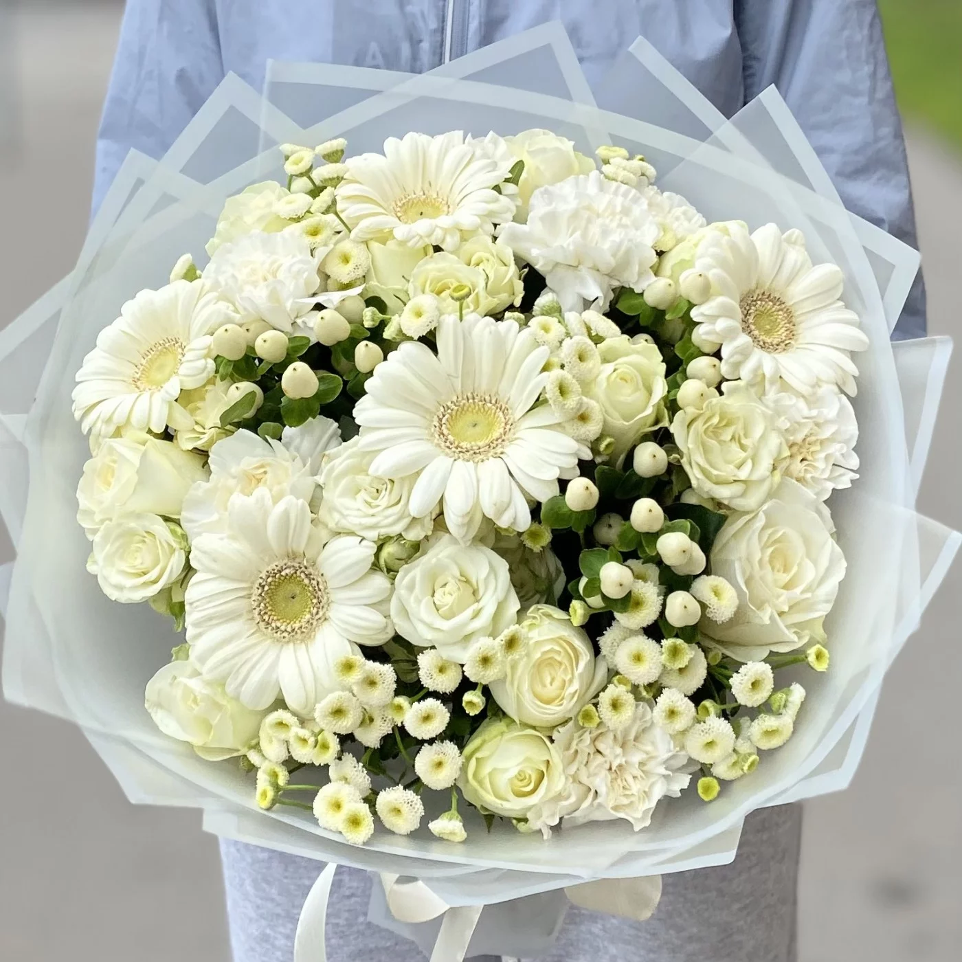 Нежный и воздушный, романтичный и завораживающий букет из белых цветов: крупные одноголовые розы в обрамлении кустовых роз Сноуфлейк, белые гвоздики и - в самом сердце букета - глянцевитые, крупные, свежие белые герберы! С ними так легко хотя бы на мгновение окунуться в атмосферу неподражаемого Парижа с его богатой историей, известными во всём мире музеями, манящими улочками и свежей утренней зеленью лип и старых вязов над древними камнями мостовых.