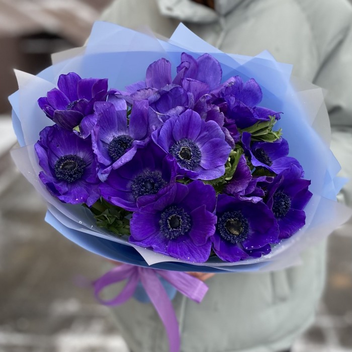 Букет из 15 ярких синих анемонов станет прекрасным дополнением к подарку.