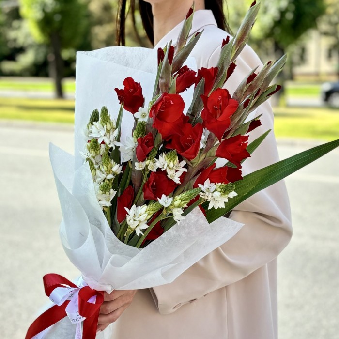 Яркий букет красными гладиолусами и орнитагалум, станет идеальным презентом к 1 сентября!