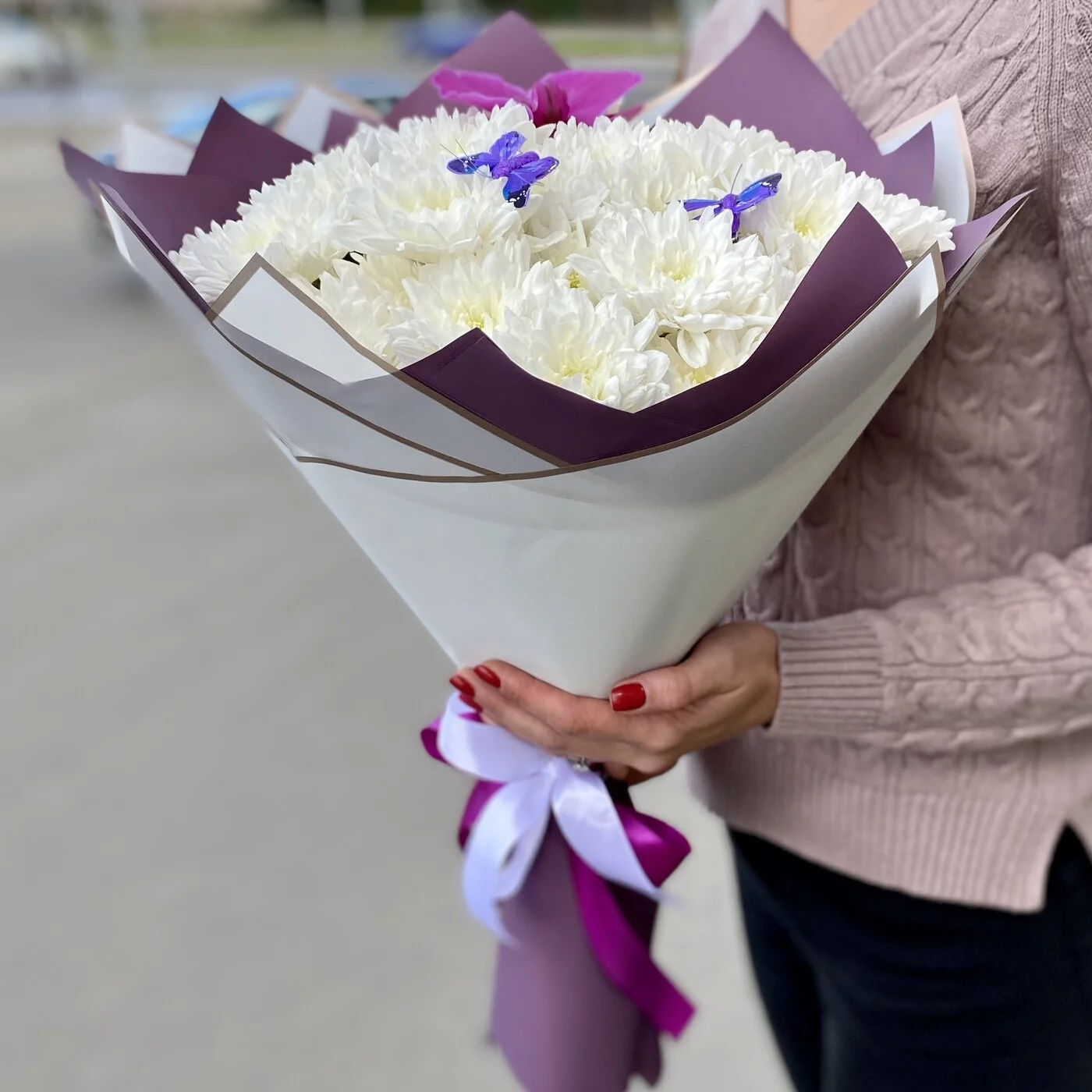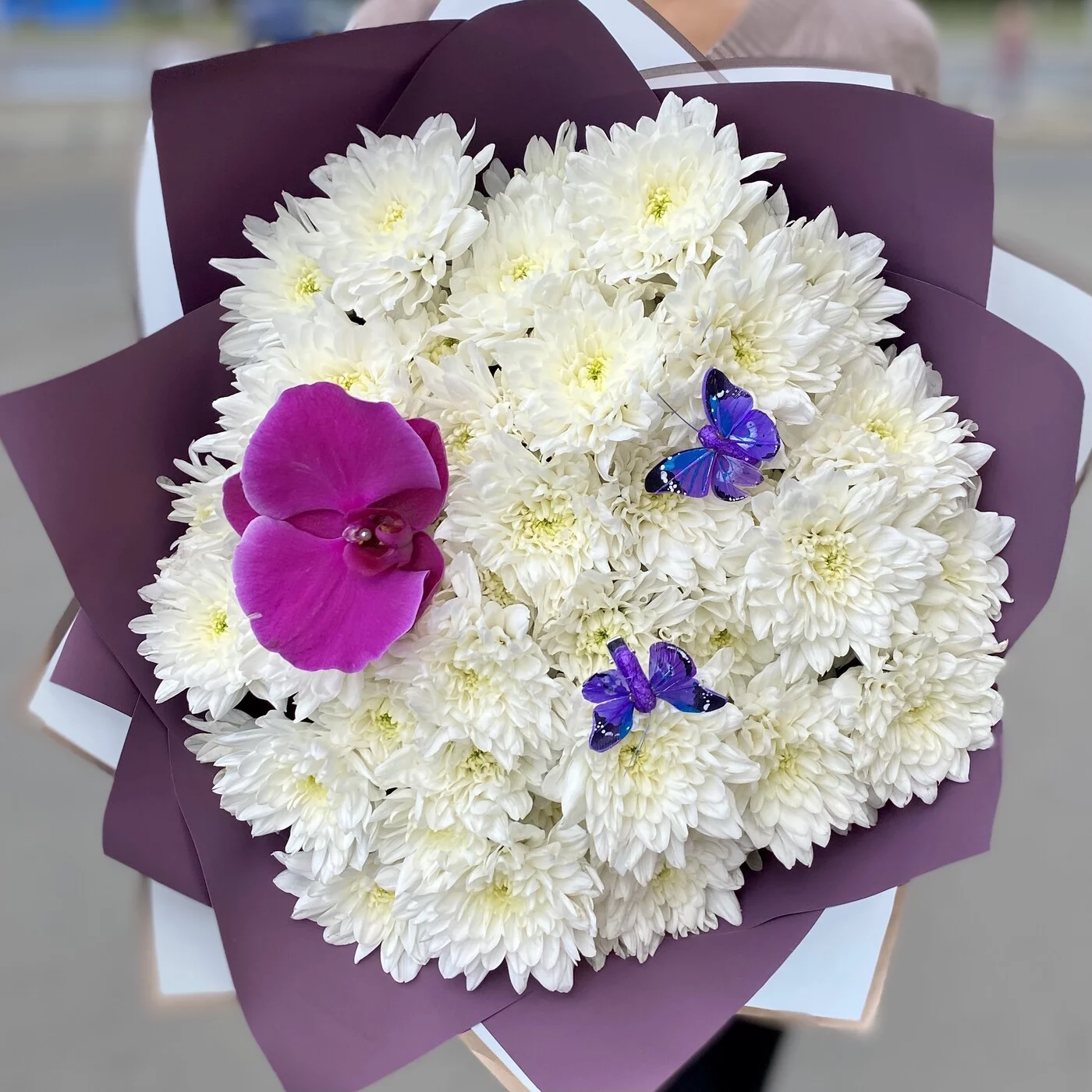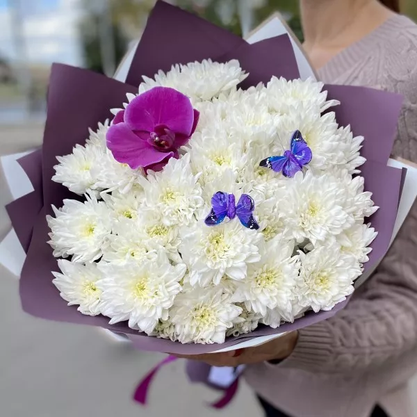 Мы предлагаем Вам приобрести букет из хризантем, украшенный кокетливой экзотической орхидеей и очаровательными бабочками.