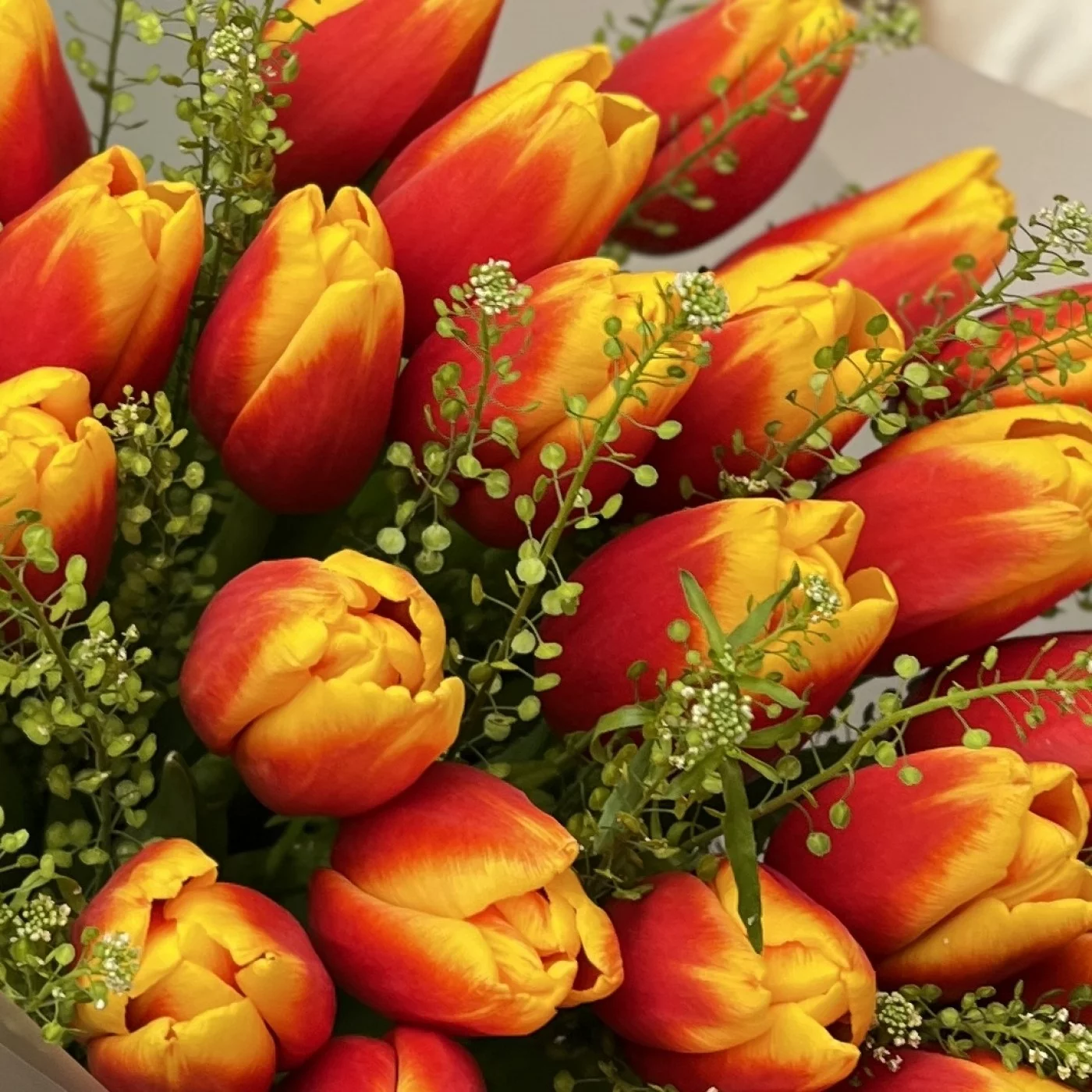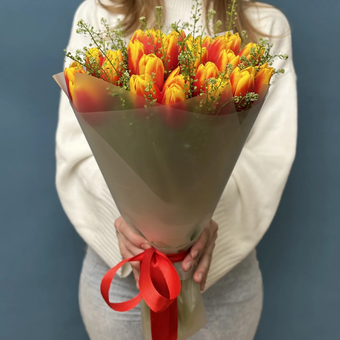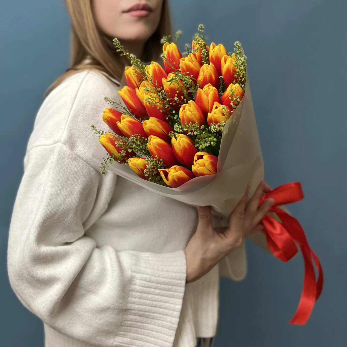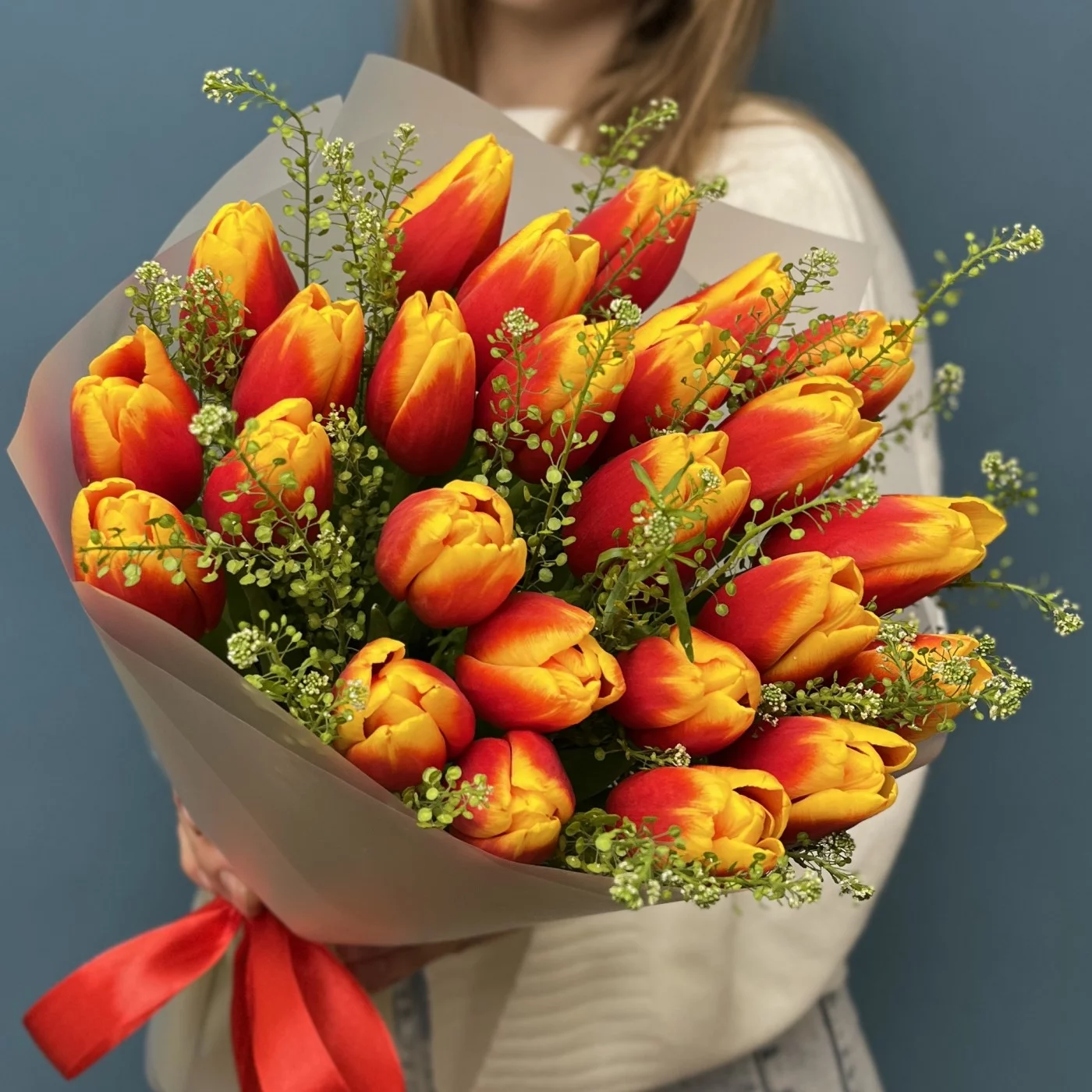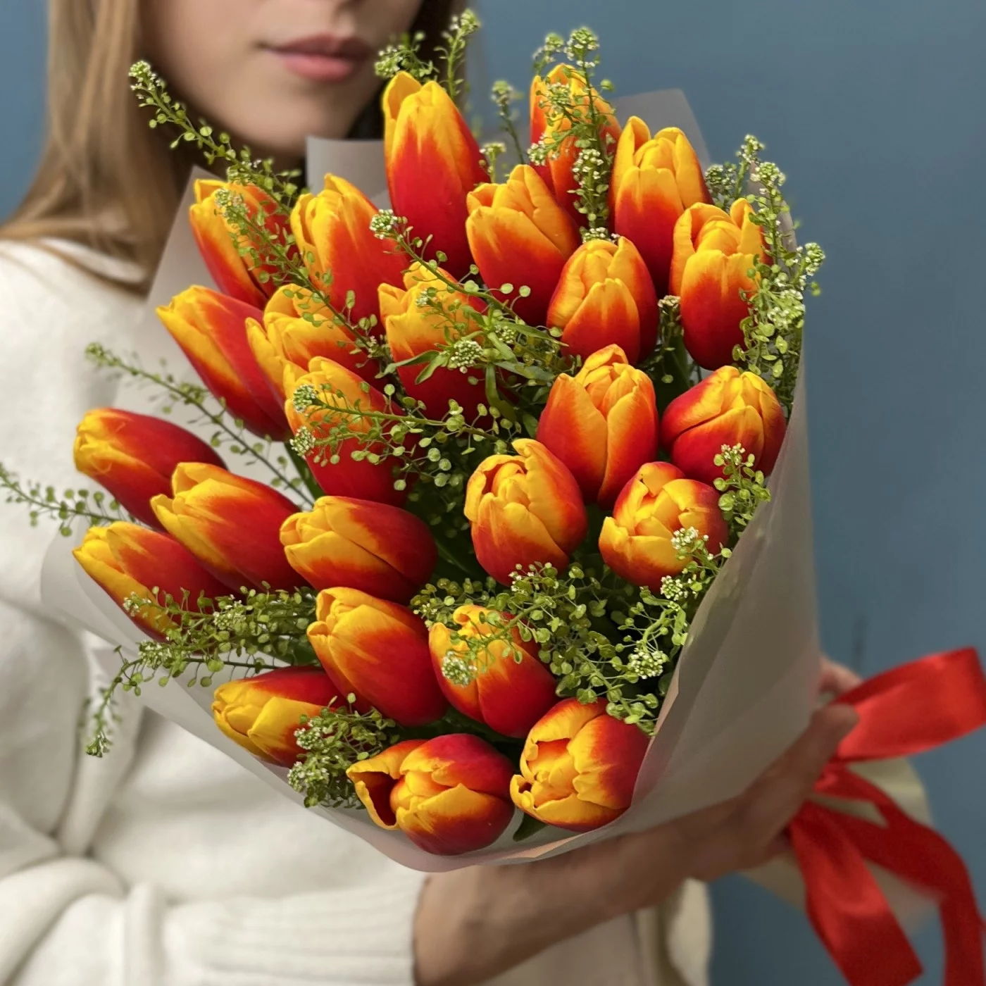 Яркий весенний букет с тюльпанами создан очаровывать с первого взгляда. Букет свежих ароматных цветов - идеальный подарок к 8 марта.