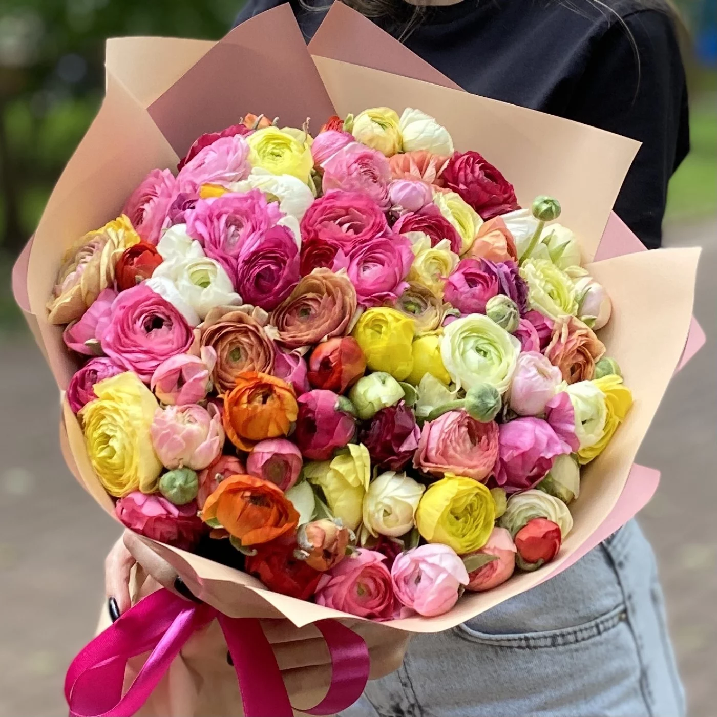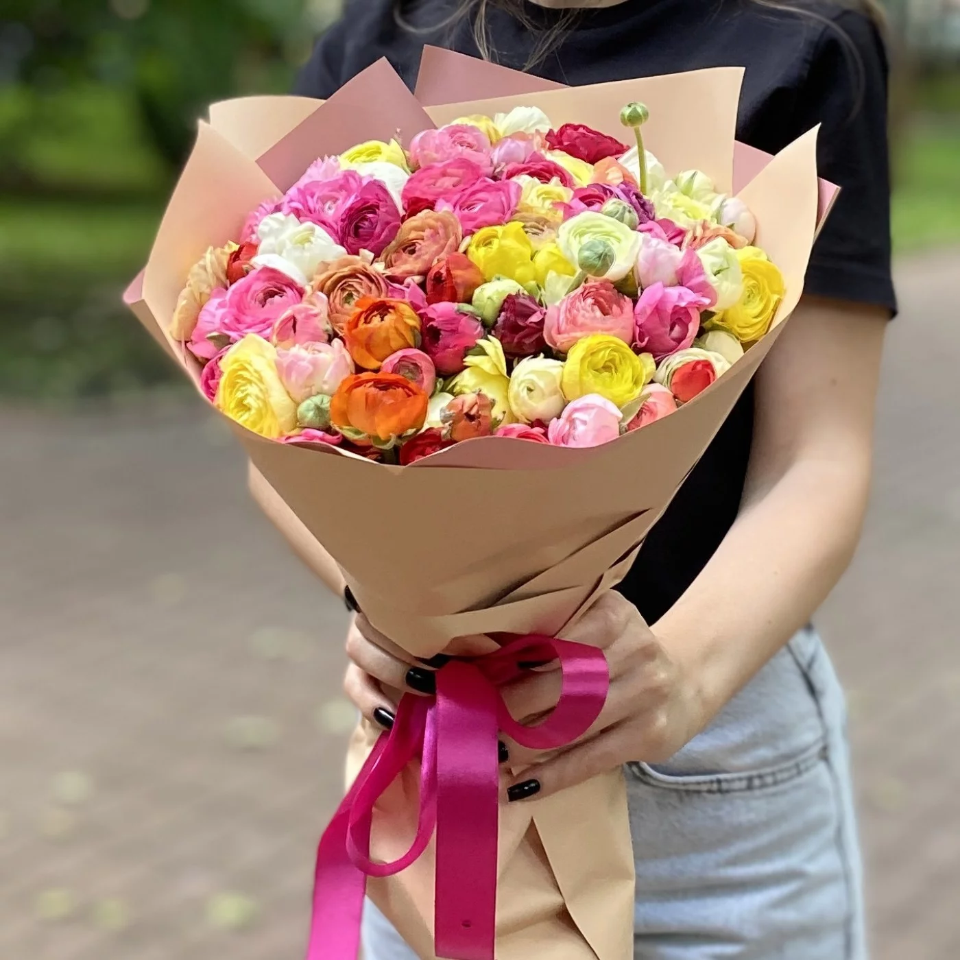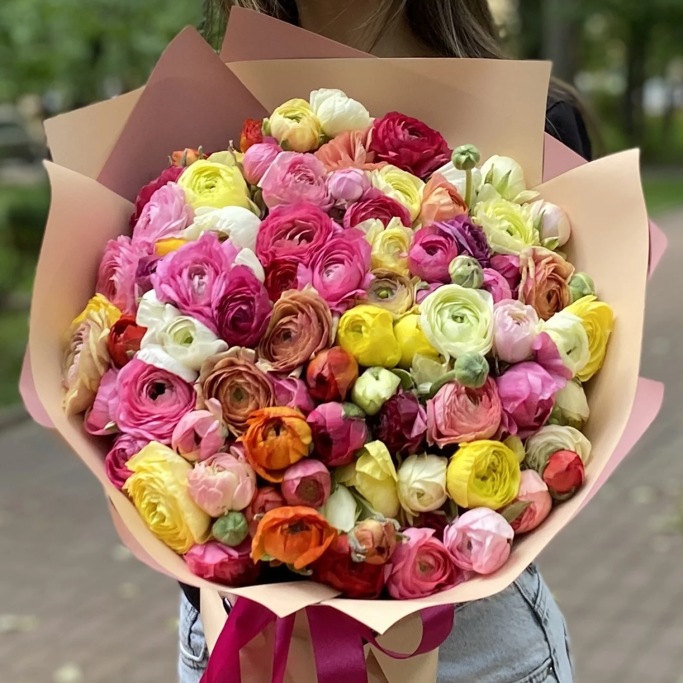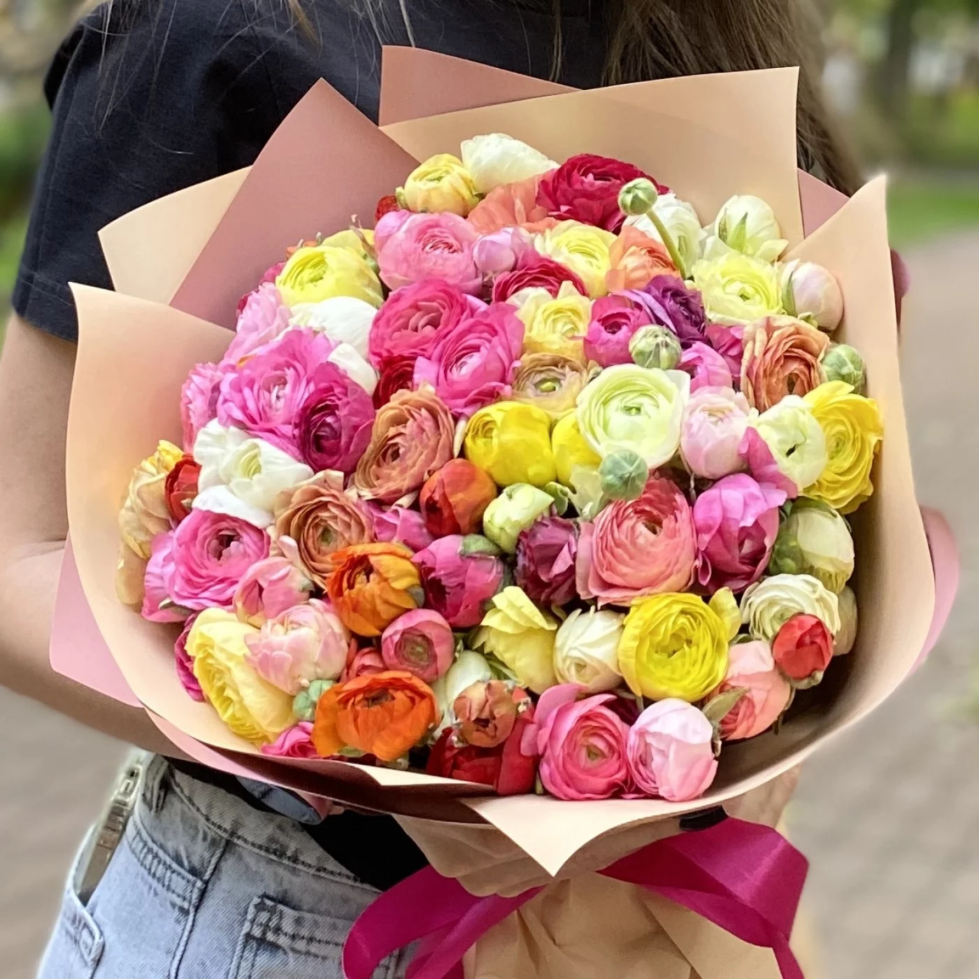 Букет эффектных разноцветных ранункулюсов произведет незабываемое впечатление на свою получательницу!
