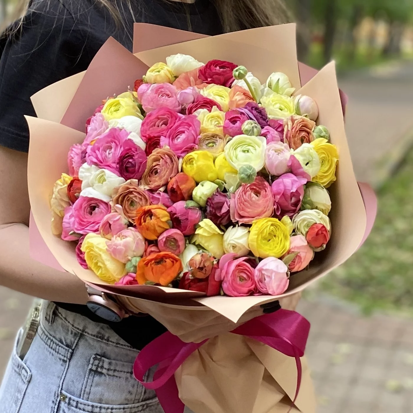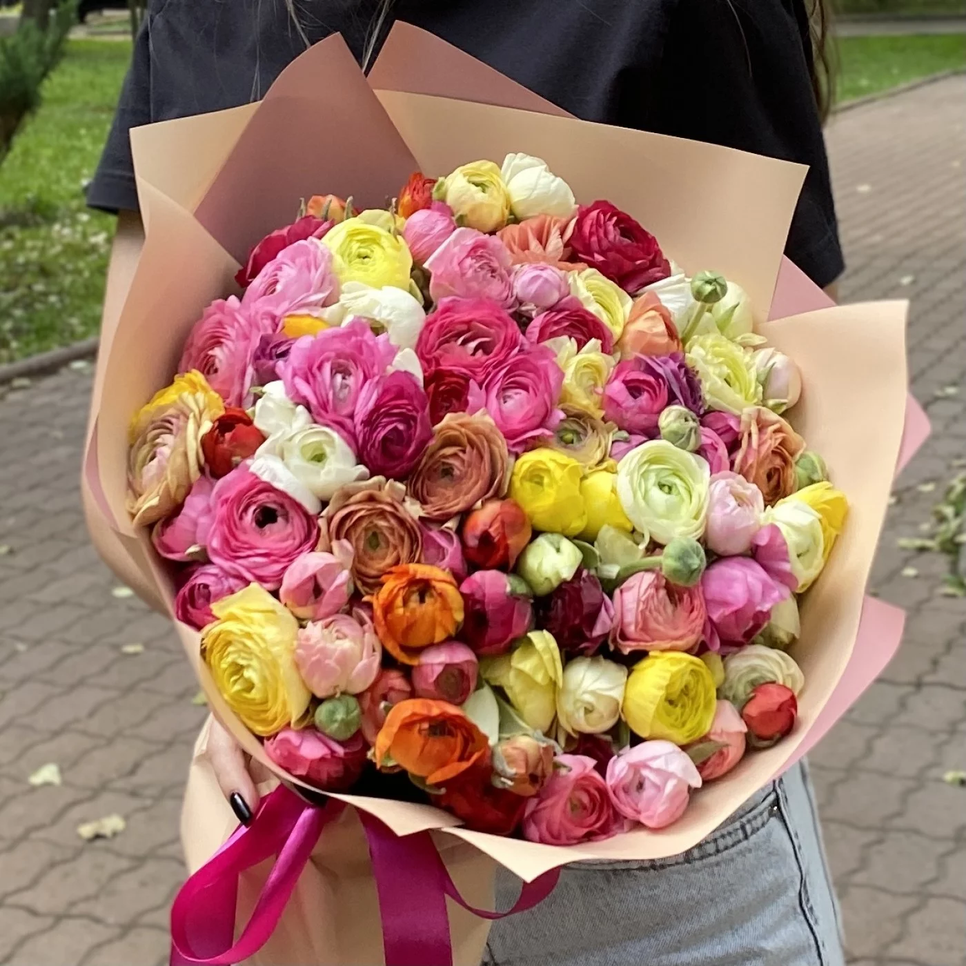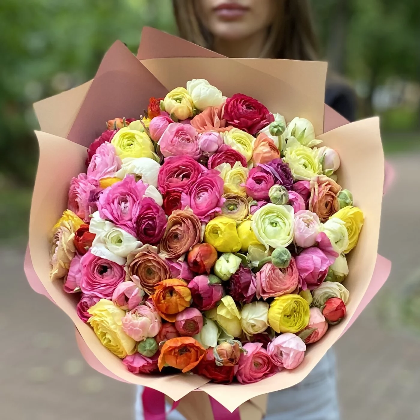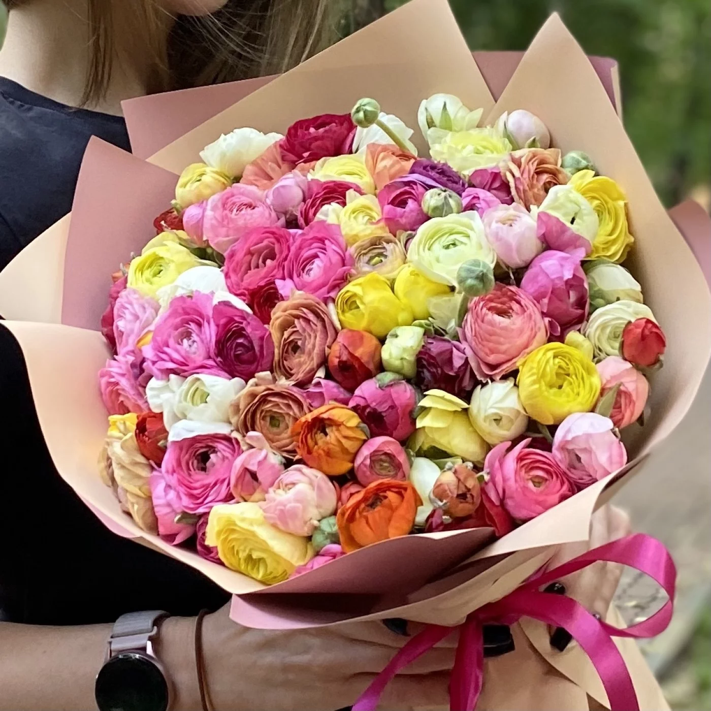 Букет эффектных разноцветных ранункулюсов произведет незабываемое впечатление на свою получательницу!