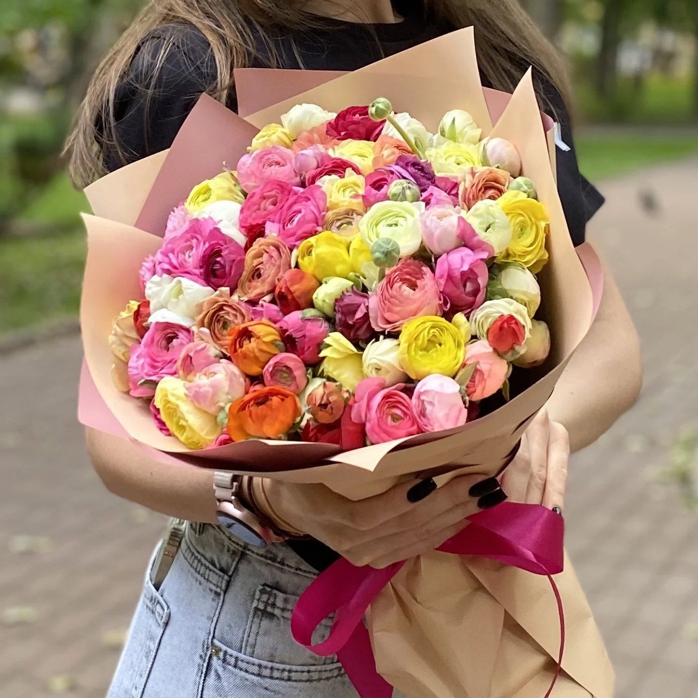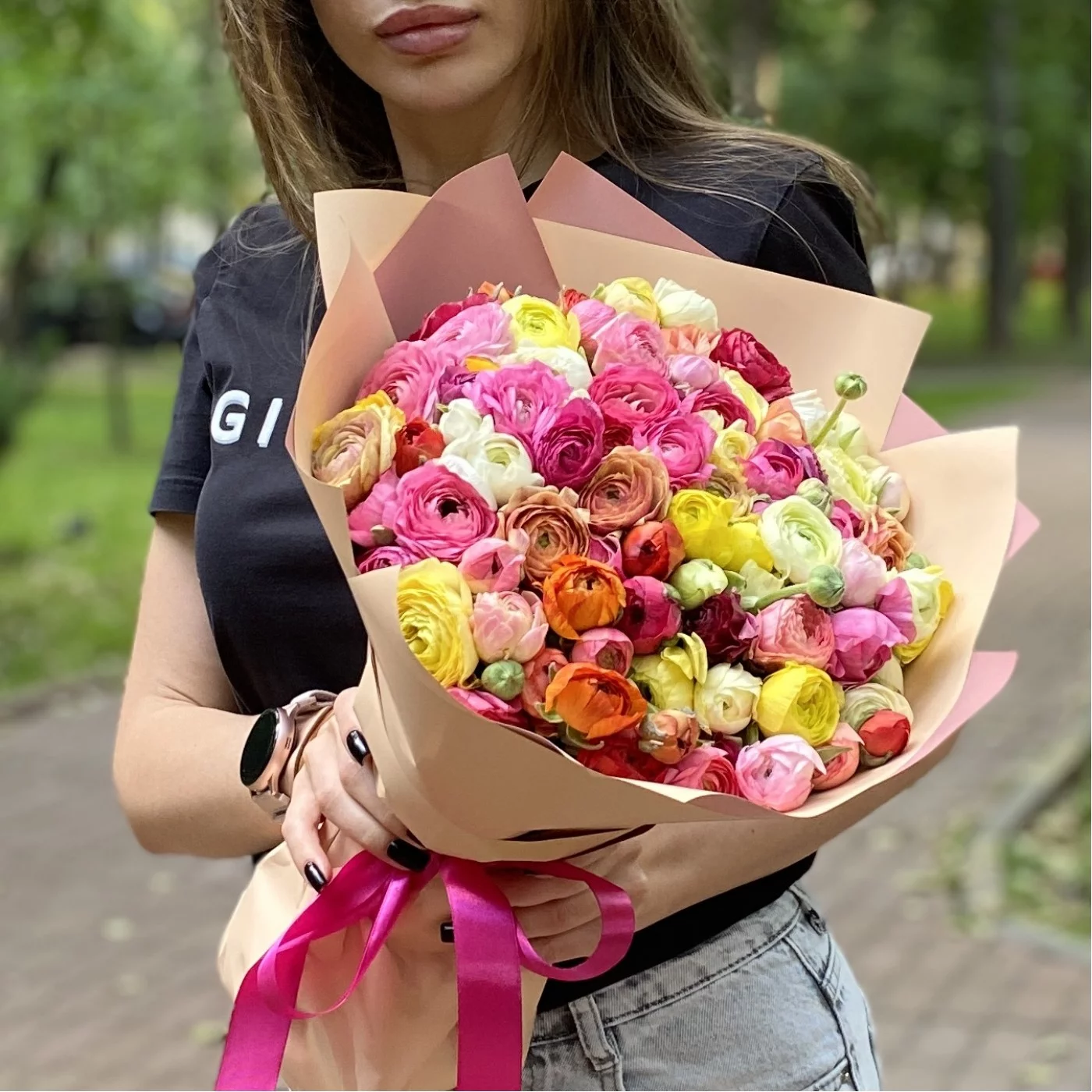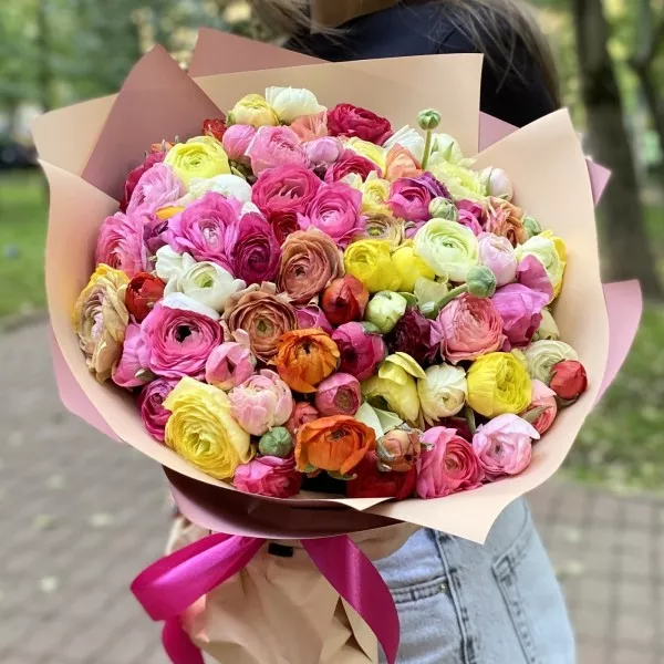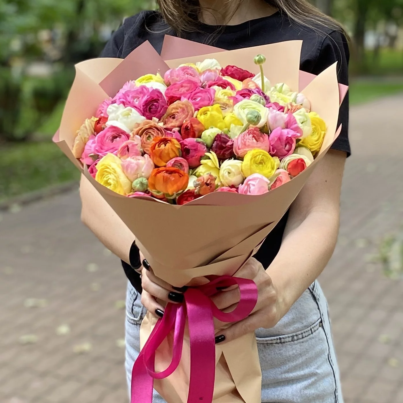 Букет эффектных разноцветных ранункулюсов произведет незабываемое впечатление на свою получательницу!