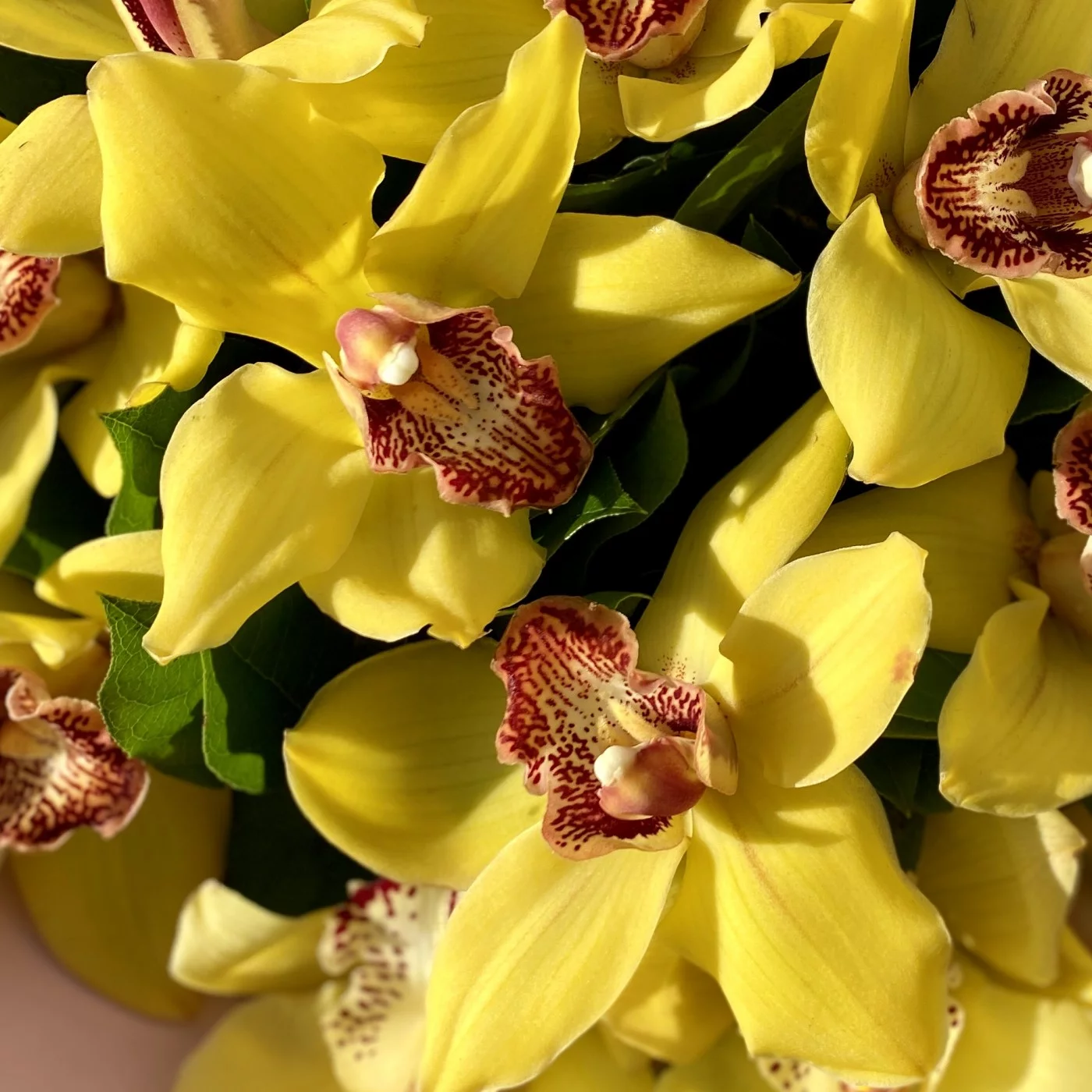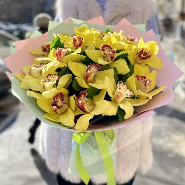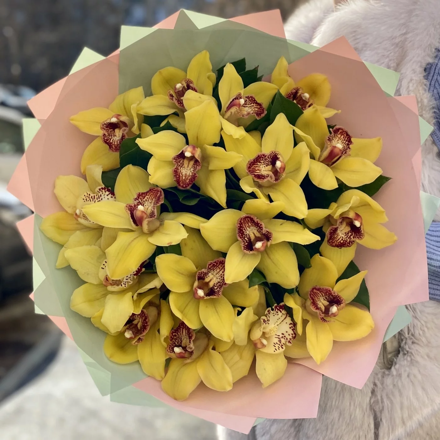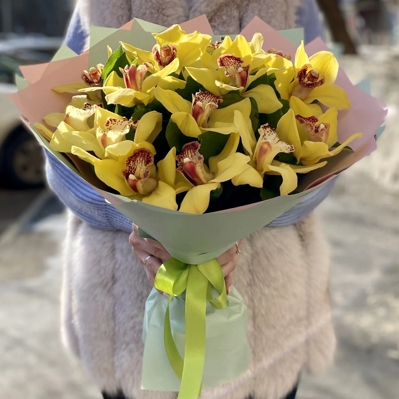 Букет из желтых орхидей сорта Цимбидиум. Прекрасный вариант для подарка на юбилей или день рождение. Орхидея очень стойкая, будет радовать получателя долгое время.