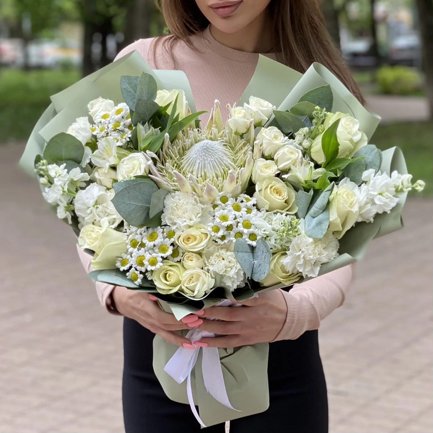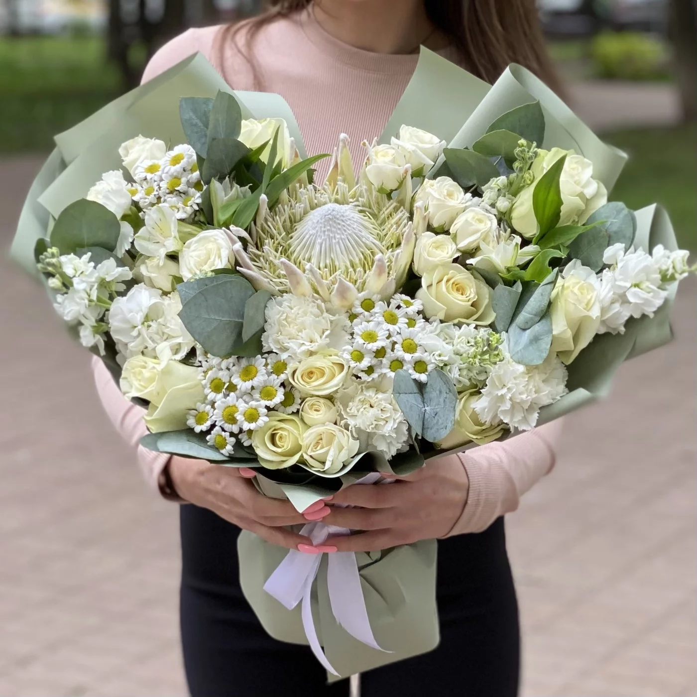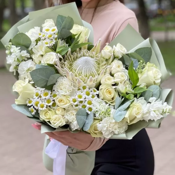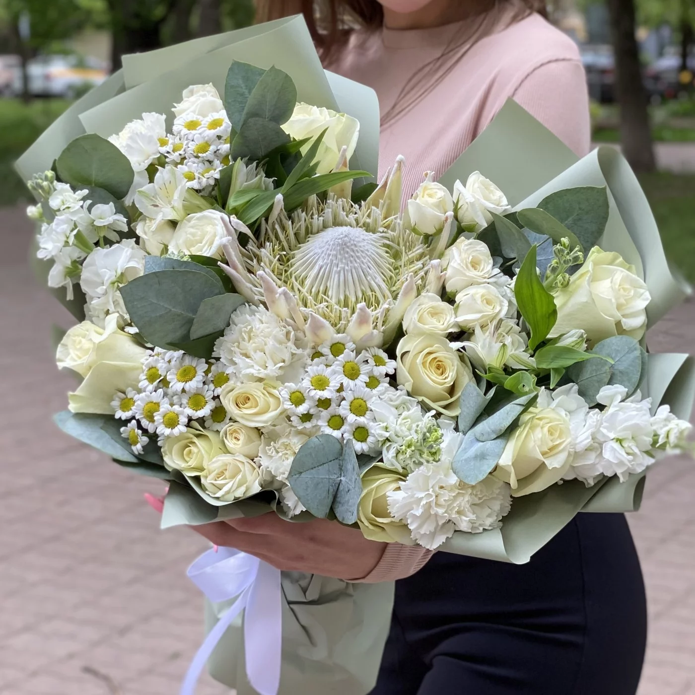 Букет «Жемчужина» с протеей — праздничный букет из великолепных белых роз, необычной по форме белой протеи, маттиол, альстромерий и кустовых роз Сноу бабл в окружении веточек эвкалипта и рускуса. Высота цветочной композиции — 40 см, ширина — 35 см. Изысканный флористический ансамбль завораживает своим безупречным внешним видом и неповторимыми “жемчужными” переливами белого цвета. Это прекрасный выбор для любого важного события! Чистота цветочных бутонов подчеркнет подлинность чувств дарителя, его восхищение перед женской красотой. Такой букет непременно притянет взгляд, захватит воображение своей роскошью, вызовет чувство изумления и признательности