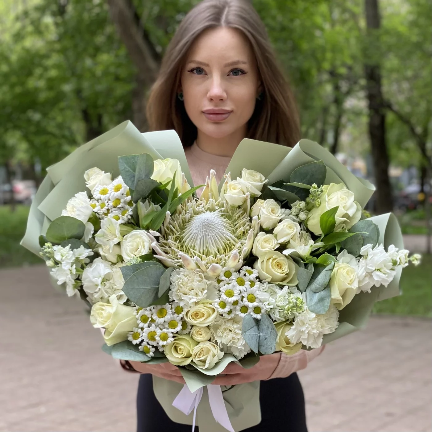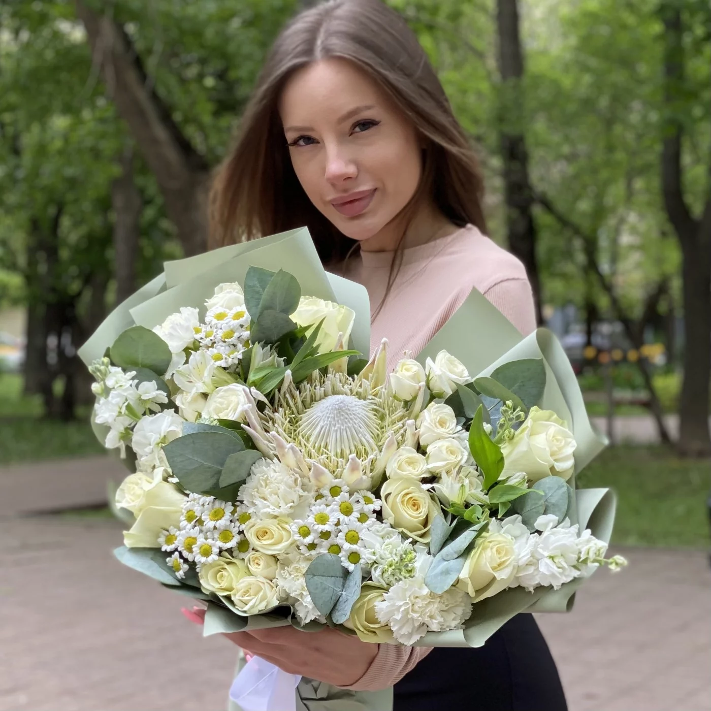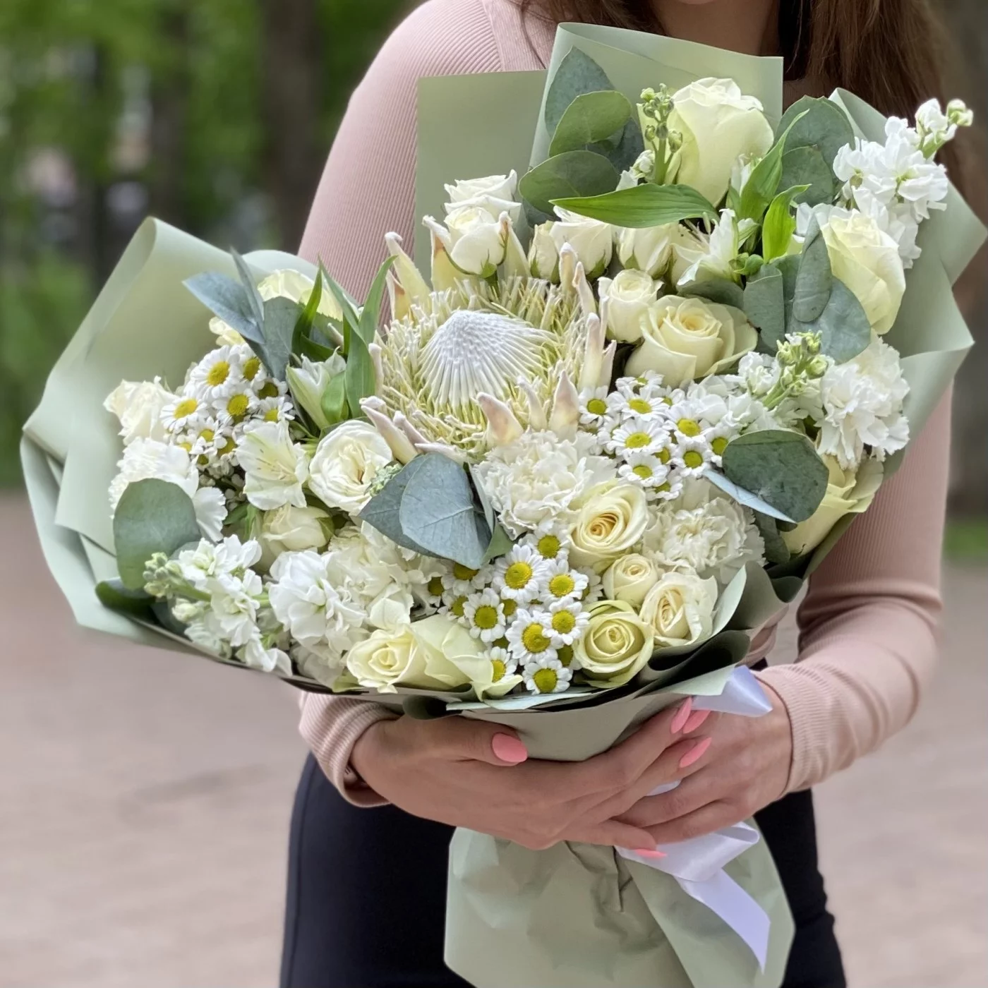 Букет «Жемчужина» с протеей — праздничный букет из великолепных белых роз, необычной по форме белой протеи, маттиол, альстромерий и кустовых роз Сноу бабл в окружении веточек эвкалипта и рускуса. Высота цветочной композиции — 40 см, ширина — 35 см. Изысканный флористический ансамбль завораживает своим безупречным внешним видом и неповторимыми “жемчужными” переливами белого цвета. Это прекрасный выбор для любого важного события! Чистота цветочных бутонов подчеркнет подлинность чувств дарителя, его восхищение перед женской красотой. Такой букет непременно притянет взгляд, захватит воображение своей роскошью, вызовет чувство изумления и признательности