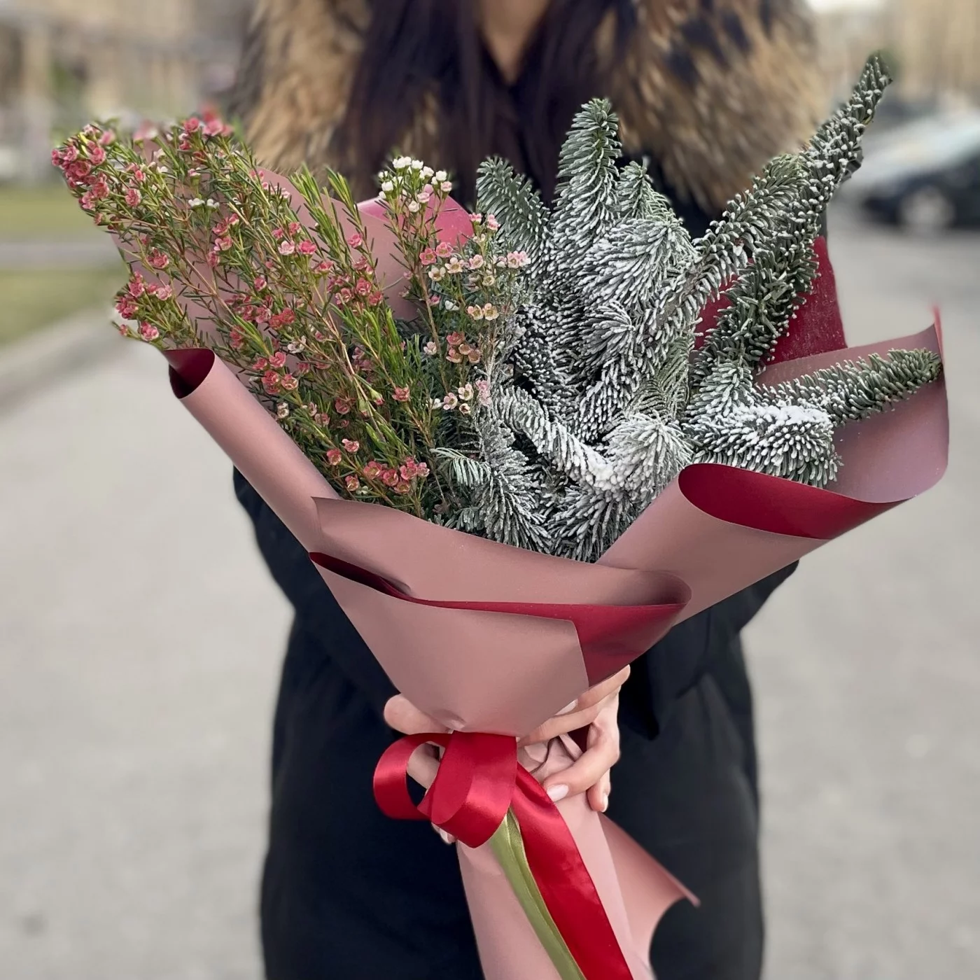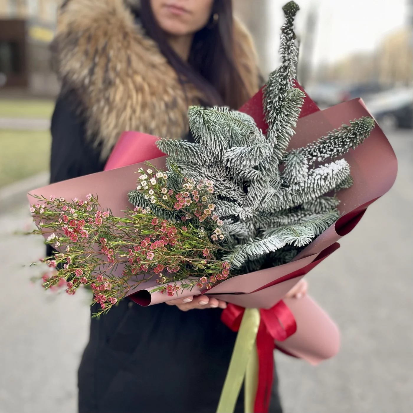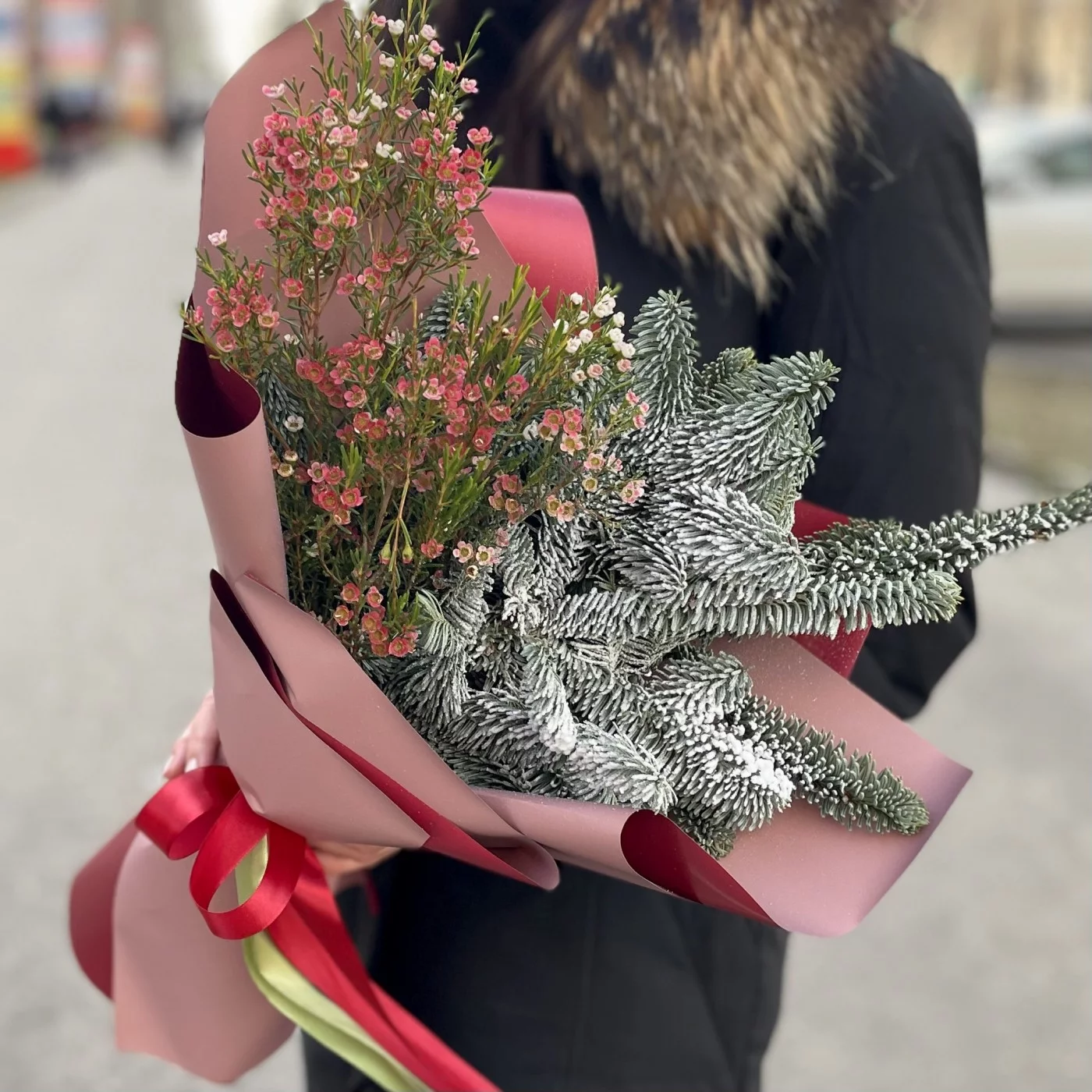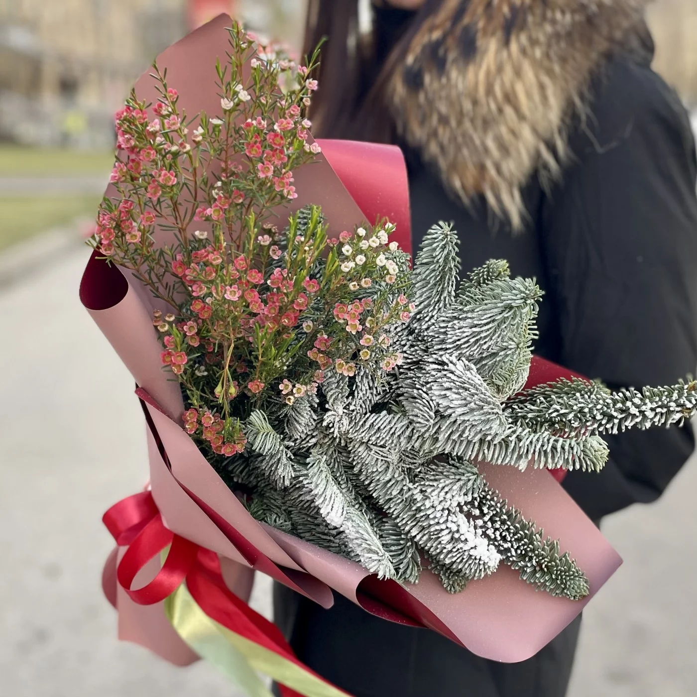 Букет с пушистым нобилисом и шамелациумом подарит своей получательнице новогоднее настроение и прекрасный хвойный аромат дома.