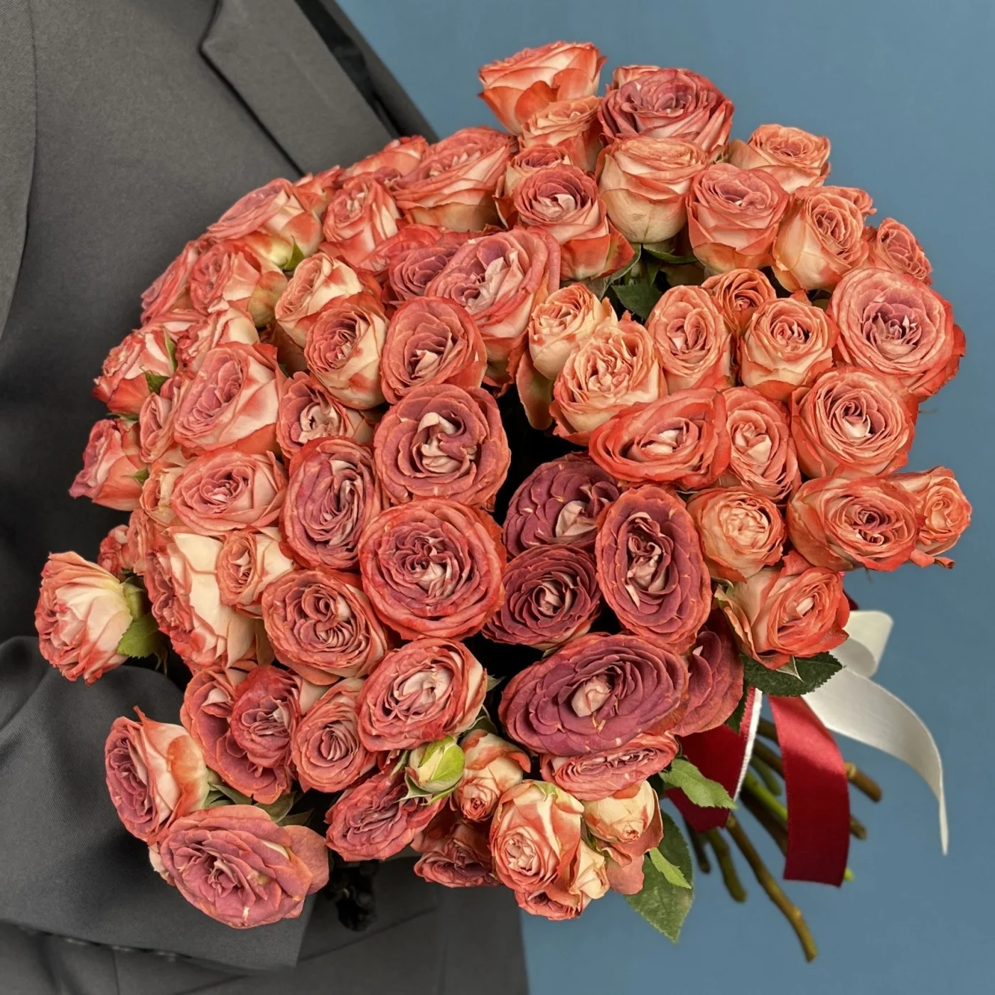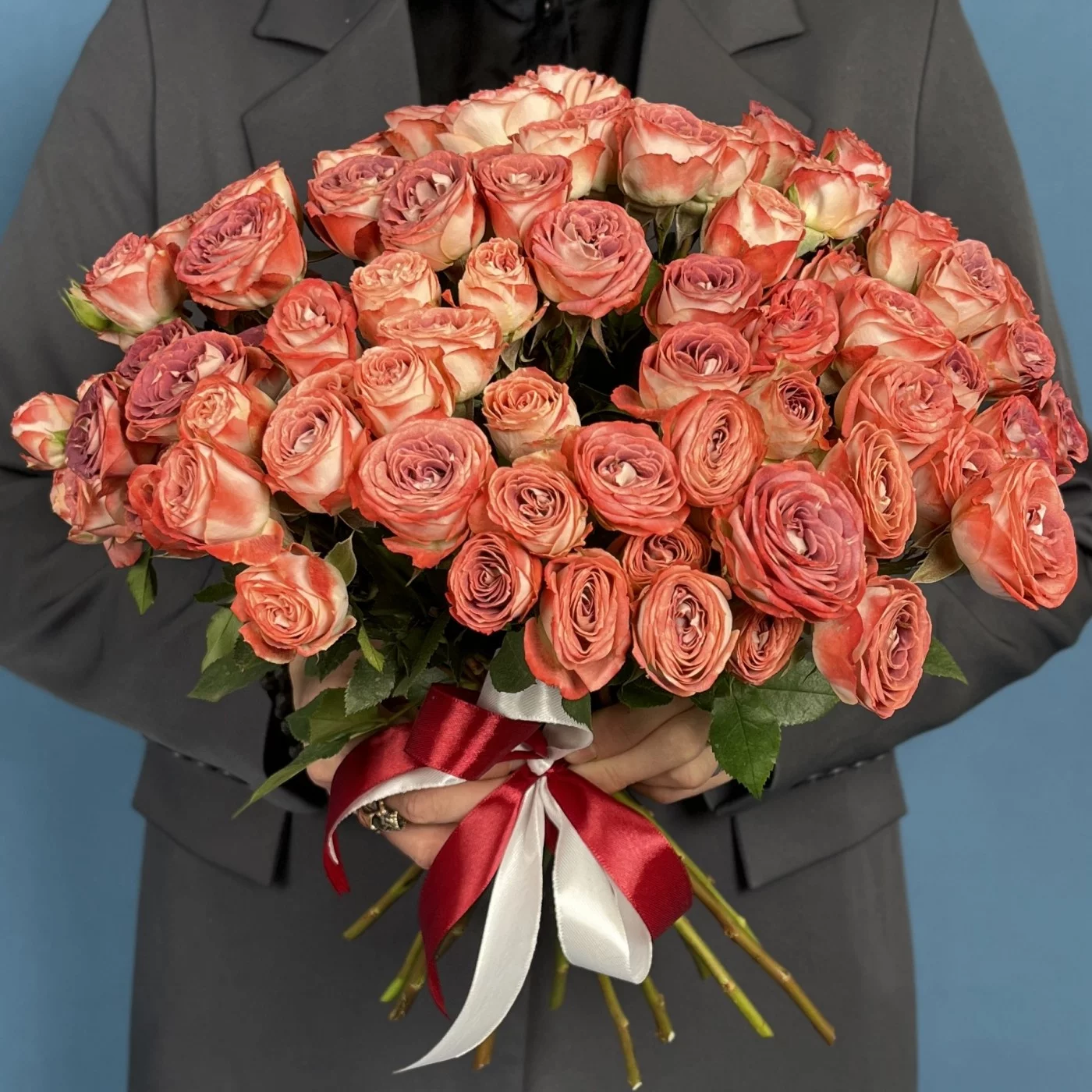 Кустовая роза Медия с высотой 40 см — это изящное растение с уникальным окрасом лепестков: сочетанием кирпично-красных и белых оттенков.