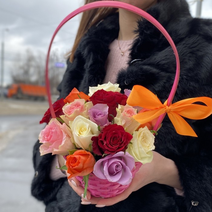 Маленькая корзина из 15 роз подойдет в качестве комплимента или небольшого подарка на 8 марта или 14 февраля. Так же такую композицию можно подарить ребенку на день рождения.