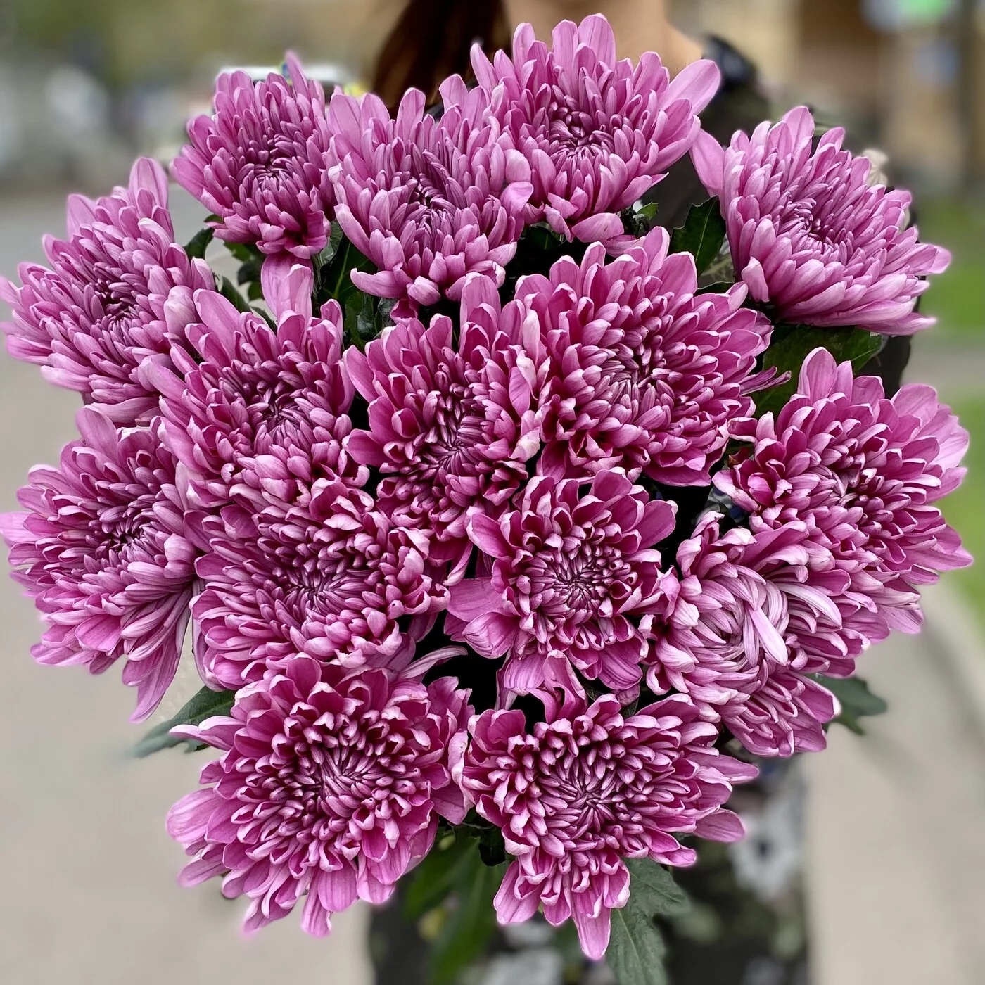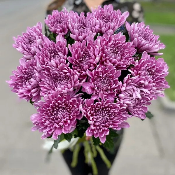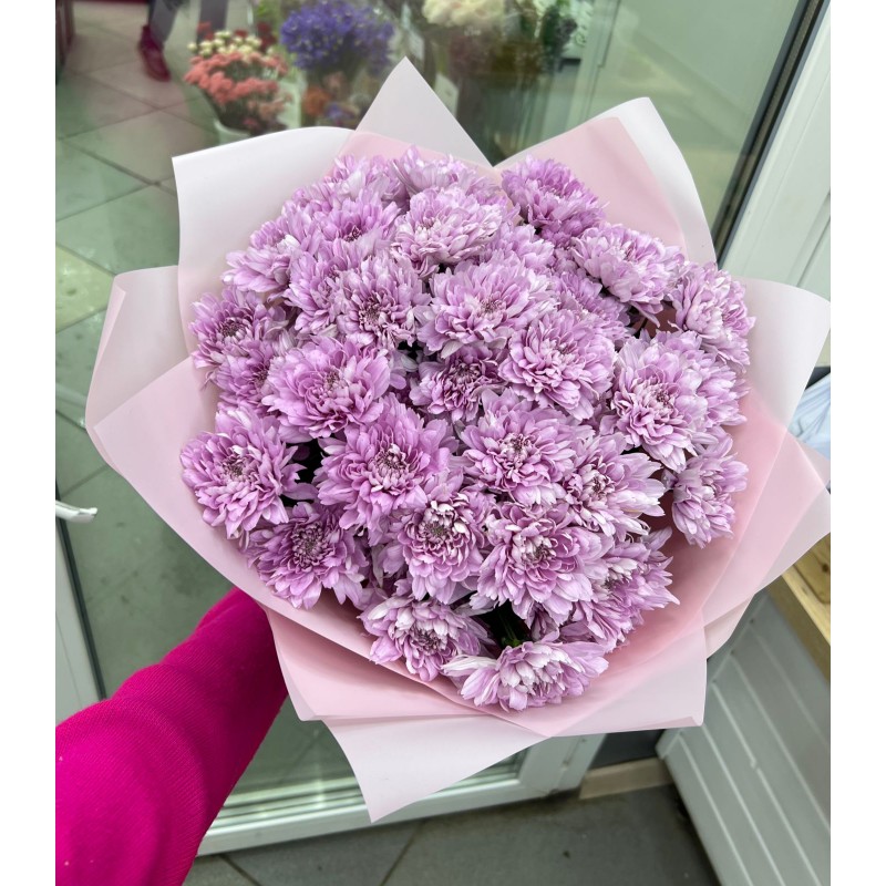 Свежие сиреневые хризантемы поштучно недорого всегда можно выбрать и приобрести на нашем сайте.