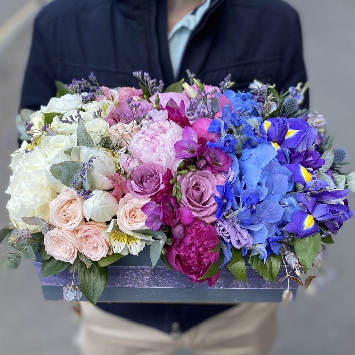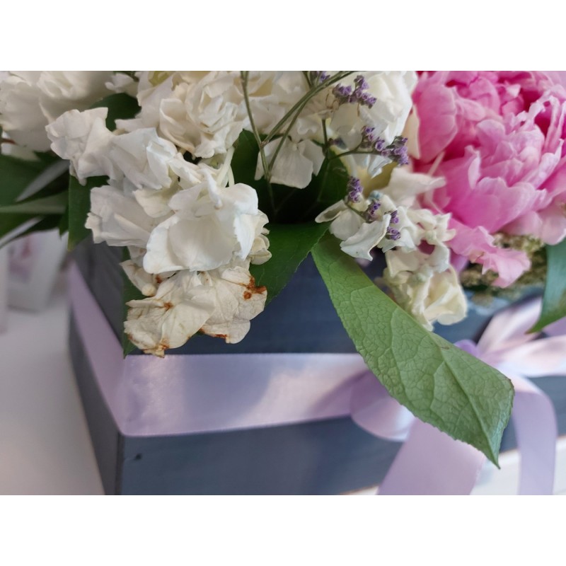 Состав букета и цвет коробки может быть слегка изменен в соответствии сезонностью цветов сохранняя гамму и тона композиции.