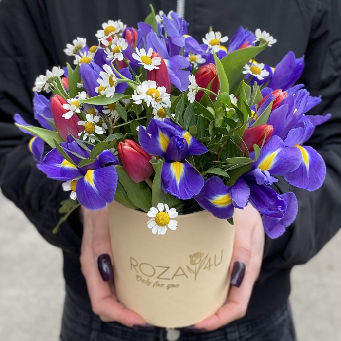 Яркие ирисы с тюльпанами и ароматной ромашкой в коробке. Преподнесите такую композиция в качестве подарка своим любимым.