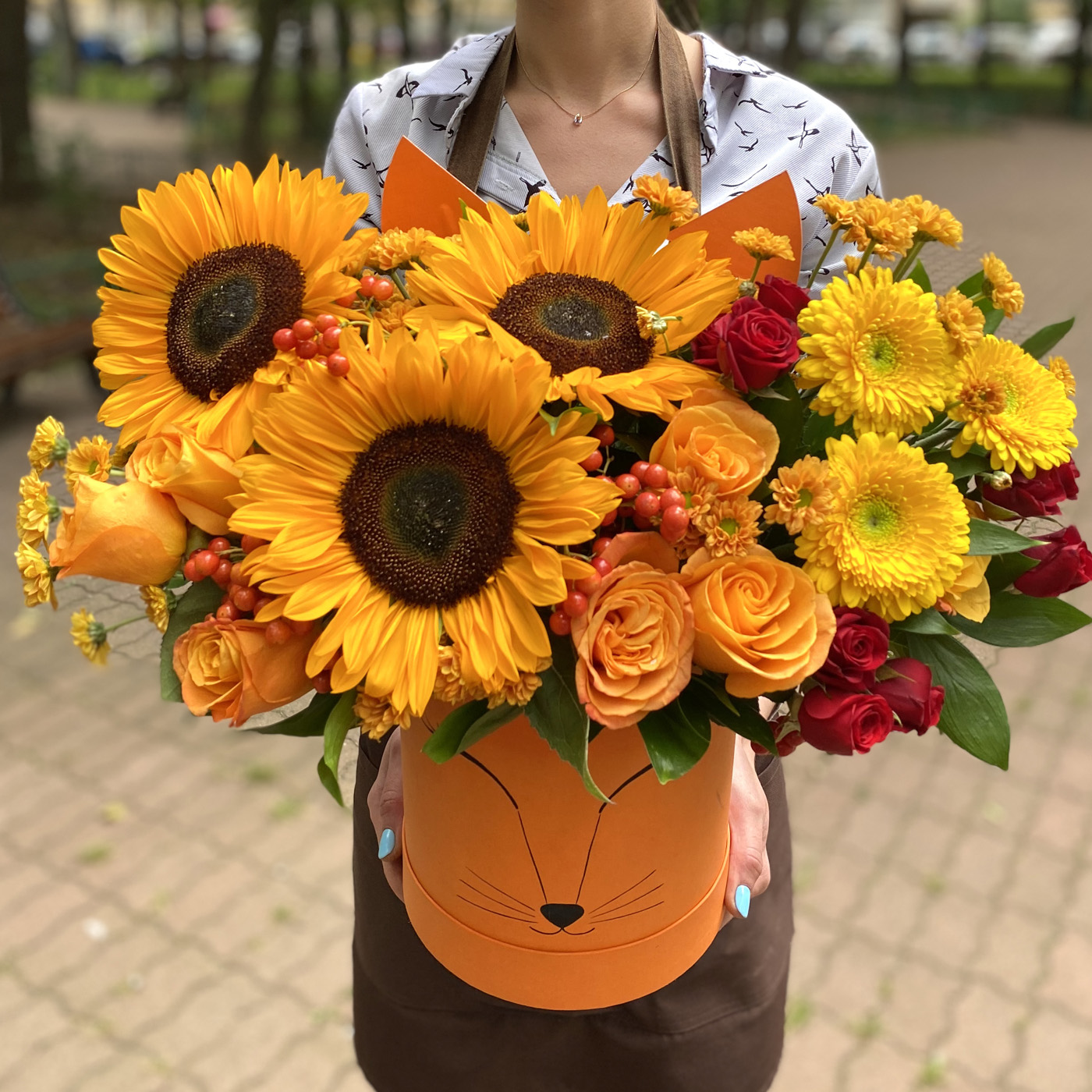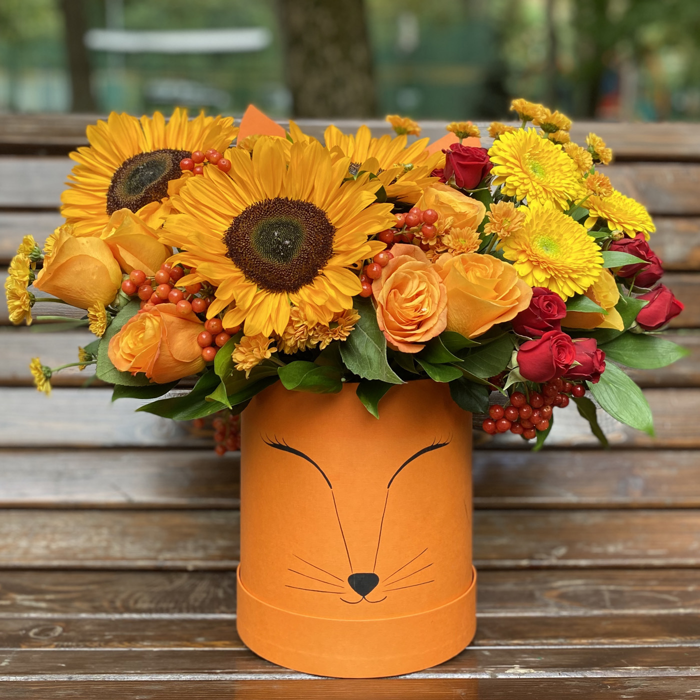 Яркие подсолнухи и гермини, ароматная роза и яркая калина собраны в восхитительную композицию, которая станет превосходным подарком к празднику и роскошным комплиментом "без повода".