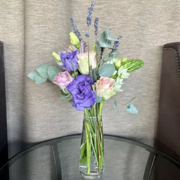Готовый набор цветов в небольшой вазочке. Такой набор подойдет для украшения мероприятий, ресепшенов или кофейных столиков. Цветочный набор выполнен в розово-фиолетовом оттенке.