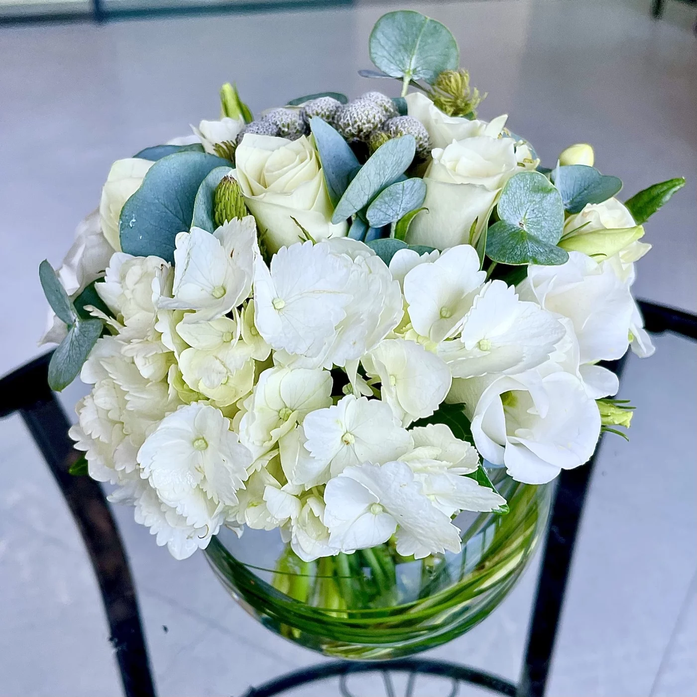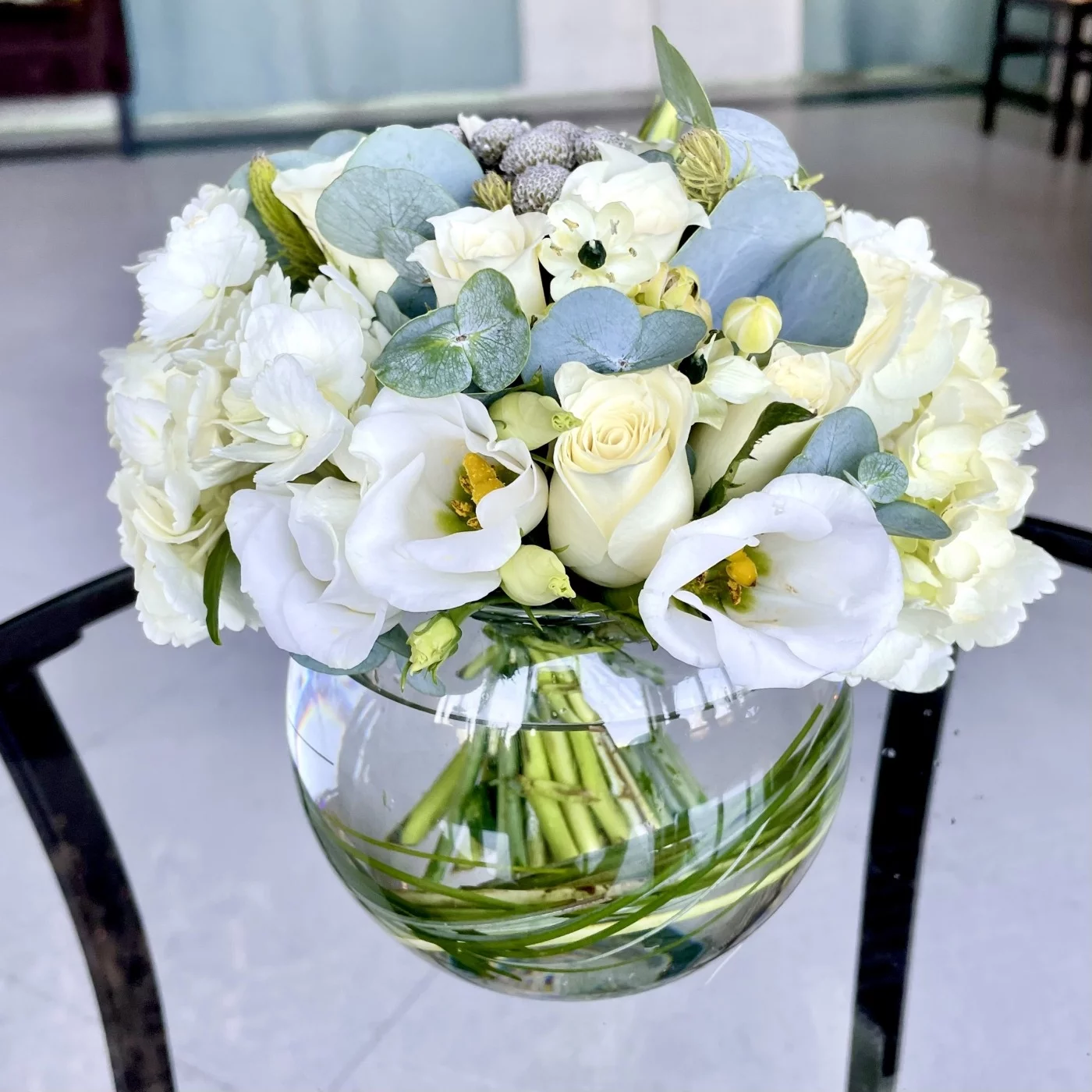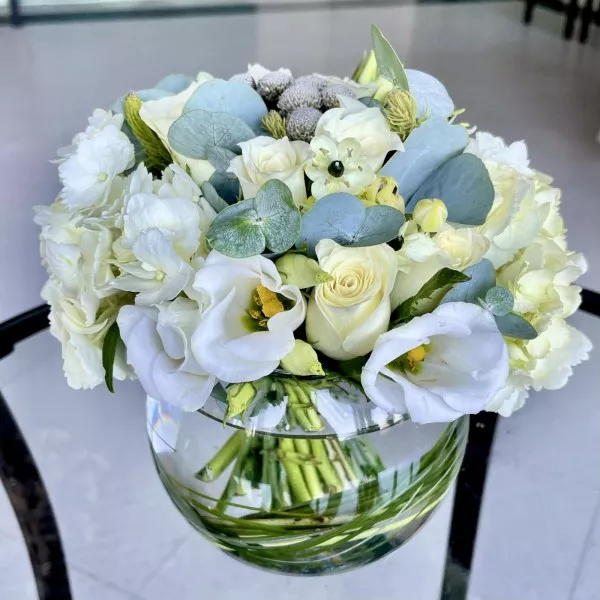 Белая свадебная композиция в круглой стеклянной вазе в виде шара. Красивое и элегантное дополнение для праздничного стола на торжество.