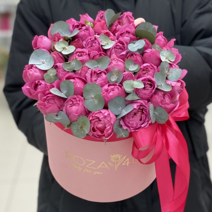Этот красивый букет – идеальный подарок для самой дорогой и любимой женщины в вашей жизни. Композиция состоит из девяти нежных розовых пионовидных роз, которые искусно сочетаются с плотной серебристой зеленью. Но это ещё не всё. Букет упакован в розовую шляпную коробку и перевязан роскошной атласной лентой, благодаря чему становится ещё более запоминающимся.