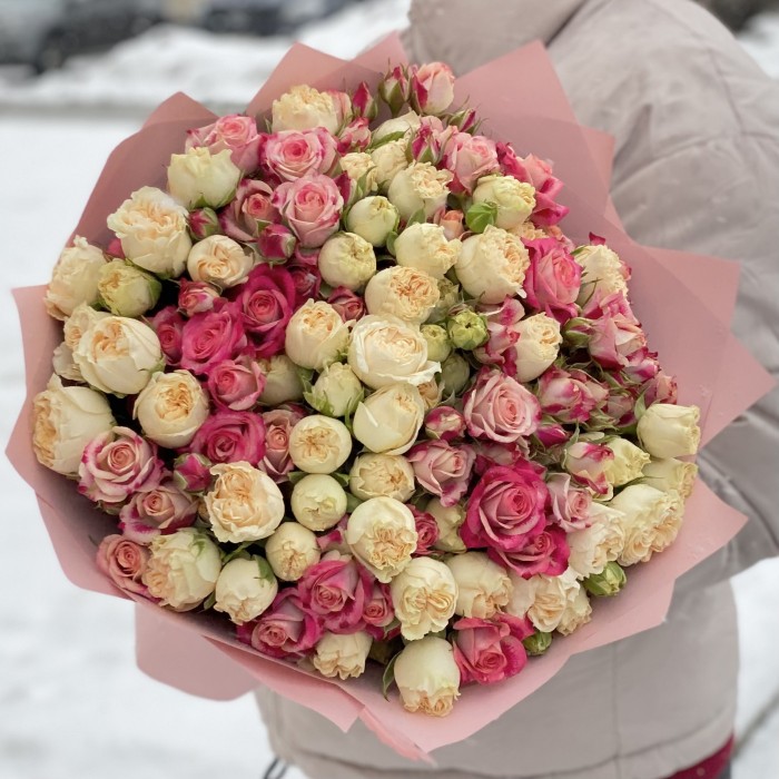 Нежный и привлекательный микс двух сортов кустовых роз превосходно выглядит, красиво раскрывается и отлично подходит как презент к праздникам весны!
