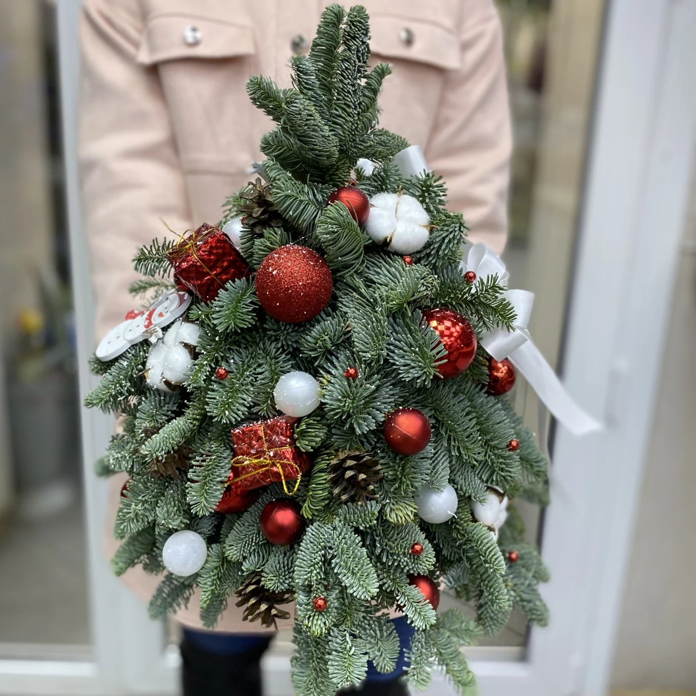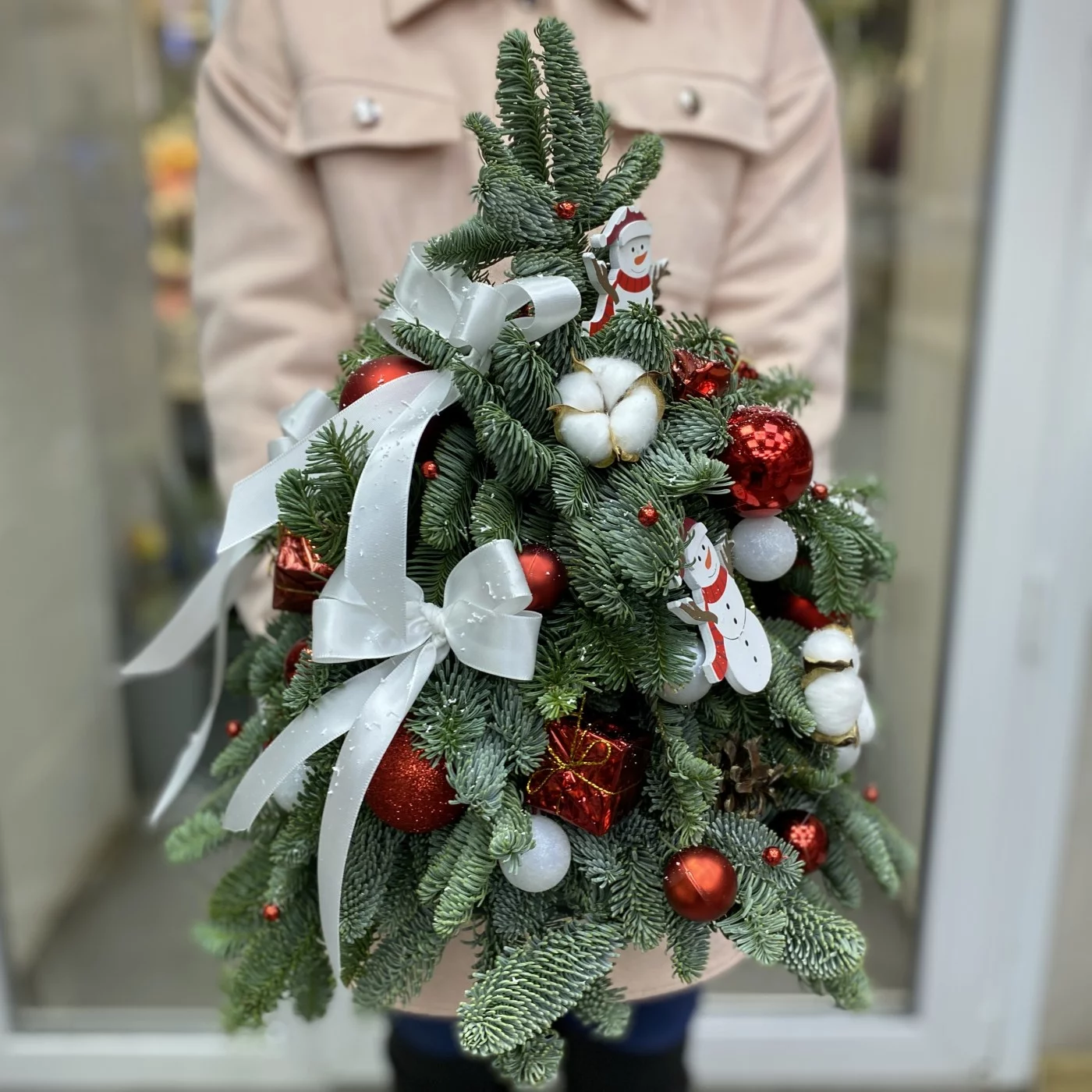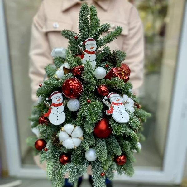 Чтобы создать праздничное настроение и украсить интерьер дома в преддверии наступления Нового 2023 года, идеально подойдет елка декорированная из натуральной хвои Нобилиса. В качестве декора композиции используются ярко-красные шары и белоснежные снеговики, придавая красавице традиционную для праздника цветовую гамму.