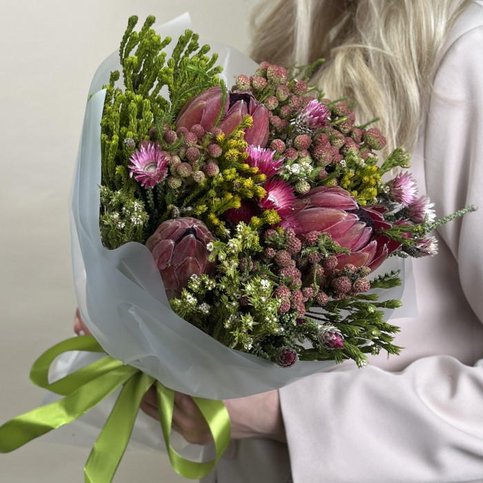 Экзотический микс с протеей - это настоящее произведение искусства, созданное для тех, кто ценит экзотику и оригинальность. Этот букет воплощает в себе дух дикой природы и загадочности Африки, где каждый цветок является уникальным и неповторимым.