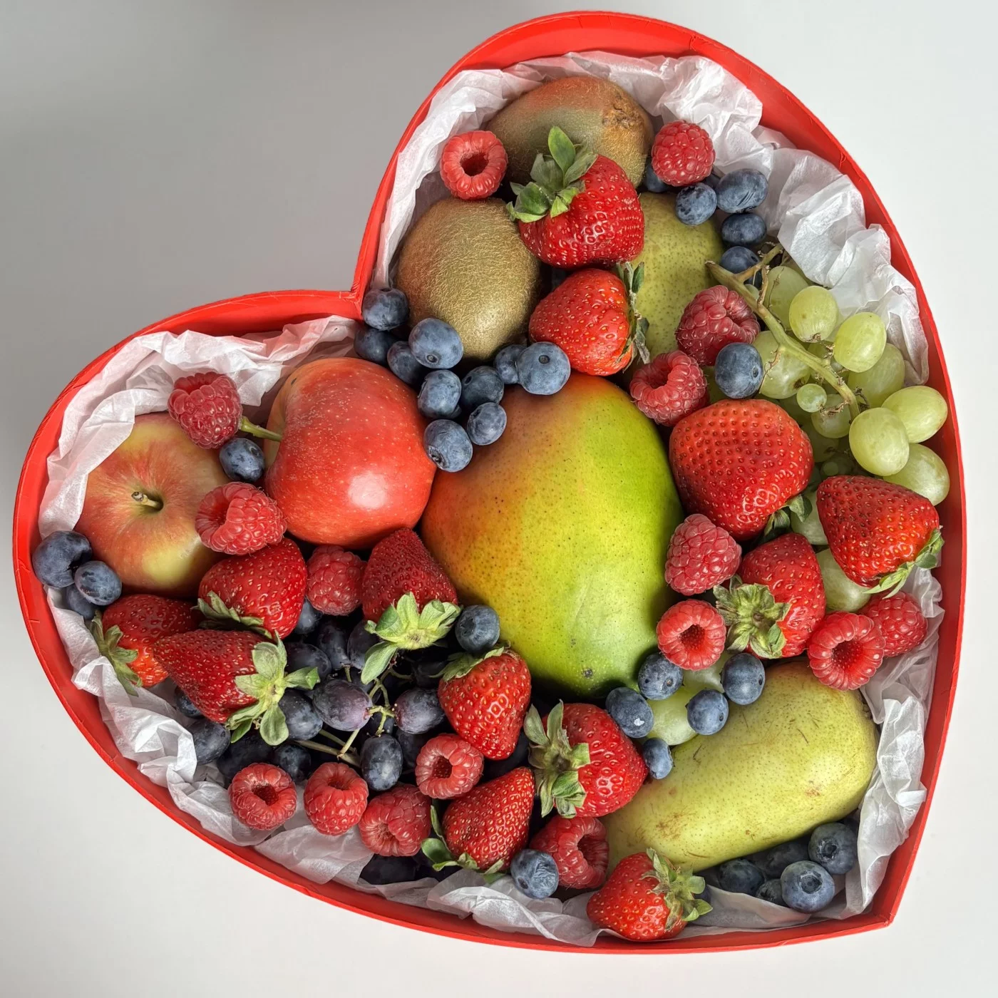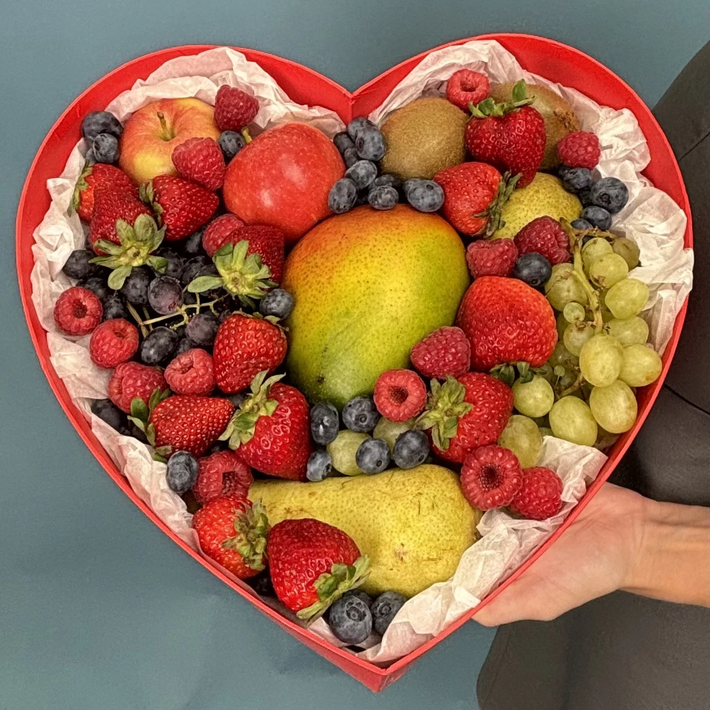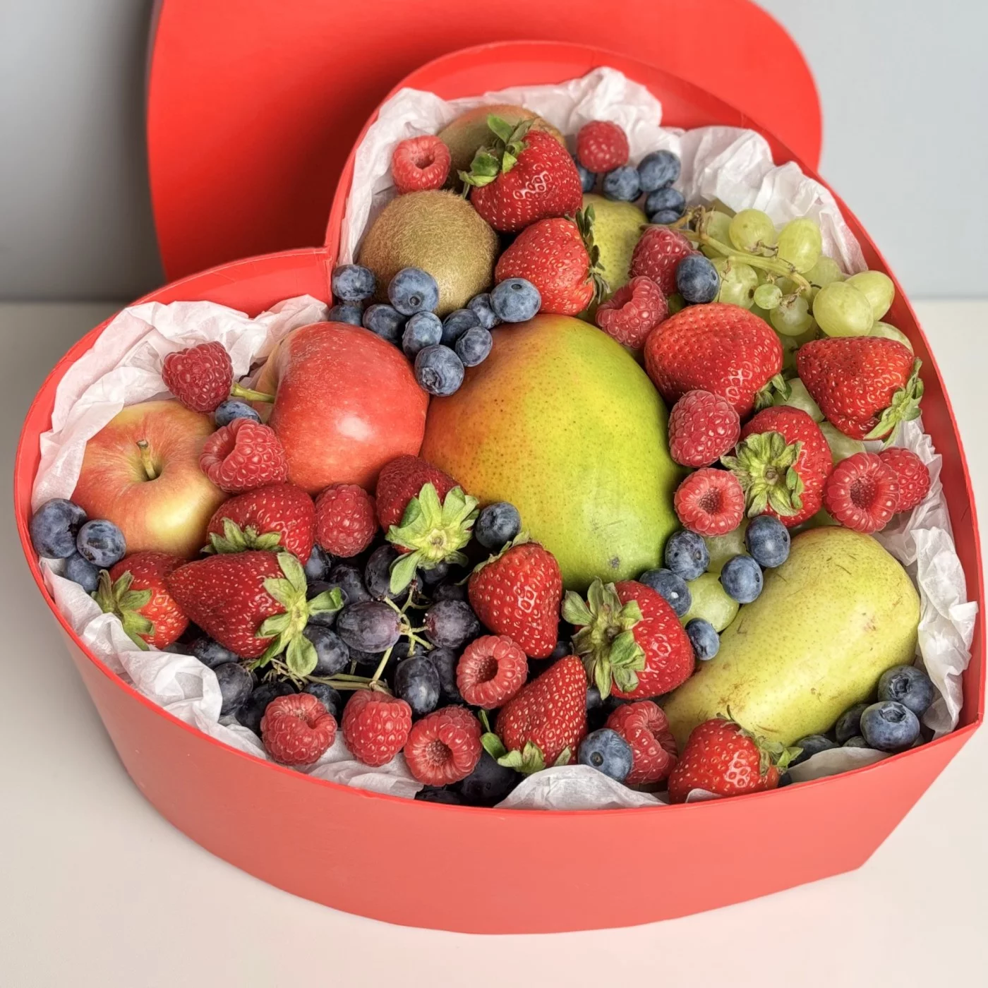 Большая коробка сердце с фруктами и ягодами. Шикарный набор для любимых. В состав входят манго, яблоки, груши, малина, клубника, виноград.