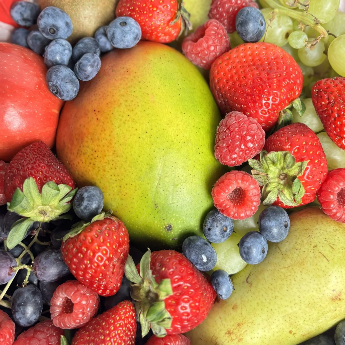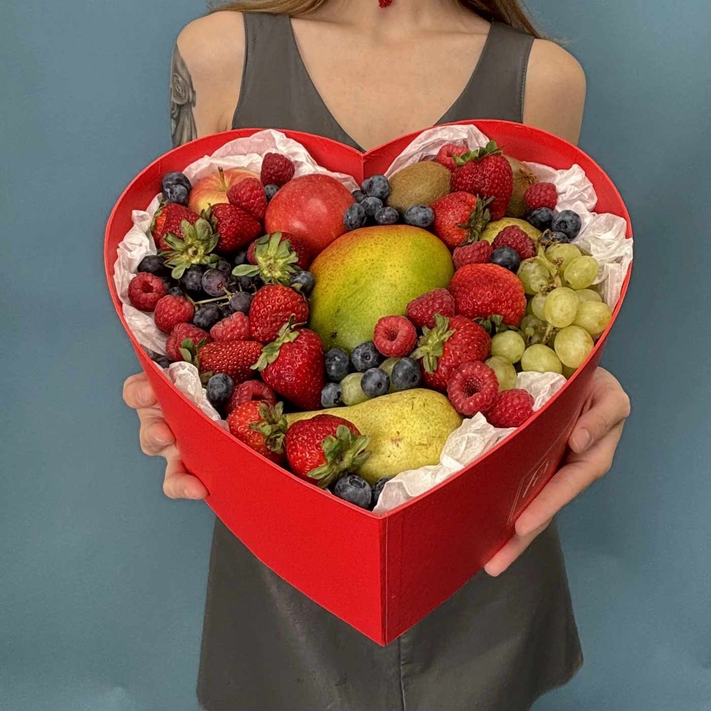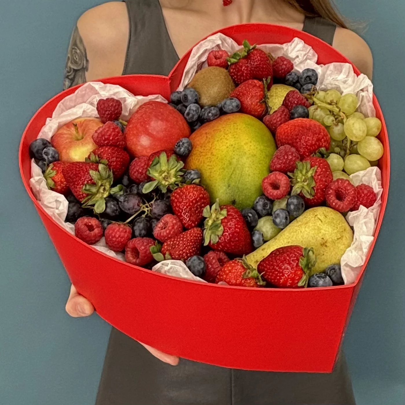 Большая коробка сердце с фруктами и ягодами. Шикарный набор для любимых. В состав входят манго, яблоки, груши, малина, клубника, виноград.