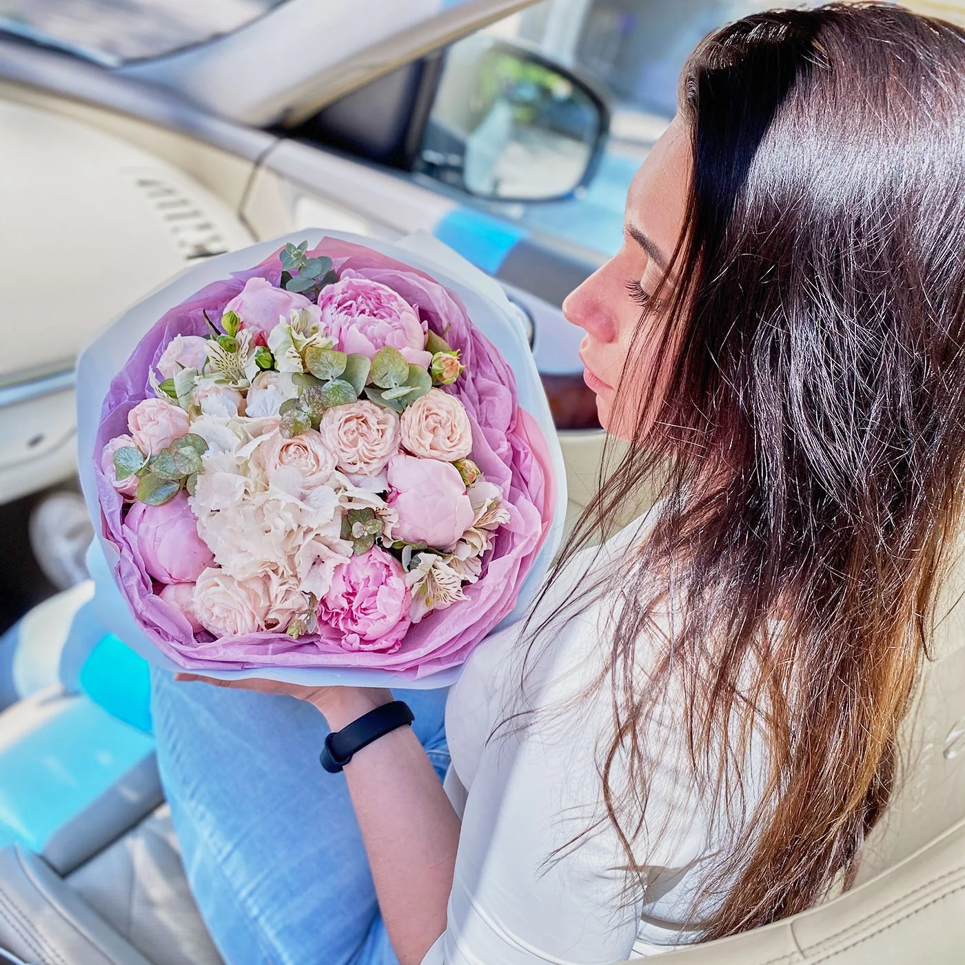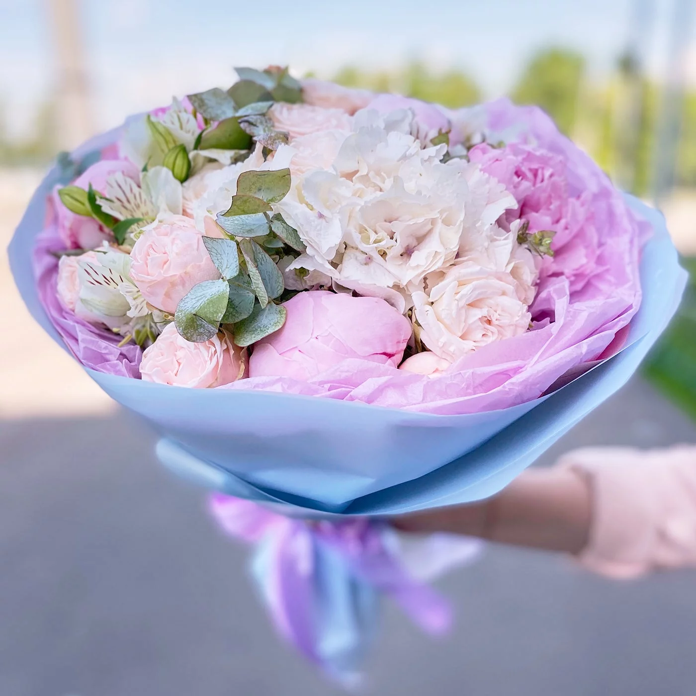 Состав букета: пионы – 5 шт, гортензия – 1 шт, роза кустовая пионовидная – 3 шт, альстромерия – 2 шт, эвкалипт, упаковка.