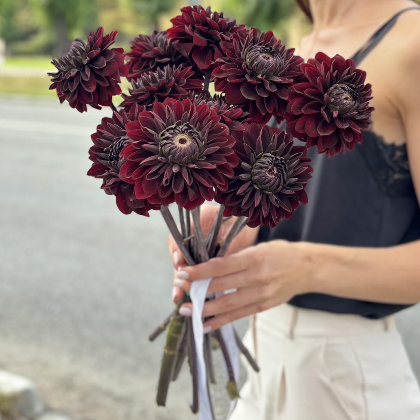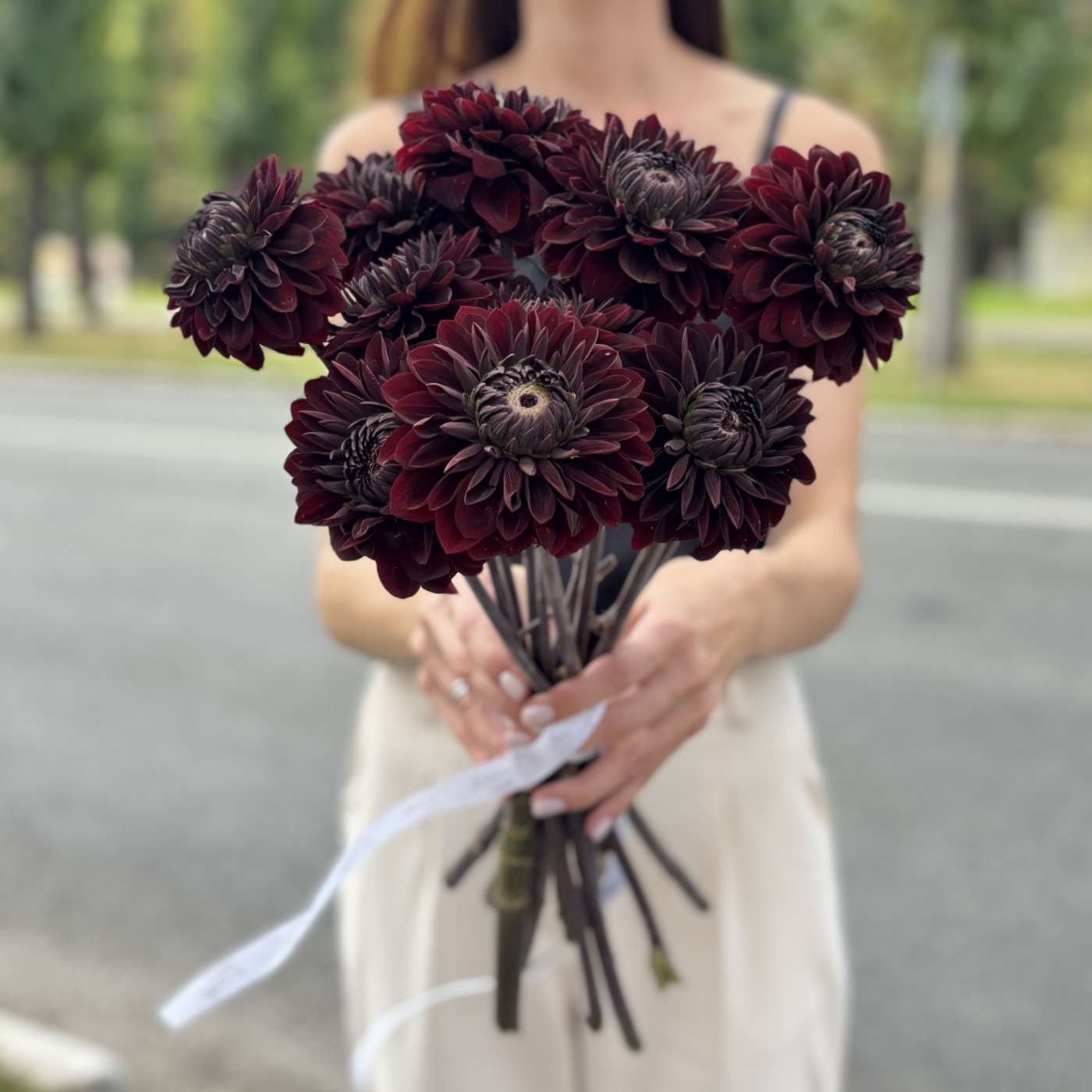 Букет георгин черного цвета отличный вариант подарка на День рождения, юбилей и 1 сентября.