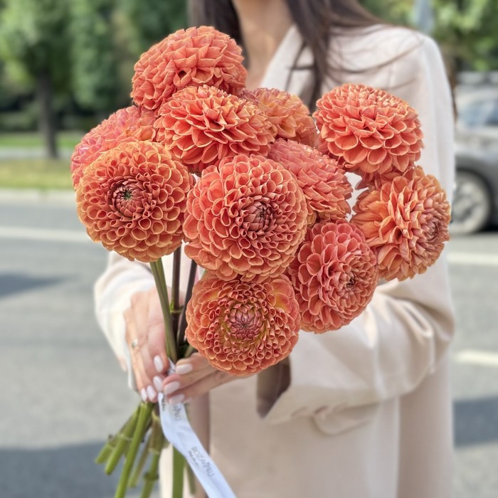 Яркий букет коричнево-желтых георгин отличный вариант подарка на День рождения, юбилей и 1 сентября.