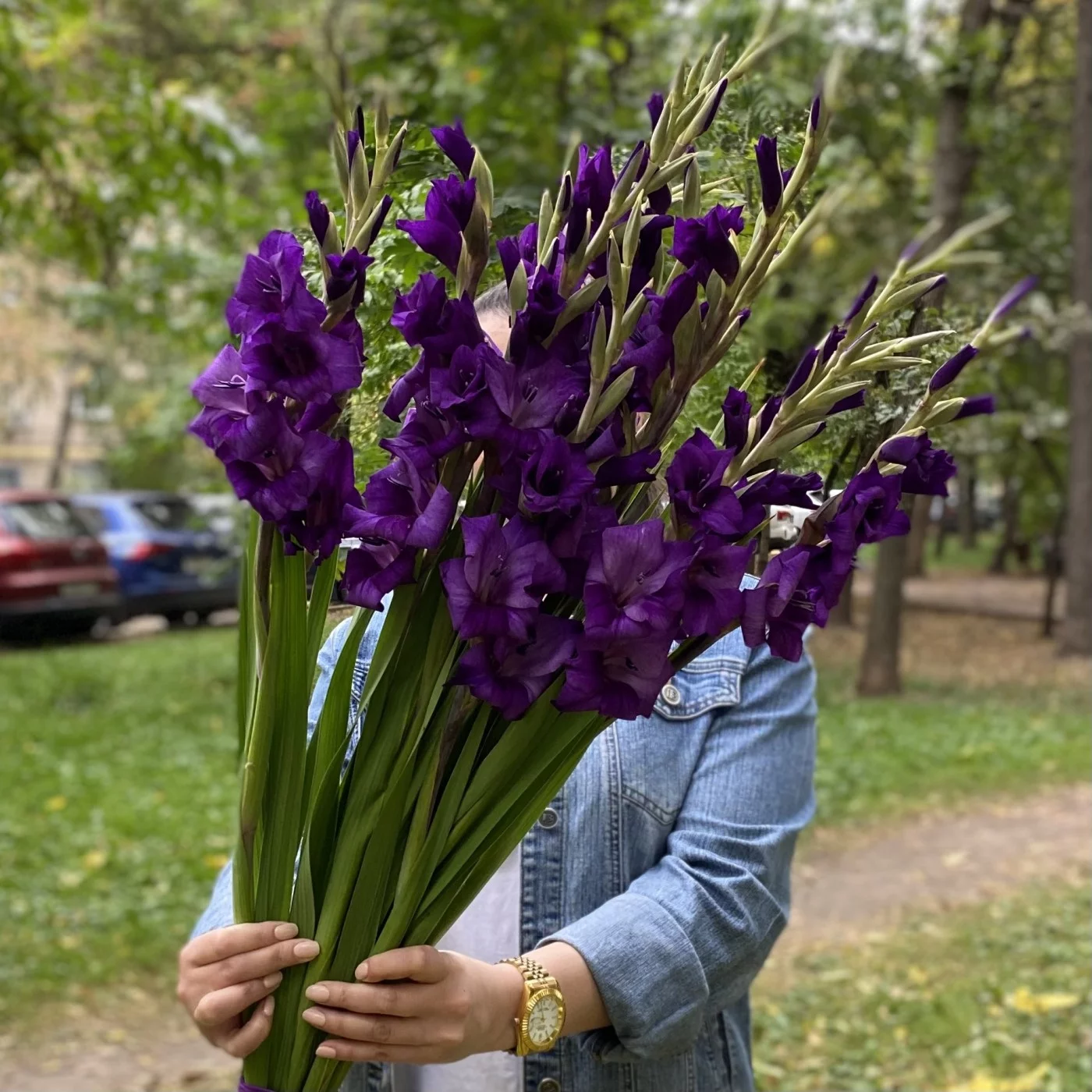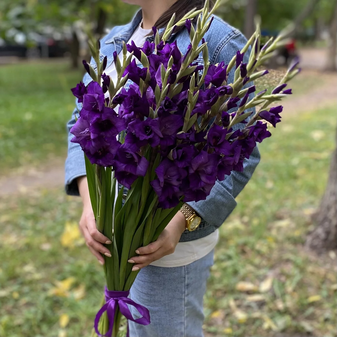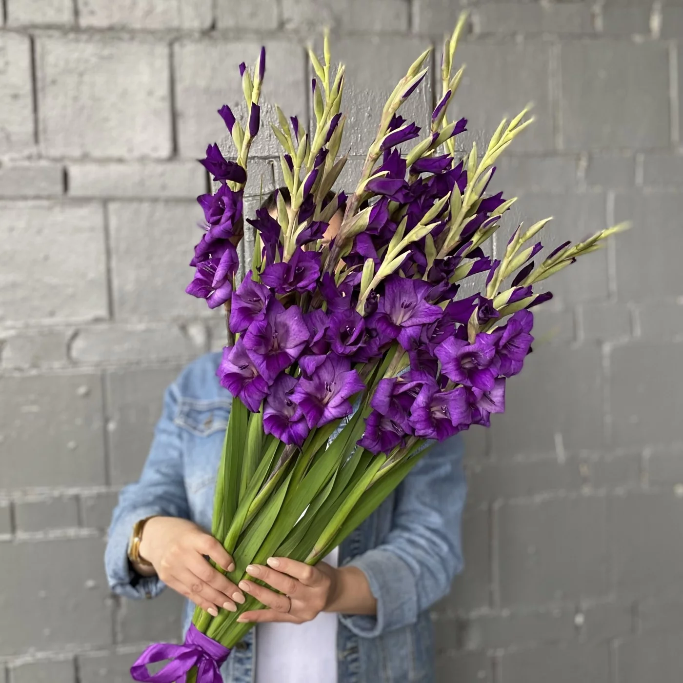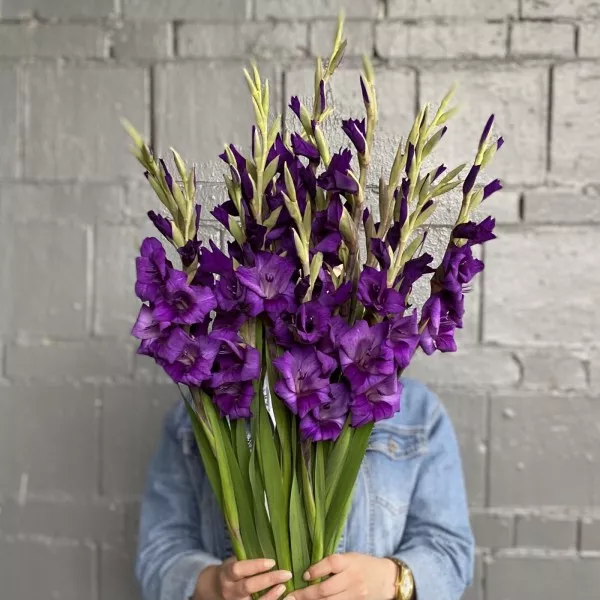 На фото букет из 11 штук темно-фиолетовых гладиолусов.