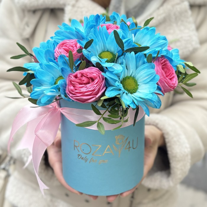 Очаровательная композиция из хризантем и пионовидных роз в шляпной коробке - отличный комплимент для близкого человека. Свежие ароматные цветы станут приятным сюрпризом и подарят прекрасное настроение.