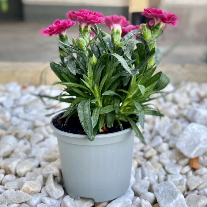 Гвоздика Шабо малиновая с фиолетовыми прожилками в горшке.