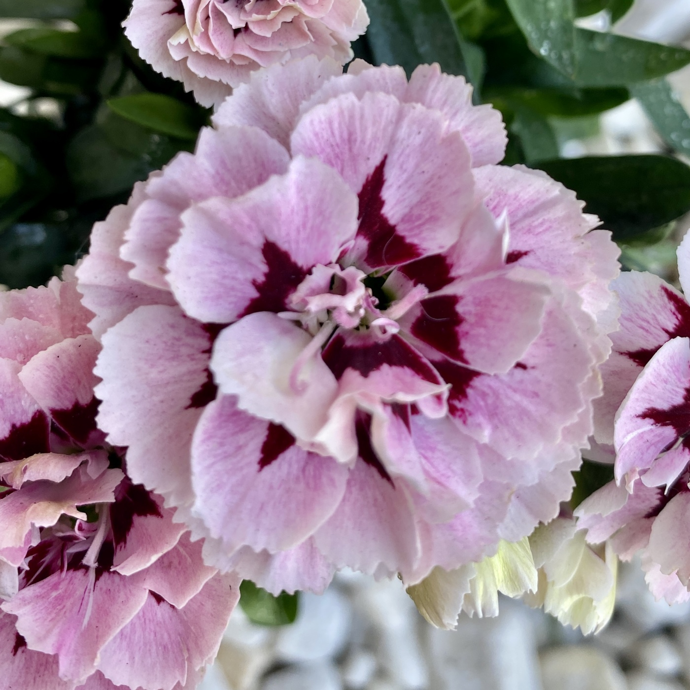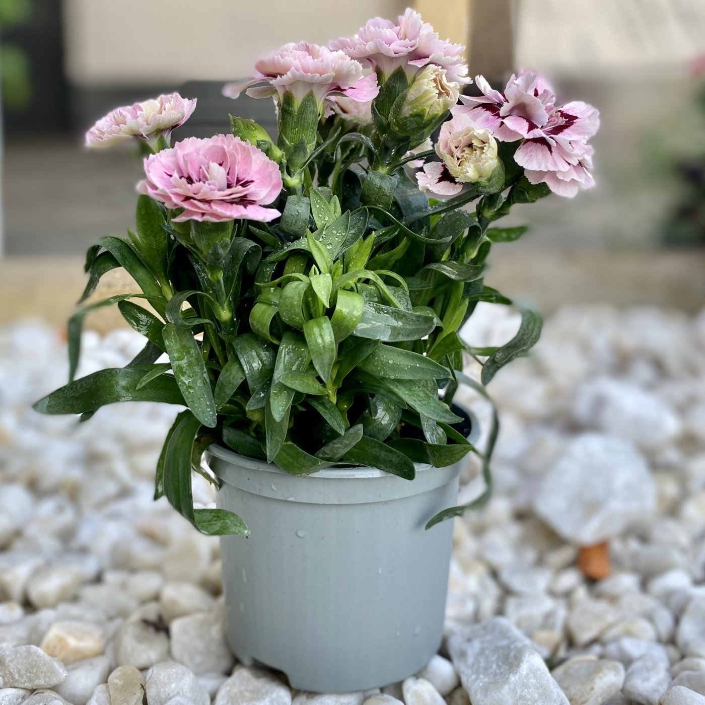 Гвоздика Шабо розовая с фиолетовыми прожилками в горшке.