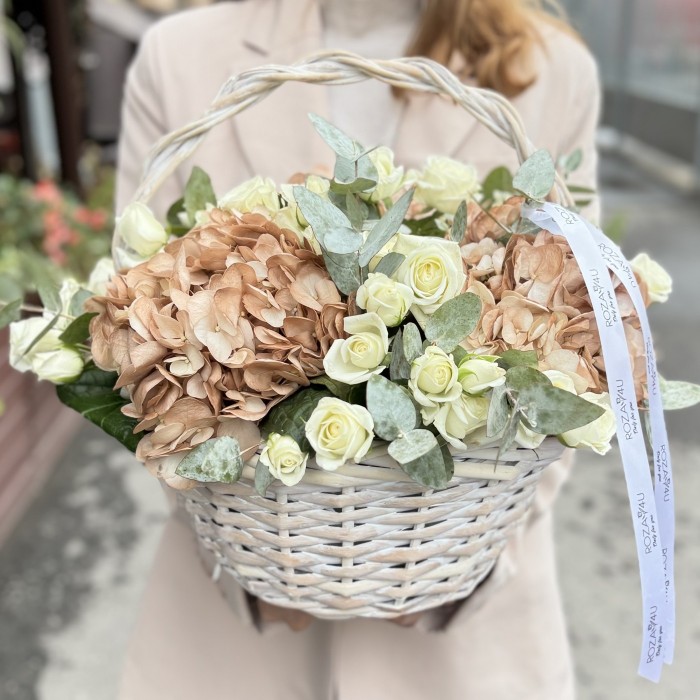 Объемная композиция в корзине из шикарной гортензией цвета капучино и белой кустовой розой – лучший способ произвести впечатление на получателя. Можете не сомневаться, что ваш подарок будет самым запоминающимся! Дарить гортензии можно абсолютно по любым случаям. Это может быть как неожиданный подарок любимой женщине, так и шикарная композиция к свадьбе или юбилею.