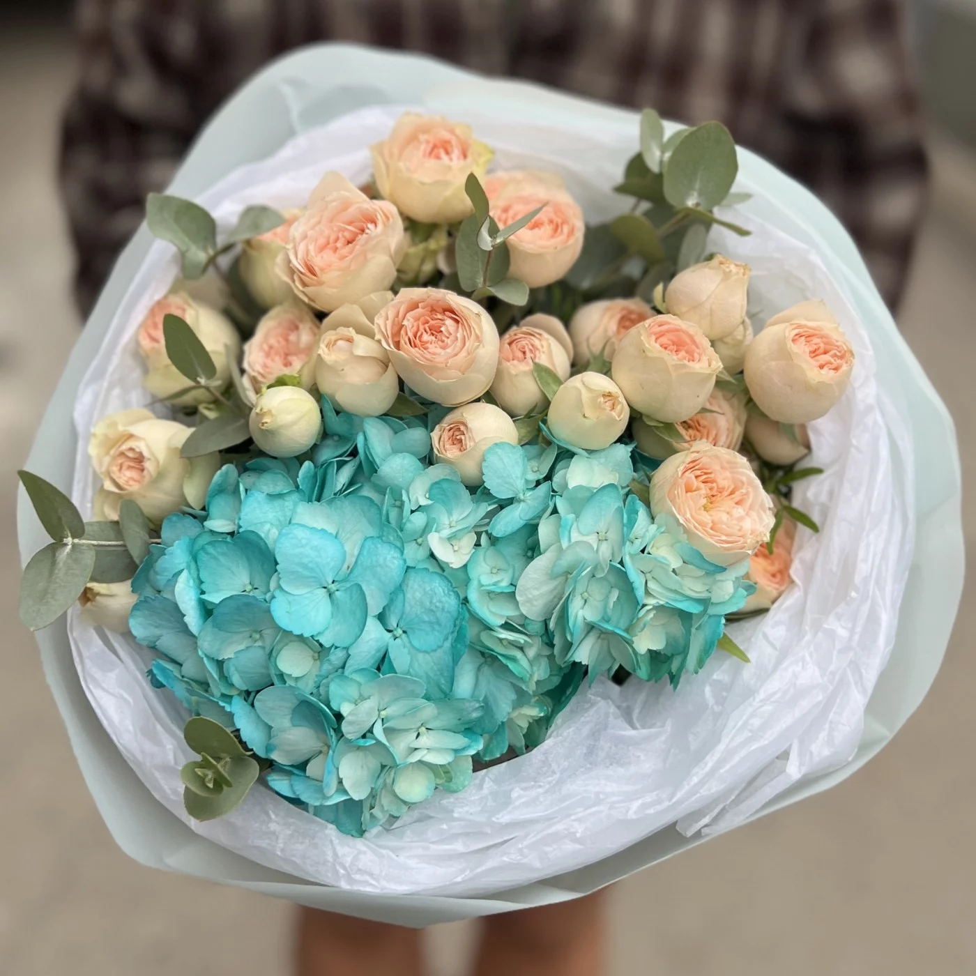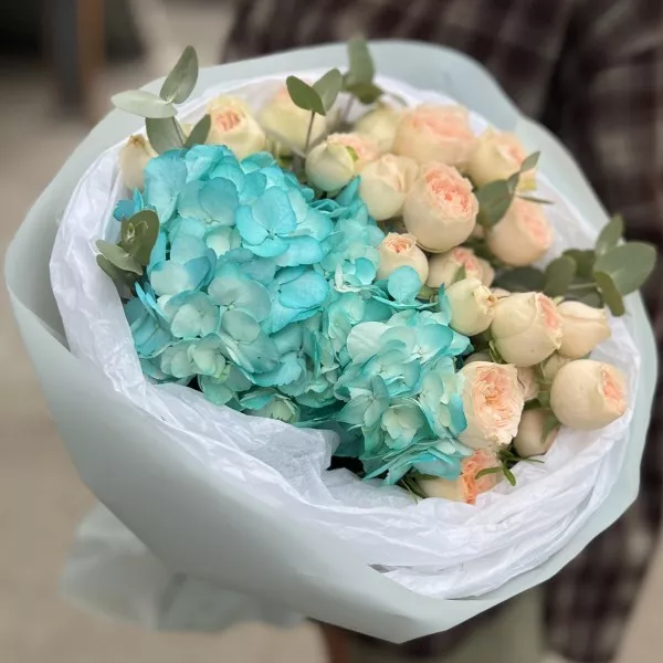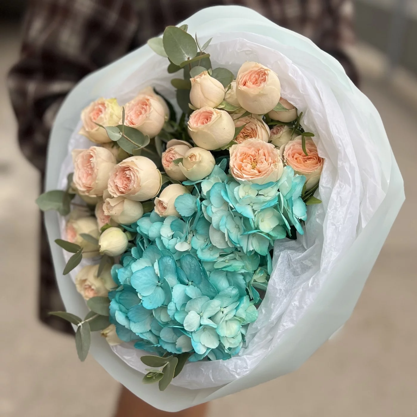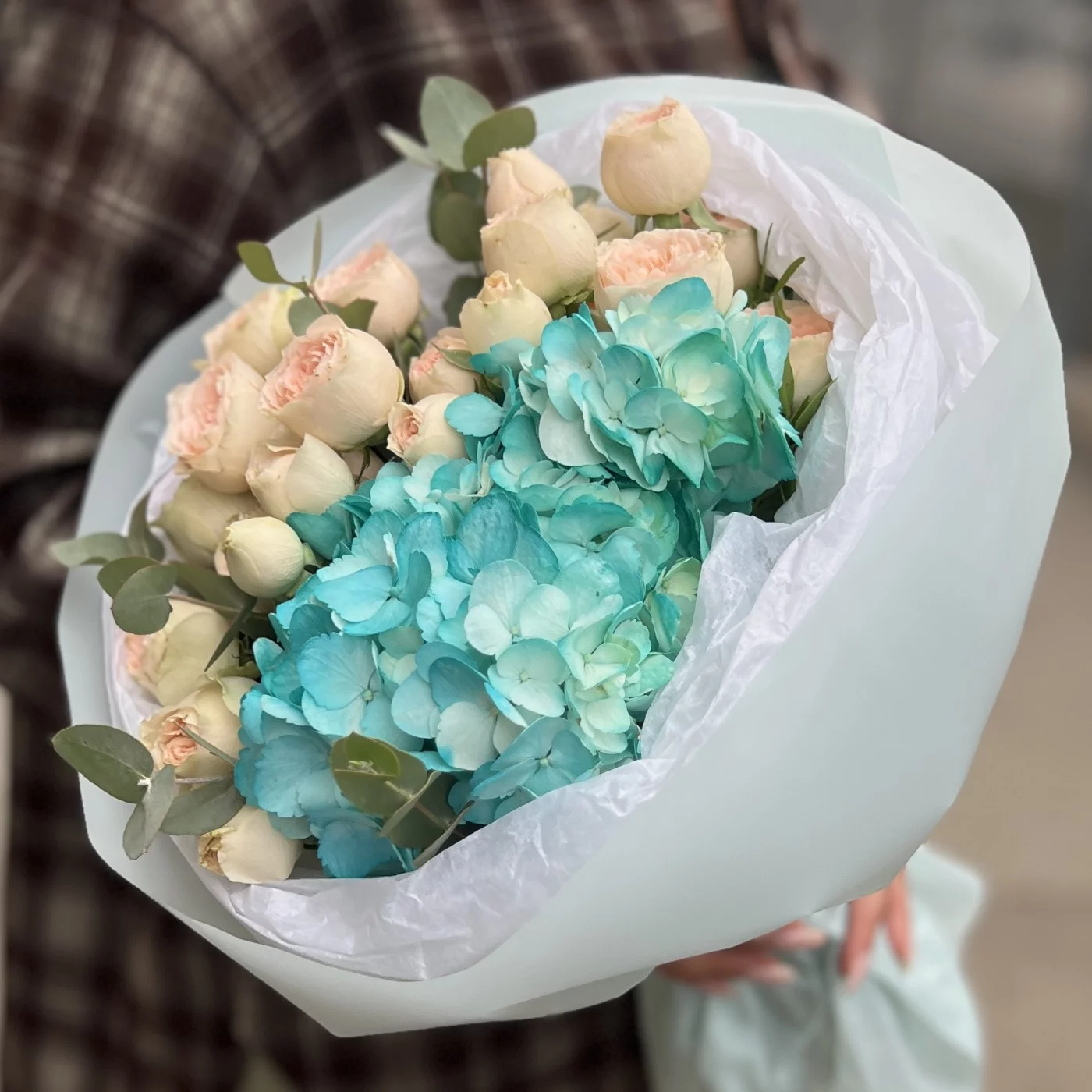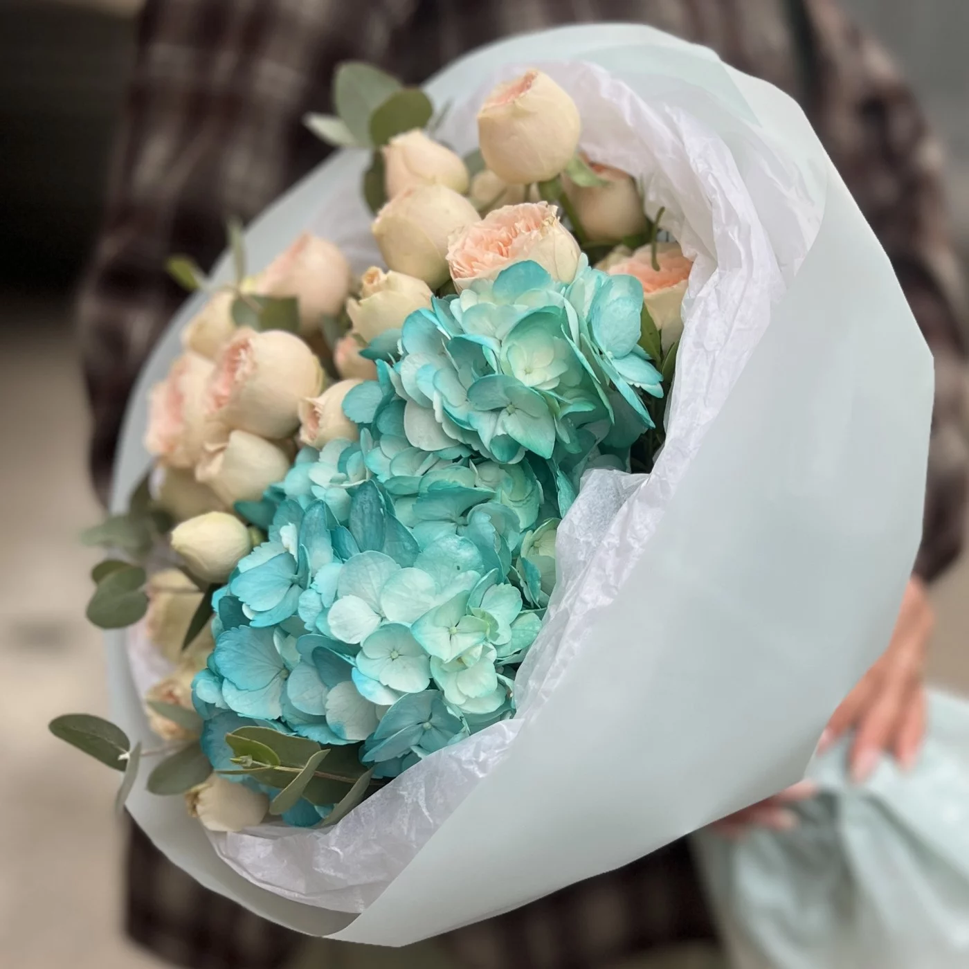 Этот изысканный букет сочетает в себе мягкую пышность гортензии и нежную элегантность кустовых роз, создавая утонченную и воздушную композицию.