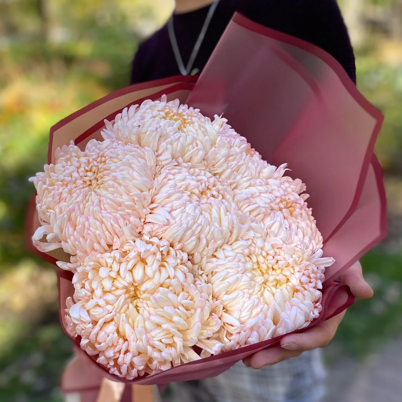 Букет из махровых кремовых крымских хризантем. Такой букет можно подарить на День Рождения или в знак внимания.