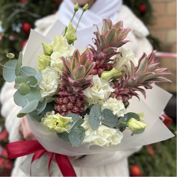 Интерьерный букет, в состав которого входят ананасы и эустома, представляет собой эффектную и оригинальную композицию, способную стать ярким акцентом в любом пространстве. Эта необычная пара сочетает экзотические, сочные оттенки с нежной красотой цветущих растений.