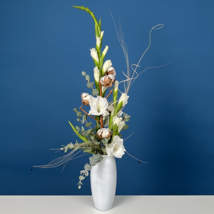 Элегантная композиция, гармонично сочетающая мягкость хлопка и изящество гладиолусов. Этот букет привнесёт в ваш интерьер атмосферу уюта и легкости, станет стильным акцентом и подчеркнёт вашу заботу о деталях и эстетике пространства.