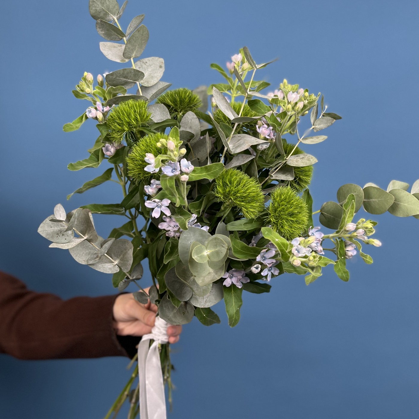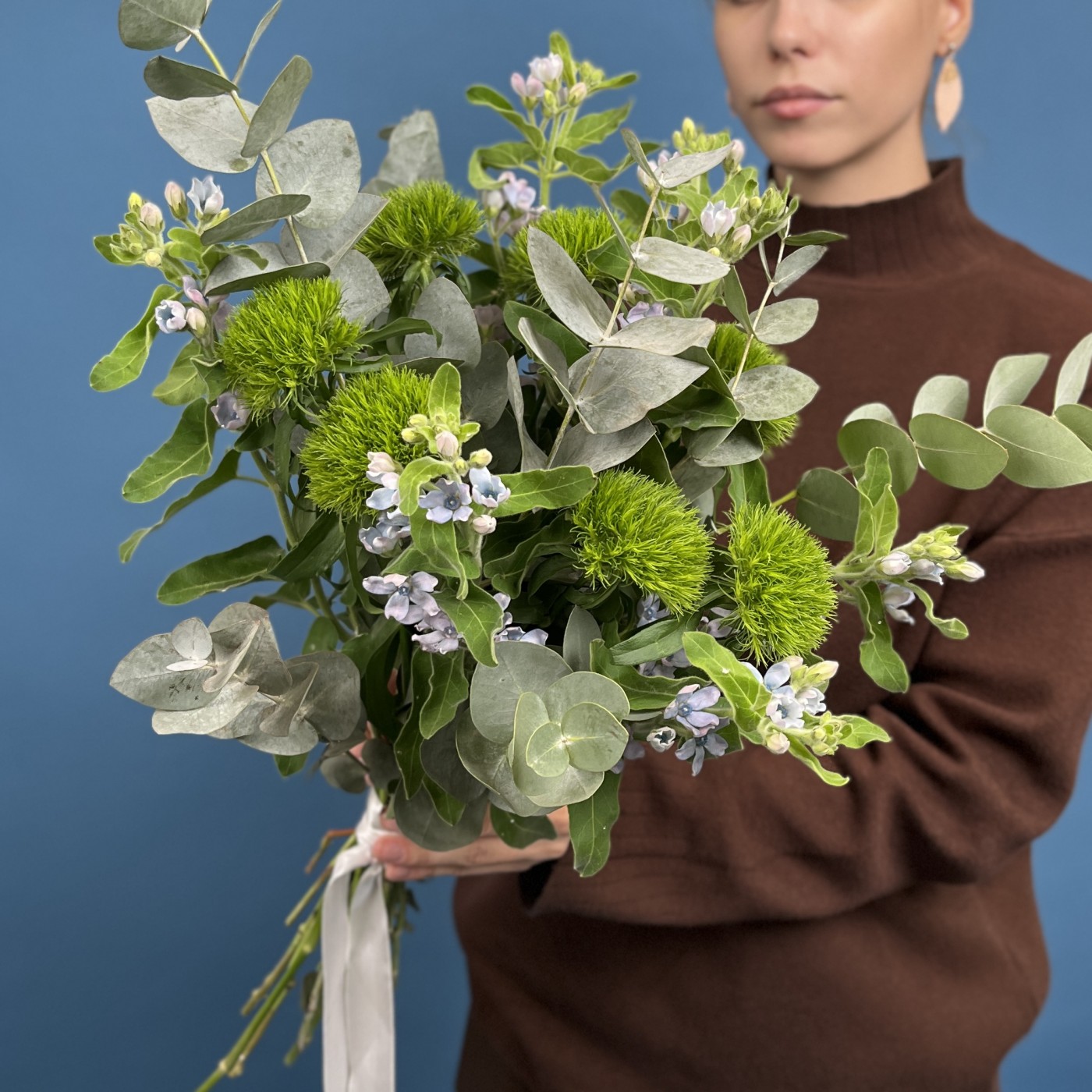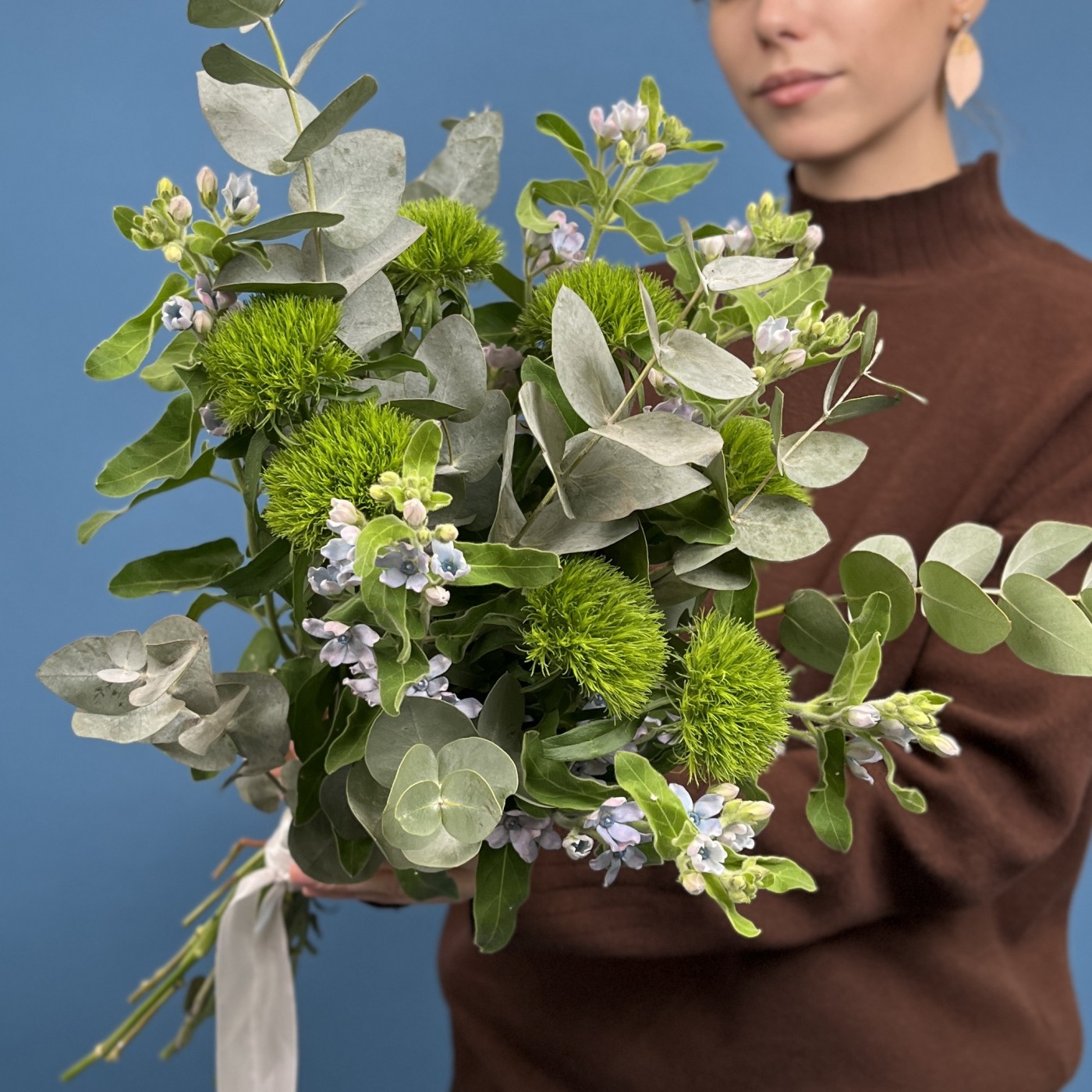 Букет "Свежесть утра" — это элегантная и освежающая композиция, вдохновленная утренней росой и природной чистотой. Он идеально подходит для создания уютной атмосферы в доме, офисе или гостиной, добавляя нотку свежести и спокойствия. Композиция подчеркивает минимализм и натуральность, с акцентом на зеленые и белые тона, символизирующие возрождение и гармонию.