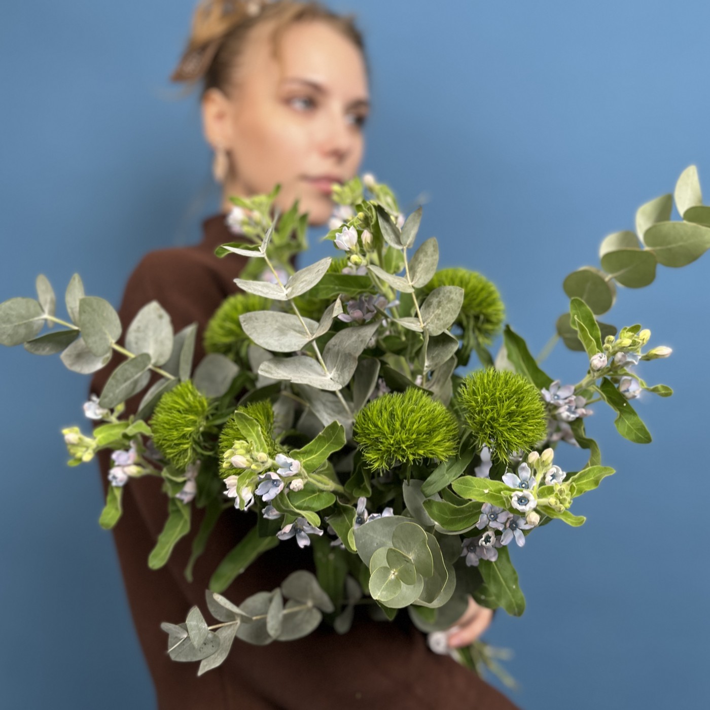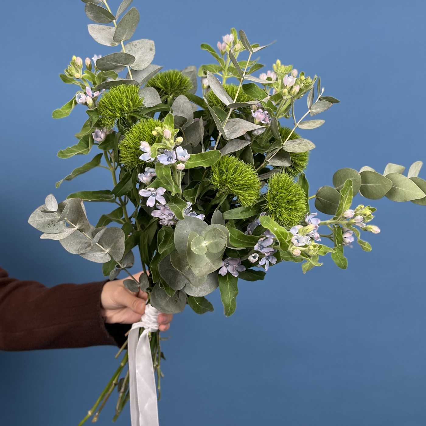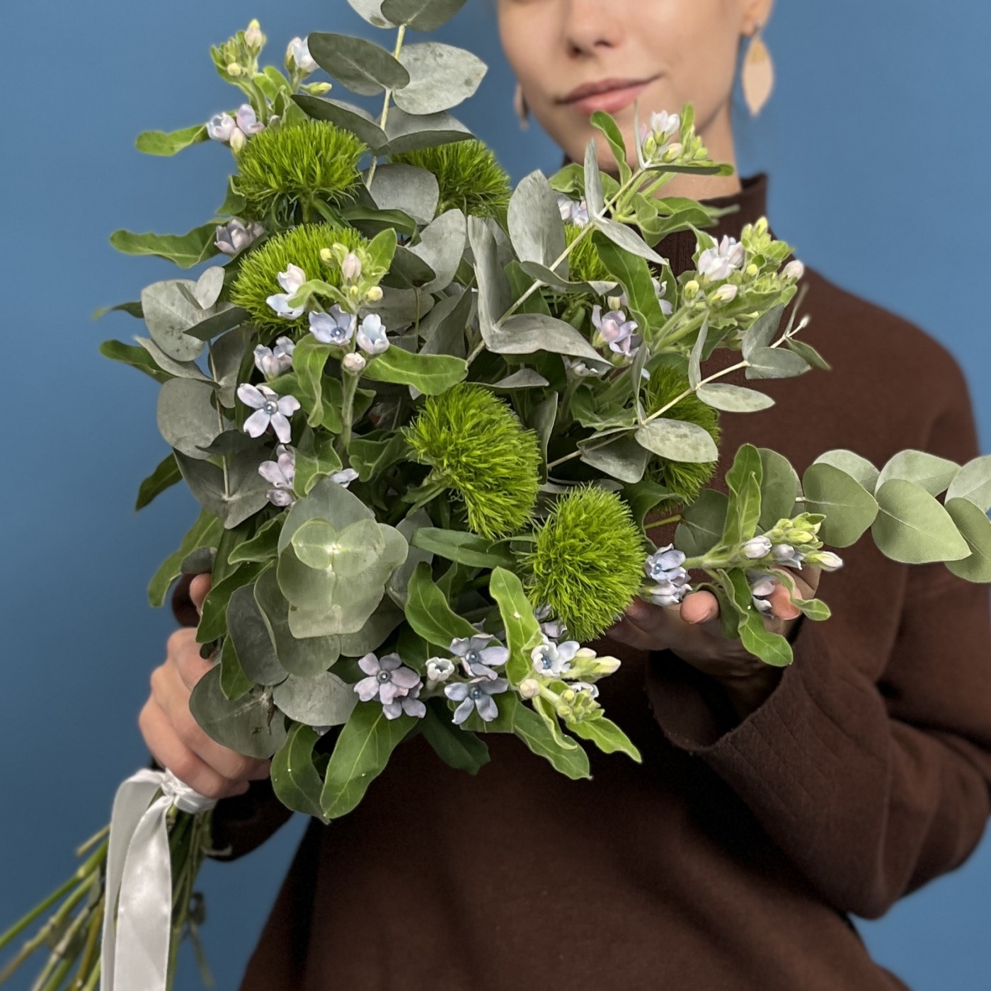 Букет "Свежесть утра" — это элегантная и освежающая композиция, вдохновленная утренней росой и природной чистотой. Он идеально подходит для создания уютной атмосферы в доме, офисе или гостиной, добавляя нотку свежести и спокойствия. Композиция подчеркивает минимализм и натуральность, с акцентом на зеленые и белые тона, символизирующие возрождение и гармонию.