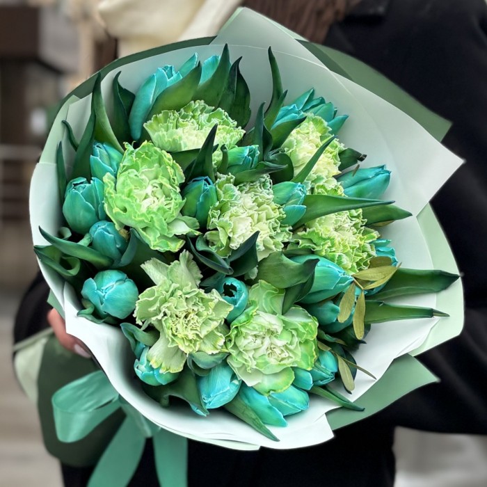 Оригинальный сборный букет из изумрудных тюльпанов и гвоздик. Такой букет можно преподнести как мужчине, так и женщине в качестве дополнения к основному подарку.