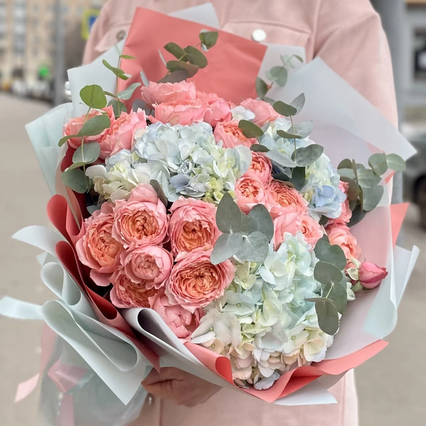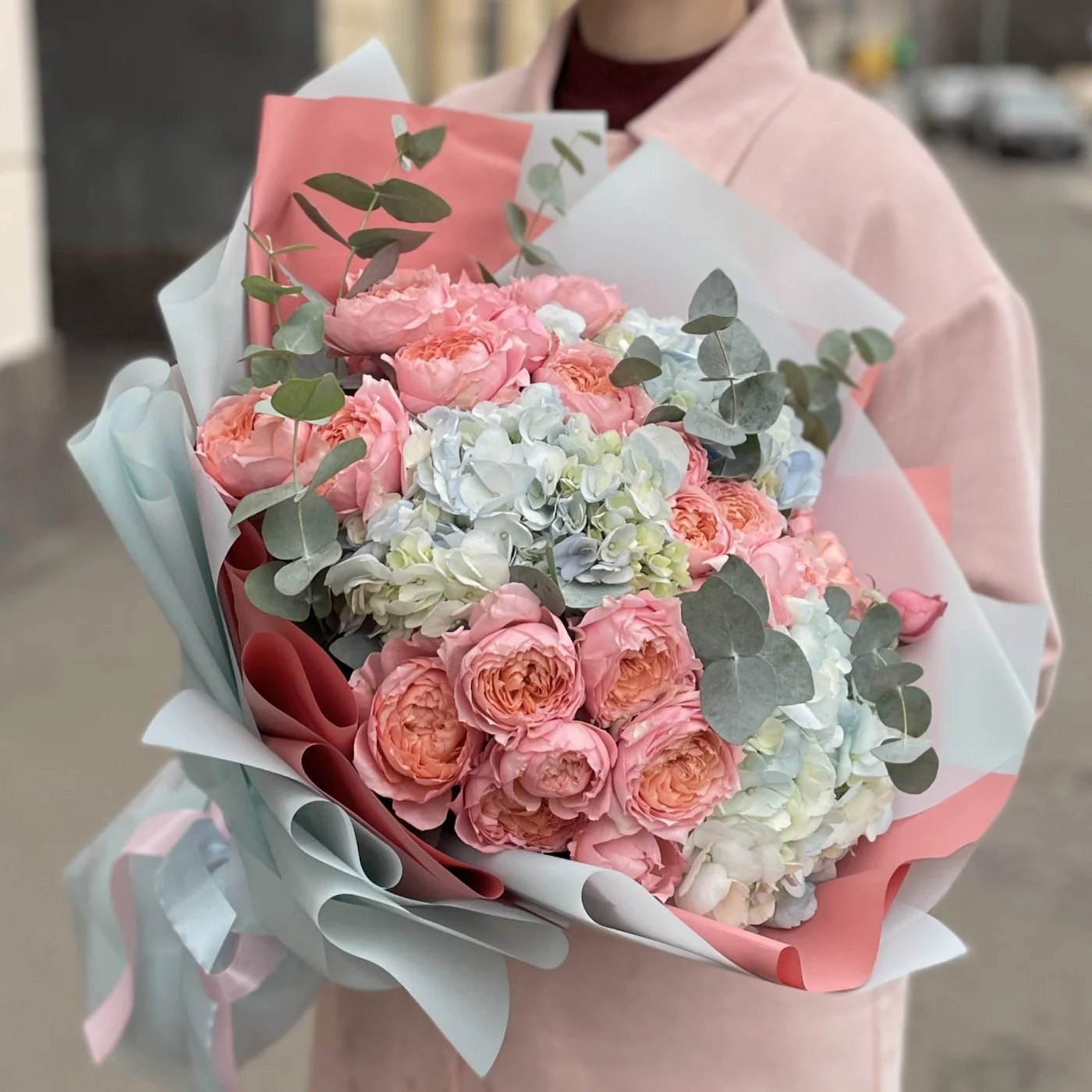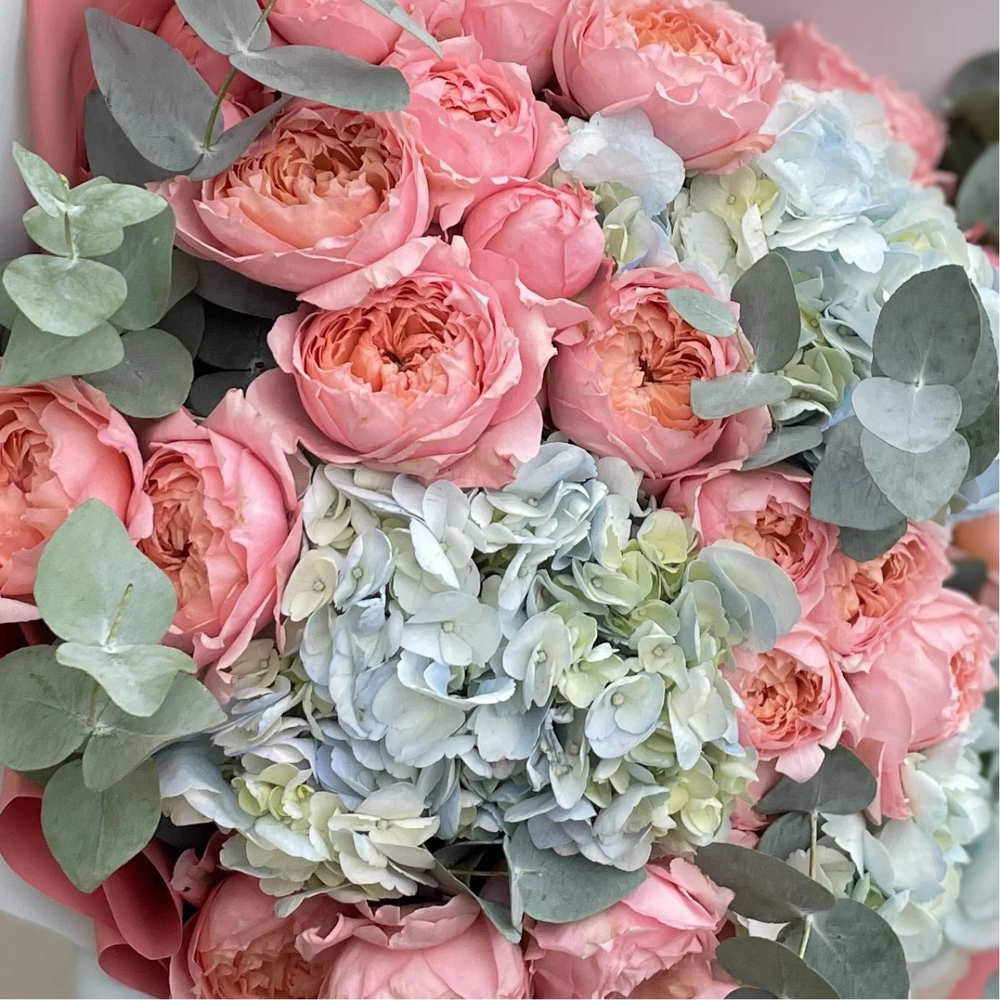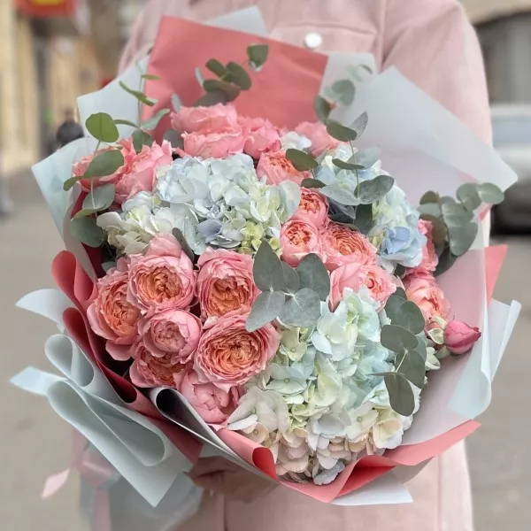 Трио-букет из великолепных пионовидных роз Джульетта, душистого эвкалипта и пушистых голубых гортензий.