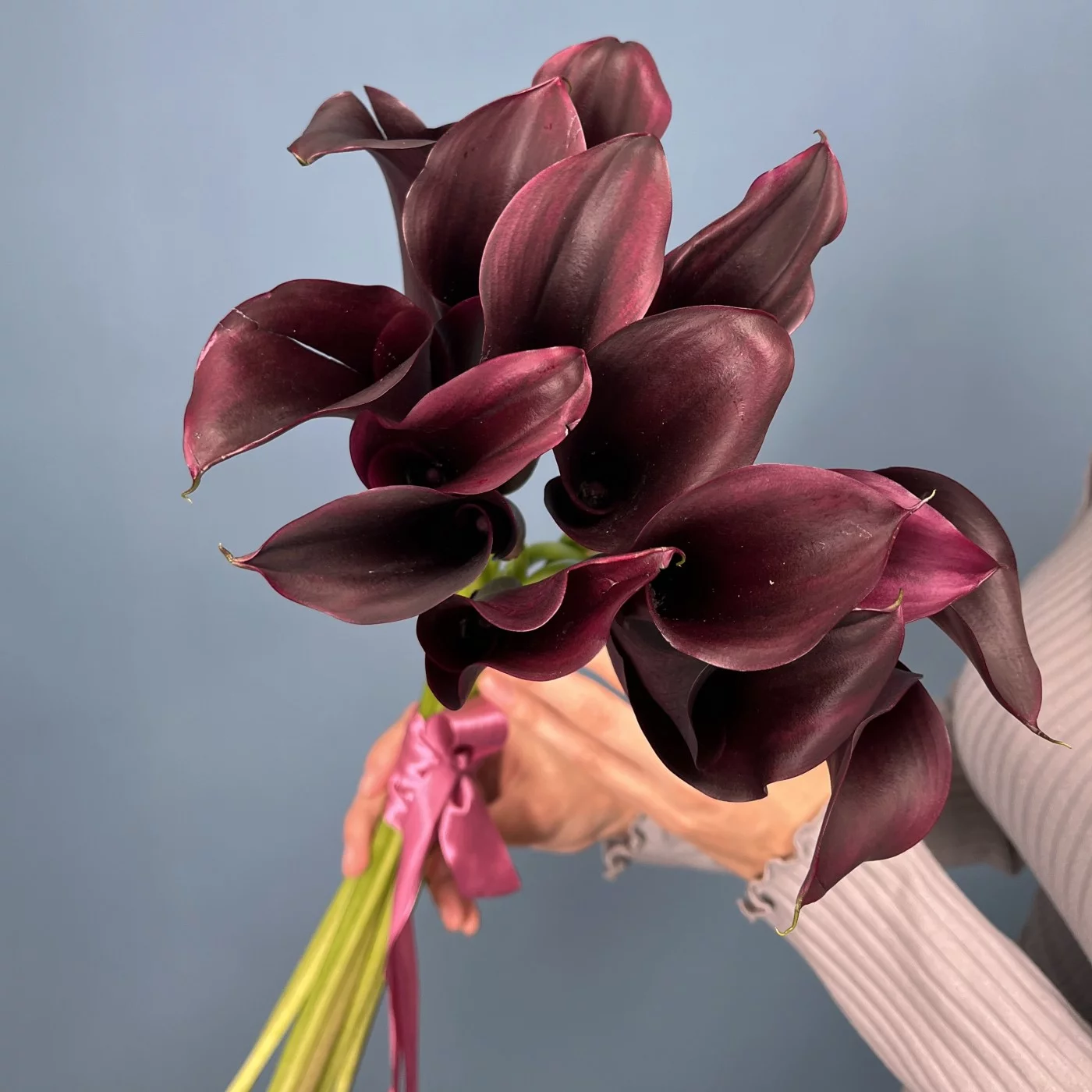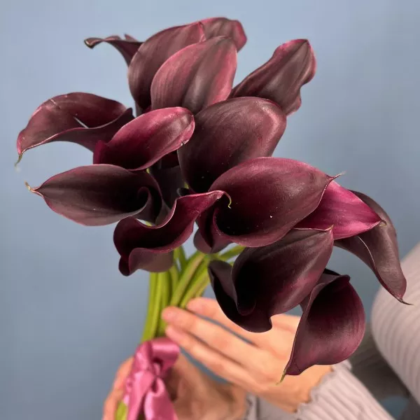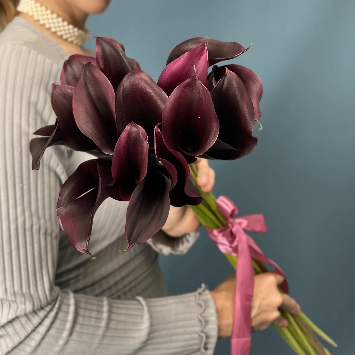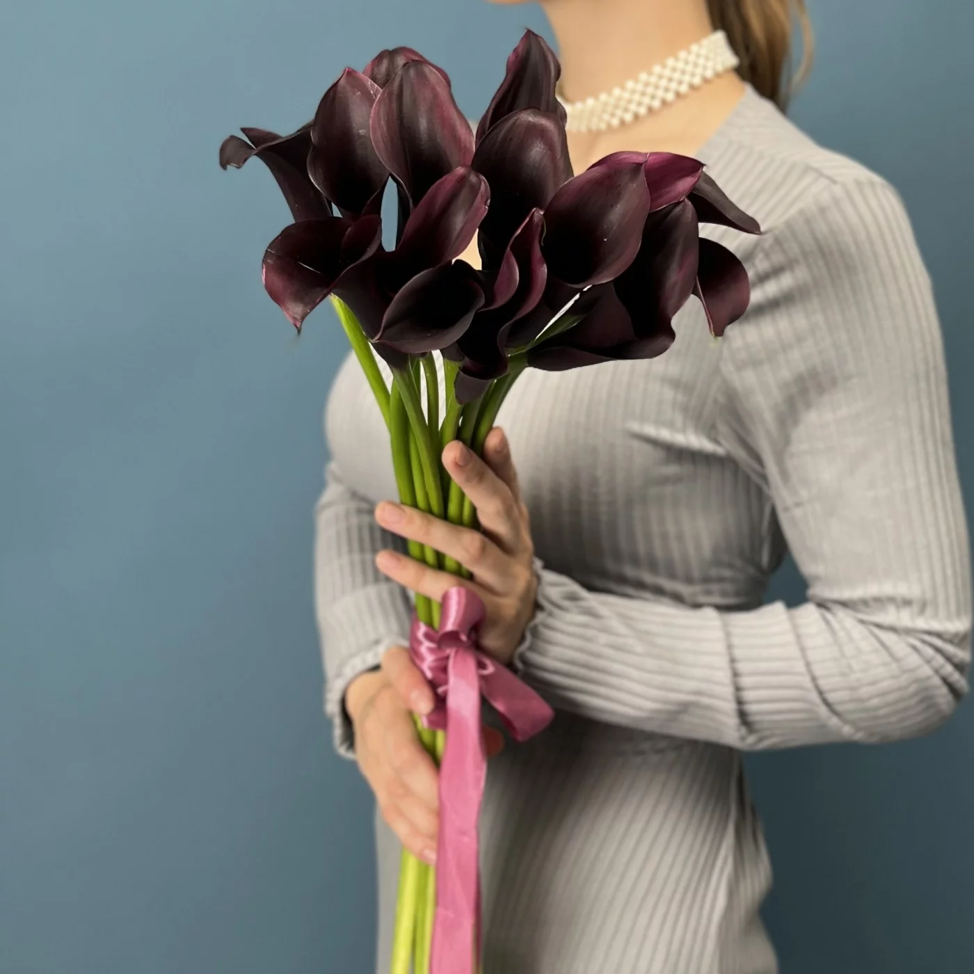 На фотографии представлен букет из 15 калл фиолетового цвета.
