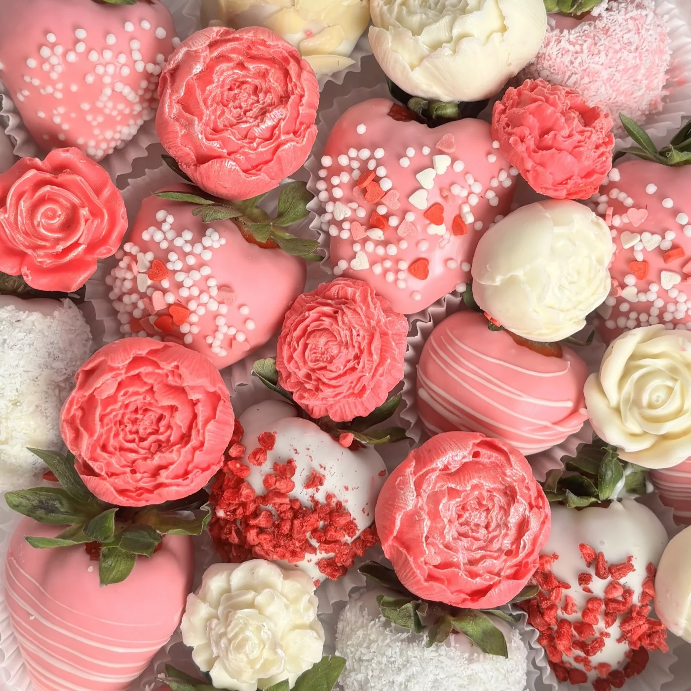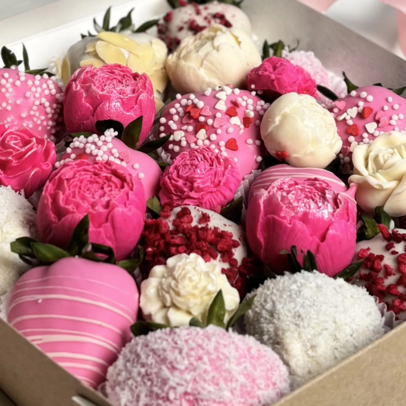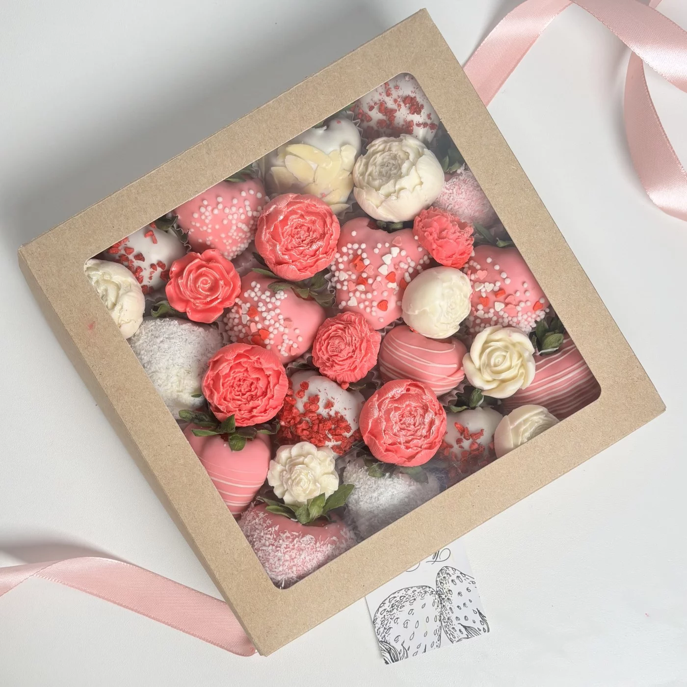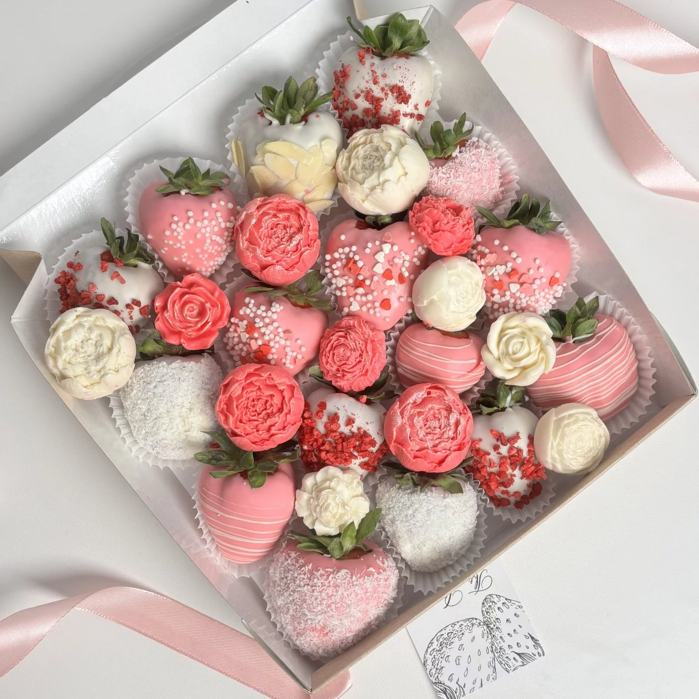 150грНежный и вкусный набор из клубники в белом бельгийском шоколаде украшенные цветами из шоколада ручной работы.