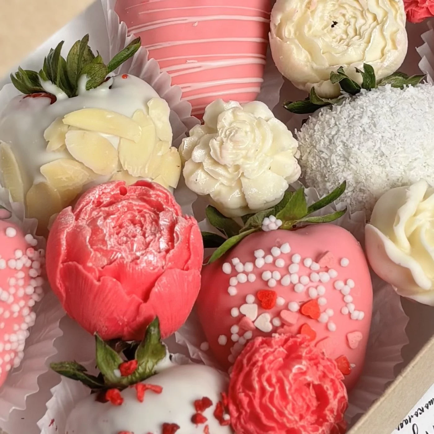 150грНежный набор из клубники в белом бельгийском шоколаде с цветами из шоколада ручной работы. Приятный сюрприз на день рождения.