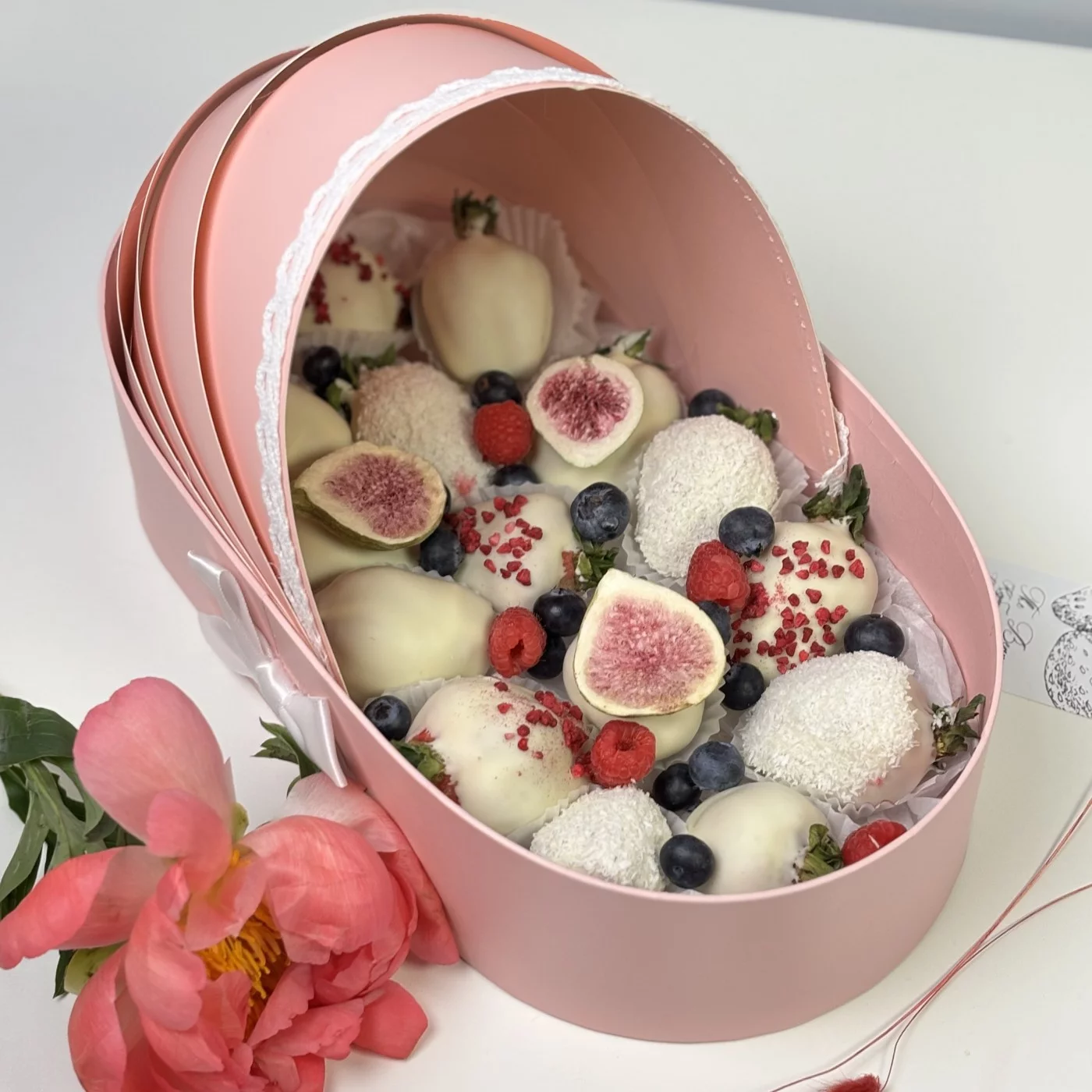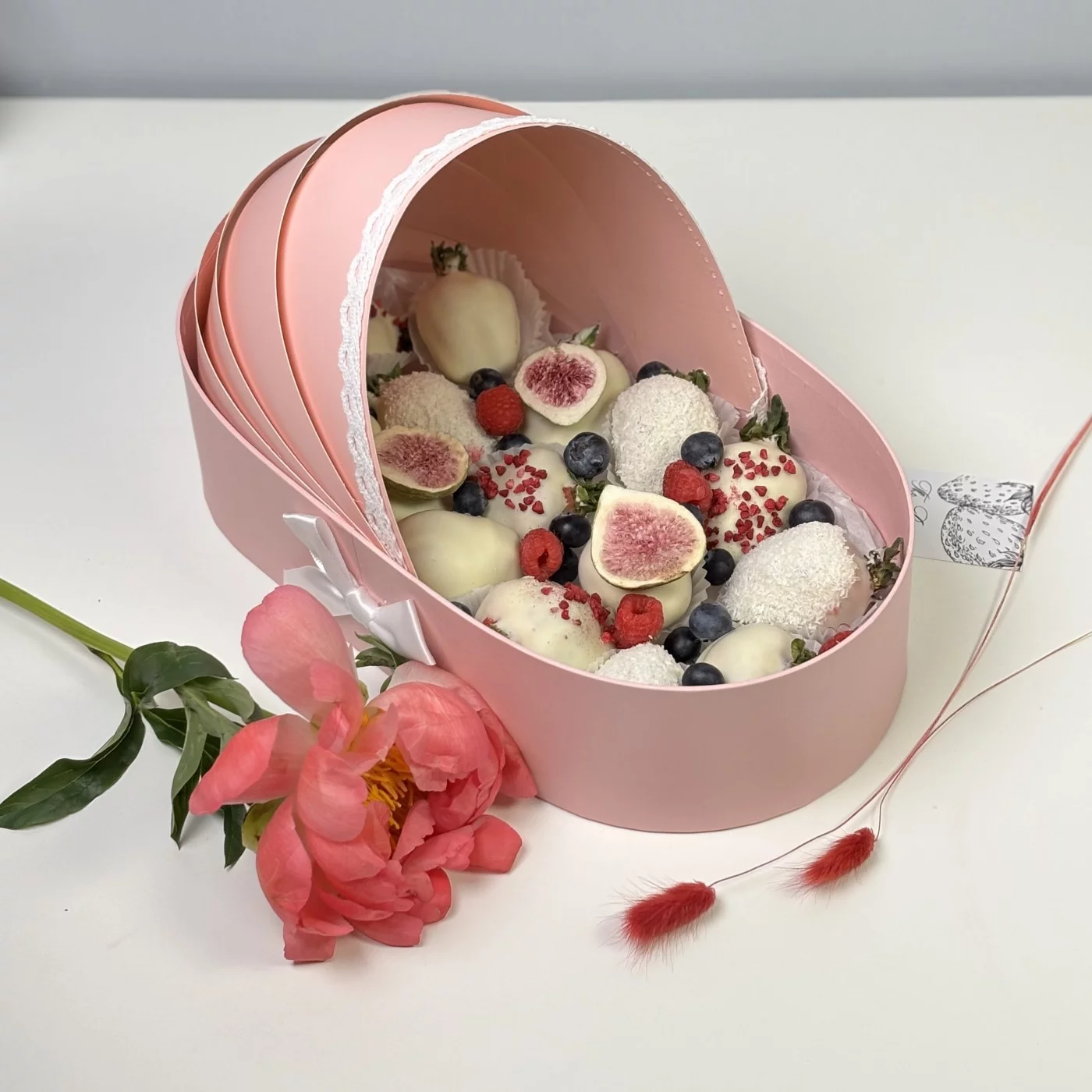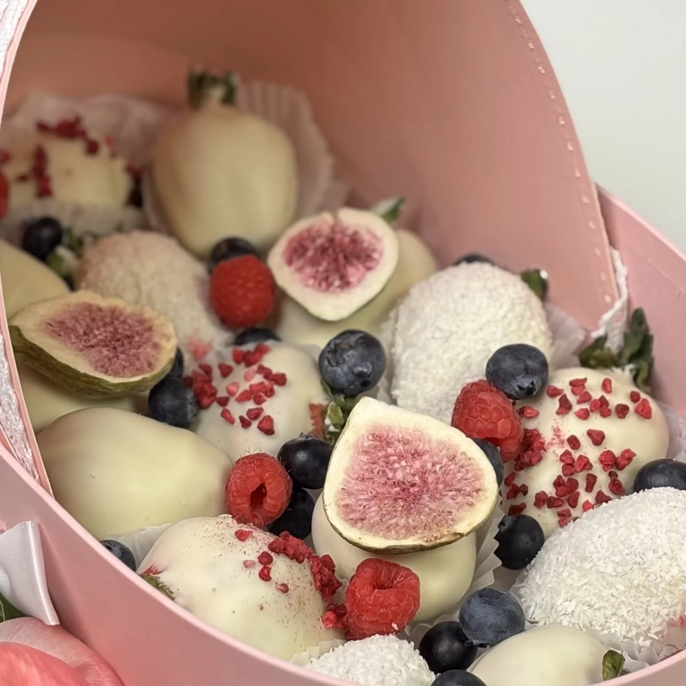 Клубника в шоколаде для девочки. Клубника в белом бельгийском шоколаде, украшенная сублимированным инжиром, посыпанные ягоды малиной и кокосовой стружкой. Вкусный и очень красивый набор для дочки или любимой.