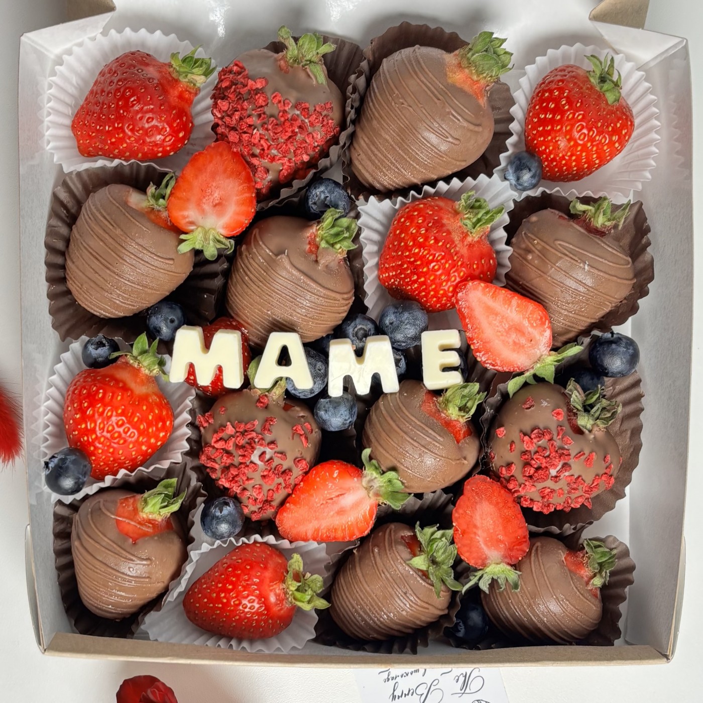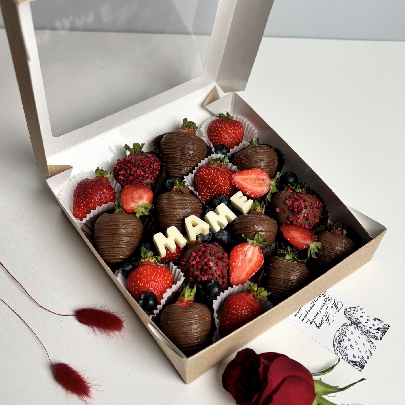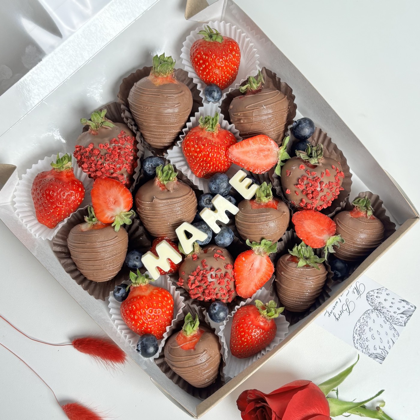150грбольшой набор из клубники в шоколаде с голубикой для мамы. Прекрасный подарок для тех кто хочет удивить.